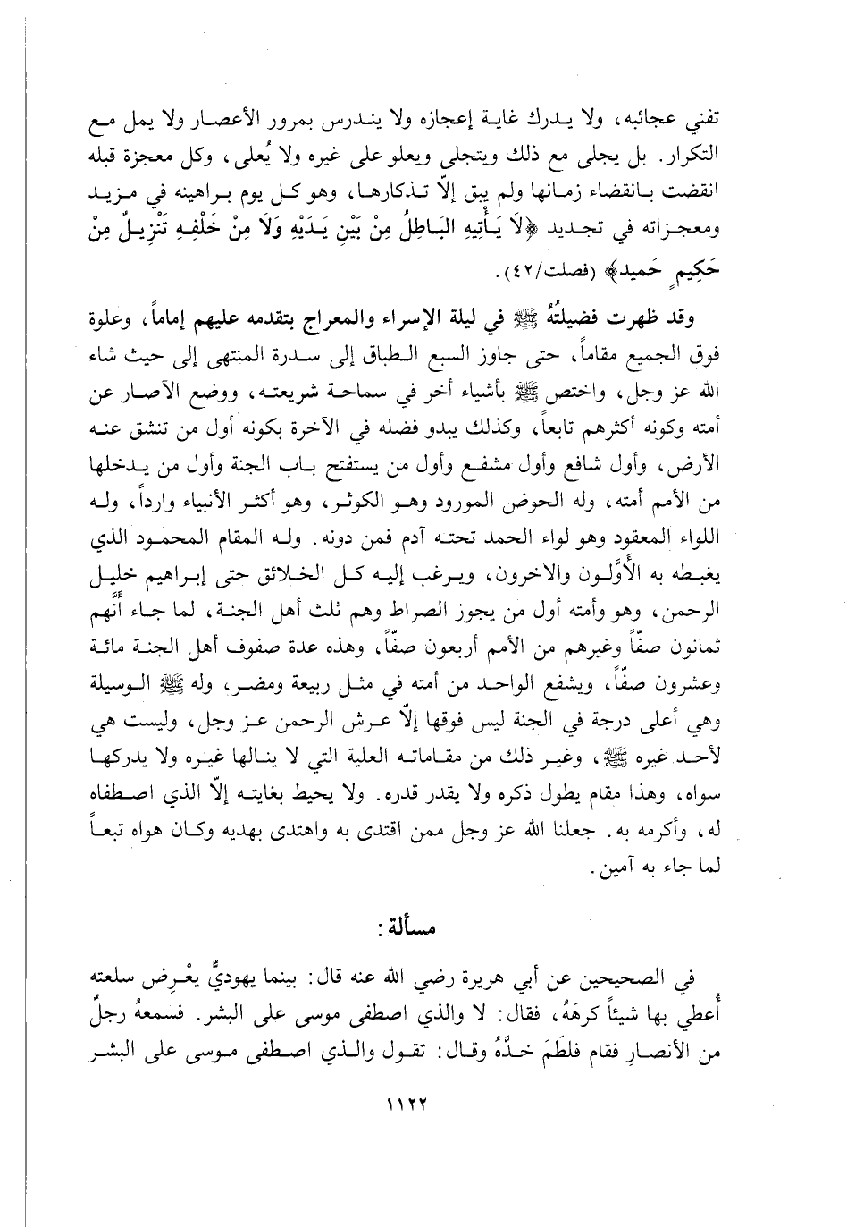 وَقَدْ ظَهَرَتْ فَضِيلَتُهُ -صَلَّى اللَّهُ عَلَيْهِ وَسَلَّمَ- فِي لَيْلَةِ الْإِسْرَاءِ وَالْمِعْرَاجِ بِتَقَدُّمِهِ عَلَيْهِمْ إِمَامًا, وَعُلُوِّهِ فَوْقَ الْجَمِيعِ مَقَامًا حَتَّى جَاوَزَ السَّبْعَ الطِّبَاقَ إِلَى سِدْرَةِ الْمُنْتَهَى إِلَى حَيْثُ شَاءَ اللَّهُ عَزَّ وَجَلَّ, وَاخْتُصَّ -صَلَّى اللَّهُ عَلَيْهِ وَسَلَّمَ- بِأَشْيَاءَ أُخَرَ فِي سَمَاحَةِ شَرِيعَتِهِ, وَوَضْعِ الْآصَارِ عَنْ أُمَّتِهِ وَكَوْنِهِ أَكْثَرَهُمْ تَابِعًا, وَكَذَلِكَ يَبْدُو فَضْلُهُ فِي الْآخِرَةِ بِكَوْنِهِ أَوَّلَ مَنْ تَنْشَقُّ عَنْهُ الْأَرْضُ, وَأَوَّلَ شَافِعٍ وَأَوَّلَ مُشَفَّعٍ وَأَوَّلَ مَنْ يَسْتَفْتِحُ بَابَ الْجَنَّةِ وَأَوَّلَ مَنْ يَدْخُلُهَا مِنَ الْأُمَمِ أُمَّتُهُ, وَلَهُ الْحَوْضُ الْمَوْرُودُ وَهُوَ الْكَوْثَرُ, وَهُوَ أَكْثَرُ الْأَنْبِيَاءِ وَارِدًا, وَلَهُ اللِّوَاءُ الْمَعْقُودُ وَهُوَ لِوَاءُ الْحَمْدِ تَحْتَهُ آدَمَ فَمَنْ دُونَهُ. وَلَهُ الْمَقَامُ الْمَحْمُودُ الَّذِي يَغْبِطُهُ بِهِ الْأَوَّلُونَ وَالْآخِرُونَ, وَيَرْغَبُ إِلَيْهِ كُلُّ الْخَلَائِقِ حَتَّى إِبْرَاهِيمَ خَلِيلِ الرَّحْمَنِ, وَهُوَ وَأُمَّتُهُ أَوَّلُ مَنْ يَجُوزُ الصِّرَاطَ وَهُمْ ثُلْثُ أَهْلِ الْجَنَّةِ؛ لِمَا جَاءَ أَنَّهُمْ ثَمَانُونَ صَفًّا وَغَيْرُهُمْ مِنَ الْأُمَمِ أَرْبَعُونَ صَفًّا, وَهَذِهِ عِدَّةُ صُفُوفِ أَهْلِ الْجَنَّةِ مِائَةٌ وَعِشْرُونَ صَفًّا, وَيَشْفَعُ الْوَاحِدُ مِنْ أُمَّتِهِ فِي مِثْلِ رَبِيعَةَ وَمُضَرَ, وَلَهُ -صَلَّى اللَّهُ عَلَيْهِ وَسَلَّمَ- الْوَسِيلَةُ وَهِيَ أَعْلَى دَرَجَةٍ فِي الْجَنَّةِ لَيْسَ فَوْقَهَا إِلَّا عَرْشُ الرَّحْمَنِ عَزَّ وَجَلَّ, وَلَيْسَتْ هِيَ لِأَحَدٍ غَيْرَهُ -صَلَّى اللَّهُ عَلَيْهِ وَسَلَّمَ- وَغَيْرُ ذَلِكَ مِنْ مَقَامَاتِهِ الْعَلِيَّةِ الَّتِي لَا يَنَالُهَا غَيْرُهُ وَلَا يُدْرِكُهَا سِوَاهُ, وَهَذَا مَقَامٌ يَطُولُ ذكره ولا يقدر قدره. وَلَا يُحِيطُ بِغَايَتِهِ إِلَّا الَّذِي اصْطَفَاهُ لَهُ, وَأَكْرَمَهُ بِهِ. جَعَلَنَا اللَّهُ عَزَّ وَجَلَّ مِمَّنِ اقْتَدَى بِهِ وَاهْتَدَى بِهَدْيِهِ وَكَانَ هَوَاهُ تَبَعًا لِمَا جَاءَ بِهِ آمِينَ.