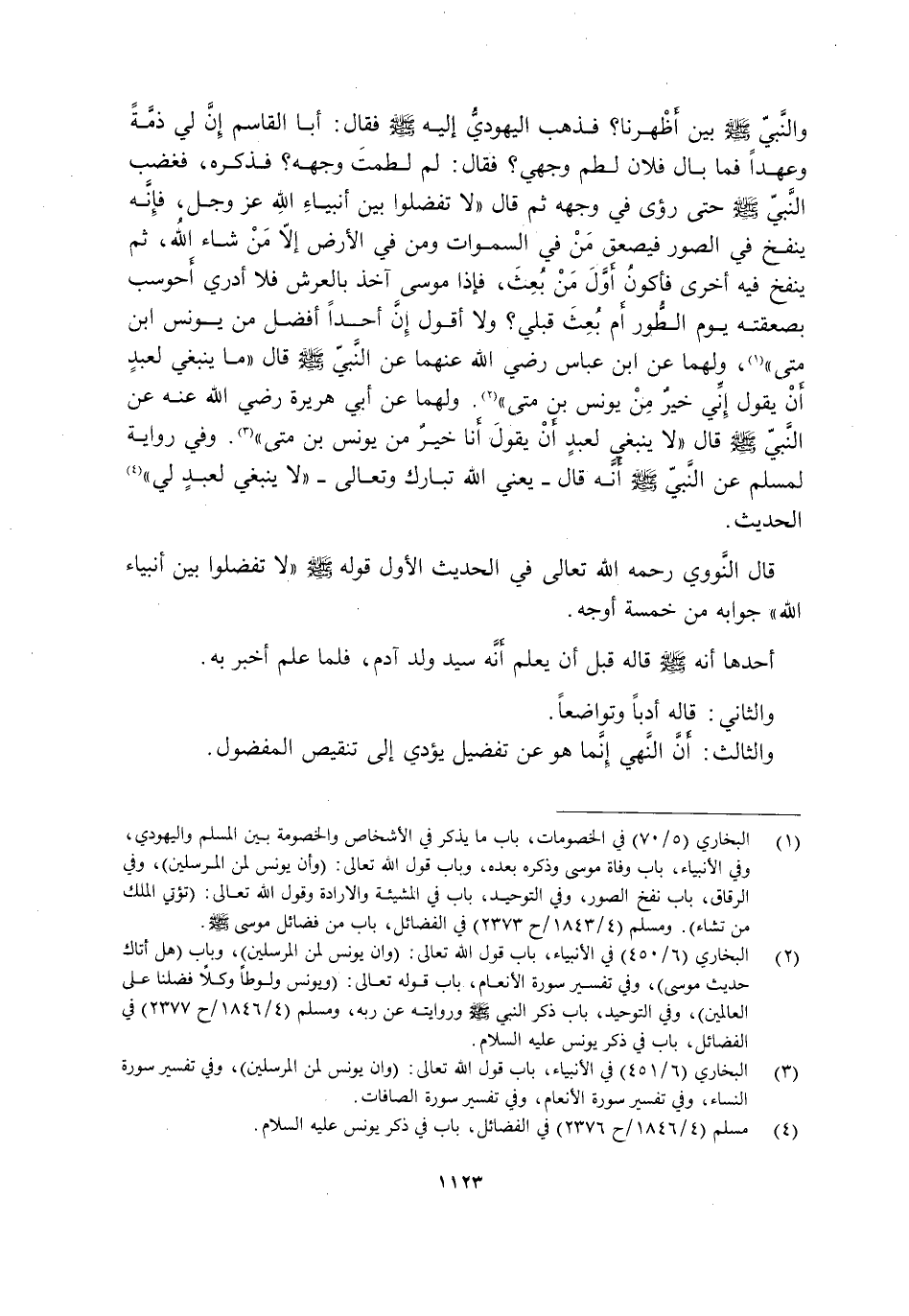 قَالَ النَّوَوِيُّ رَحِمَهُ اللَّهُ تَعَالَى فِي الْحَدِيثِ الْأَوَّلِ قَوْلُهُ, صَلَّى اللَّهُ عَلَيْهِ وَسَلَّمَ: "لَا تُفَضِّلُوا بَيْنَ أَنْبِيَاءِ اللَّهِ" جَوَابُهُ مِنْ خَمْسَةِ أَوْجُهٍ.
