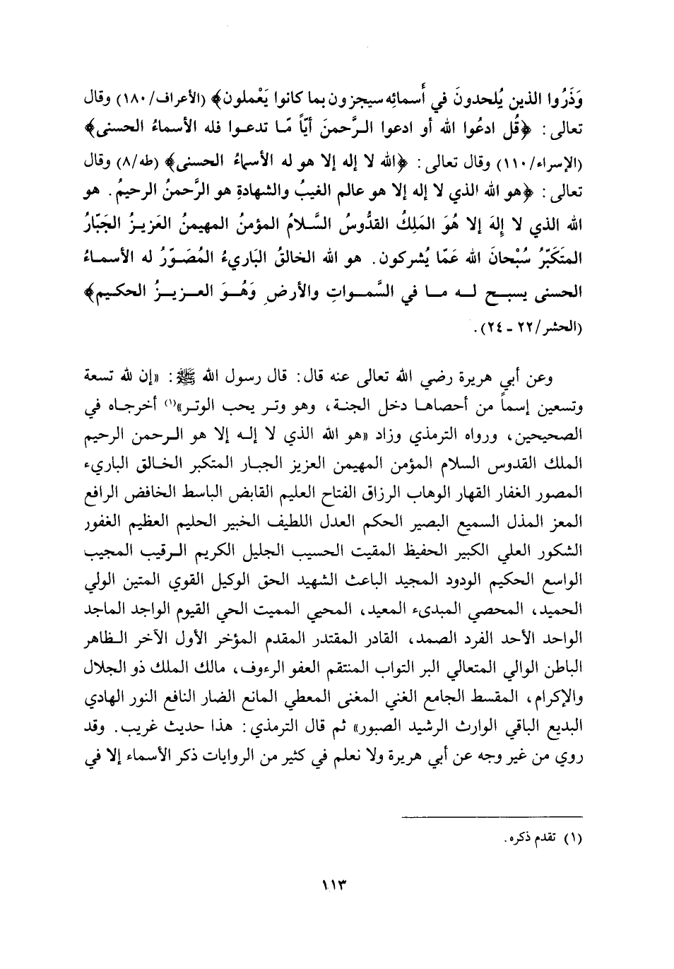 وَعَنْ أَبِي هُرَيْرَةَ رَضِيَ اللَّهُ تَعَالَى عَنْهُ قَالَ: قَالَ رَسُولُ اللَّهِ صَلَّى اللَّهُ عَلَيْهِ وَسَلَّمَ: "إِنَّ لِلَّهِ تِسْعَةً وَتِسْعِينَ اسْمًا مَنْ أَحْصَاهَا دَخَلَ الْجَنَّةَ وَهُوَ وِتْرٌ ويحب الْوِتْرَ"1 أَخْرَجَاهُ فِي الصَّحِيحَيْنِ وَرَوَاهُ التِّرْمِذِيُّ وَزَادَ "هُوَ اللَّهُ الَّذِي لَا إِلَهَ إِلَّا هُوَ الرَّحْمَنُ الرَّحِيمُ الْمَلِكُ الْقُدُّوسُ السَّلَامُ الْمُؤْمِنُ الْمُهَيْمِنُ الْعَزِيزُ الْجَبَّارُ الْمُتَكَبِّرُ الْخَالِقُ الْبَارِئُ الْمُصَوِّرُ الْغَفَّارُ الْقَهَّارُ الْوَهَّابُ الرَّزَّاقُ الْفَتَّاحُ الْعَلِيمُ الْقَابِضُ الْبَاسِطُ الْخَافِضُ الرَّافِعُ الْمُعِزُّ الْمُذِلُّ السَّمِيعُ الْبَصِيرُ الْحَكَمُ الْعَدْلُ اللَّطِيفُ الْخَبِيرُ الْحَلِيمُ الْعَظِيمُ الْغَفُورُ الشَّكُورُ الْعَلِيُّ الْكَبِيرُ الْحَفِيظُ الْمُقِيتُ الْحَسِيبُ الْجَلِيلُ الْكَرِيمُ الرَّقِيبُ الْمُجِيبُ الْوَاسِعُ الْحَكِيمُ الْوَدُودُ الْمَجِيدُ الْبَاعِثُ الشَّهِيدُ الْحَقُّ الْوَكِيلُ الْقَوِيُّ الْمَتِينُ الْوَلِيُّ الْحَمِيدُ الْمُحْصِيُ الْمُبْدِئُ الْمُعِيدُ الْمُحْيِيُ الْمُمِيتُ الْحَيُّ الْقَيُّومُ الْوَاجِدُ الْمَاجِدُ الْوَاحِدُ الْأَحَدُ الْفَرْدُ الصَّمَدُ الْقَادِرُ الْمُقْتَدِرُ الْمُقَدِّمُ الْمُؤَخِّرُ الْأَوَّلُ الْآخِرُ الظَّاهِرُ الباطن الوالي الم تعالى الْبَرُّ التَّوَّابُ الْمُنْتَقِمُ الْعَفُوُّ الرَّءُوفُ مَالِكُ الْمُلْكِ ذُو الْجَلَالِ وَالْإِكْرَامِ الْمُقْسِطُ الْجَامِعُ الْغَنِيُّ الْمُغْنِي الْمُعْطِي الْمَانِعُ الضَّارُّ النَّافِعُ النُّورُ الْهَادِي الْبَدِيعُ الْبَاقِي الْوَارِثُ الرَّشِيدُ الصَّبُورُ" ثُمَّ قَالَ التِّرْمِذِيُّ: هَذَا حَدِيثٌ غَرِيبٌ. وَقَدْ رُوِيَ مِنْ غَيْرِ وَجْهٍ عَنْ أَبِي هُرَيْرَةَ وَلَا نَعْلَمُ فِي كَثِيرٍ مِنَ الرِّوَايَاتِ ذِكْرُ الْأَسْمَاءِ إِلَّا فِي