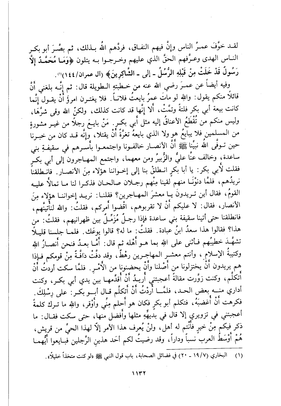 وَفِيهِ أَيْضًا عَنْ عُمَرَ رَضِيَ اللَّهُ عَنْهُ مِنْ خُطْبَتِهِ الطَّوِيلَةِ قَالَ: ثُمَّ إِنَّهُ بَلَغَنِي أَنَّ قَائِلًا مِنْكُمْ يَقُولُ: وَاللَّهِ لَوْ مَاتَ عُمَرُ بَايَعْتُ فُلَانًا. فَلَا يَغْتَرَّنَّ امْرُؤٌ أَنْ يَقُولَ إِنَّمَا كَانَتْ بَيْعَةُ أَبِي بَكْرٍ فَلْتَةً وَتَمَّتْ, أَلَا إِنَّهَا قَدْ كَانَتْ كَذَلِكَ. وَلَكِنَّ اللَّهَ وَقَى شَرَّهَا, وَلَيْسَ مِنْكُمْ مَنْ تُقْطَعُ الْأَعْنَاقُ إِلَيْهِ مِثْلُ أَبِي بَكْرٍ. مَنْ بَايَعَ رَجُلًا مِنْ غَيْرِ مَشُورَةٍ مِنَ الْمُسْلِمِينَ فَلَا يُبَايَعُ هُوَ وَلَا الَّذِي بَايَعَهُ تَغِرَّةً أَنْ يُقْتَلَا, وَإِنَّهُ قَدْ كَانَ مِنْ خَبَرِنَا حِينَ تَوَفَّى اللَّهُ نَبِيَّنَا -صَلَّى اللَّهُ عَلَيْهِ وَسَلَّمَ- أَنَّ الْأَنْصَارَ خَالَفُونَا وَاجْتَمَعُوا بِأَسْرِهِمْ فِي سَقِيفَةِ بَنِي سَاعِدَةَ وَخَالَفَ عَنَّا عَلِيٌّ وَالزُّبَيْرُ وَمَنْ مَعَهُمَا, وَاجْتَمَعَ الْمُهَاجِرُونَ إِلَى أَبِي بَكْرٍ فَقُلْتُ لِأَبِي بَكْرٍ: يَا أَبَا بَكْرٍ انْطَلِقْ بِنَا إِلَى إِخْوَانِنَا هَؤُلَاءِ مِنَ الْأَنْصَارِ, فَانْطَلَقْنَا نُرِيدُهُمْ فَلَمَّا دَنَوْنَا مِنْهُمْ لَقِيَنَا مِنْهُمْ رَجُلَانِ صَالِحَانِ فَذَكَرَا لَنَا مَا تَمَالَأَ عَلَيْهِ الْقَوْمُ, فَقَالَ: أَيْنَ تُرِيدُونَ يَا مَعْشَرَ الْمُهَاجِرِينَ؟ فَقُلْنَا: نُرِيدُ إِخْوَانَنَا هَؤُلَاءِ مِنَ الْأَنْصَارِ. فَقَالَ: لَا عَلَيْكُمْ أَنْ لَا تَقْرَبُوهُمْ, اقْضُوا أَمْرَكُمْ, فَقُلْتُ: وَاللَّهِ لَنَأْتِيَنَّهُمْ, فَانْطَلَقْنَا حَتَّى أَتَيْنَا سَقِيفَةَ بَنِي سَاعِدَةَ فَإِذَا رَجُلٌ مُزَمَّلٌ بَيْنَ ظَهْرَانَيْهِمْ, فَقُلْتُ: مَنْ هَذَا؟ فَقَالُوا: هَذَا سَعْدُ بْنُ عُبَادَةَ, فَقُلْتُ: مَا لَهُ؟ قَالُوا: يُوعَكُ. فَلَمَّا جَلَسْنَا قَلِيلًا تَشَهَّدَ خَطِيبُهُمْ فَأَثْنَى عَلَى اللَّهِ بِمَا هُوَ أَهْلُهُ ثُمَّ قَالَ: أَمَّا بَعْدُ فَنَحْنُ أَنْصَارُ اللَّهِ وَكَتِيبَةُ الْإِسْلَامِ, وَأَنْتُمْ مَعْشَرَ الْمُهَاجِرِينَ رَهْطٌ, وَقَدْ دَفَّتْ دَافَّةٌ مِنْ قَوْمِكُمْ فَإِذَا هُمْ يُرِيدُونَ أَنْ يَخْتَزِلُونَا مِنْ أَصْلِنَا وَأَنْ يَحْضُنُونَا مِنَ الْأَمْرِ فَلَمَّا سَكَتَ أَرَدْتُ أَنْ أَتَكَلَّمَ وَكُنْتُ زَوَّرْتُ مَقَالَةً أَعْجَبَتْنِي أُرِيدُ أَنْ أُقَدِّمَهَا بَيْنَ يَدَيْ أَبِي بَكْرٍ, وَكُنْتُ أُدَارِي مِنْهُ بَعْضَ الْحَدِّ, فَلَمَّا أَرَدْتُ أَنْ أَتَكَلَّمَ قَالَ أَبُو بَكْرٍ: عَلَى رِسْلِكَ. فَكَرِهْتُ أَنْ أُغْضِبَهُ, فَتَكَلَّمَ أَبُو بَكْرٍ فَكَانَ هُوَ أَحْلَمَ مِنِّي وَأَوْقَرَ, وَاللَّهِ مَا تَرَكَ كَلِمَةً أَعْجَبَتْنِي فِي تَزْوِيرِي إِلَّا قال في بديهه مِثْلَهَا وَأَفْضَلَ مِنْهَا, حَتَّى سَكَتَ فَقَالَ: مَا ذُكِرَ فِيكُمْ مِنْ خَيْرٍ فَأَنْتُمْ لَهُ أَهْلٌ, وَلَنْ يُعْرَفَ هَذَا الْأَمْرُ إِلَّا لِهَذَا الْحَيِّ مِنْ قُرَيْشٍ, هُمْ أَوْسَطُ الْعَرَبِ نَسَبًا وَدَارًا, وَقَدْ رَضِيتُ لَكُمْ أَحَدَ هَذَيْنِ الرَّجُلَيْنِ فَبَايِعُوا أَيَّهُمَا