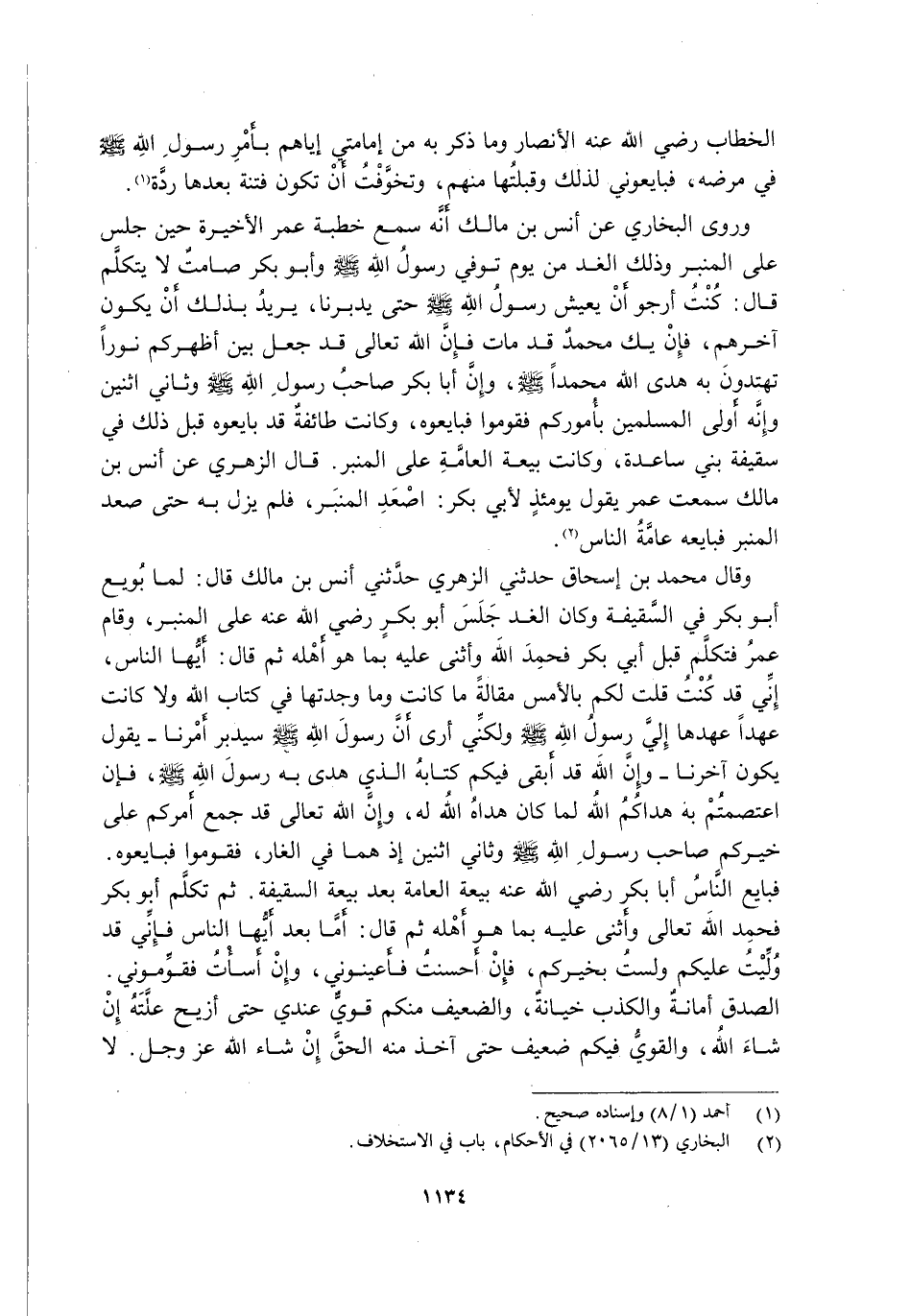 وَقَالَ مُحَمَّدُ بْنُ إِسْحَاقَ حَدَّثَنِي الزُّهْرِيُّ حَدَّثَنِي أَنَسُ بْنُ مَالِكٍ قَالَ: لَمَّا بُويِعَ أَبُو بَكْرٍ فِي السَّقِيفَةِ وَكَانَ الْغَدُ جَلَسَ أَبُو بَكْرٍ رَضِيَ اللَّهُ عَنْهُ عَلَى الْمِنْبَرِ, وَقَامَ عُمَرُ فَتَكَلَّمَ قَبْلَ أَبِي بَكْرٍ فَحَمِدَ اللَّهَ وَأَثْنَى عَلَيْهِ بِمَا هُوَ أَهْلُهُ ثُمَّ قَالَ: أَيُّهَا النَّاسُ, إِنِّي قَدْ كُنْتُ قُلْتُ لَكُمْ بِالْأَمْسِ مَقَالَةً مَا كَانَتْ وَمَا وَجَدْتُهَا فِي كِتَابِ اللَّهِ وَلَا كَانَتْ عَهْدًا عَهِدَهَا إِلَيَّ رَسُولُ اللَّهِ -صَلَّى اللَّهُ عَلَيْهِ وَسَلَّمَ- وَلَكِنِّي أَرَى أَنَّ رَسُولَ اللَّهِ -صَلَّى اللَّهُ عَلَيْهِ وَسَلَّمَ- سَيُدَبِّرُ أَمْرَنَا -يَقُولُ يَكُونُ آخِرُنَا- وَإِنَّ اللَّهَ قَدْ أَبْقَى فِيكُمْ كِتَابَهُ الَّذِي هَدَى بِهِ رَسُولَ اللَّهِ -صَلَّى اللَّهُ عَلَيْهِ وَسَلَّمَ- فَإِنِ اعْتَصَمْتُمْ بِهِ هَدَاكُمُ اللَّهُ لِمَا كَانَ هَدَاهُ اللَّهُ لَهُ, وَإِنَّ اللَّهَ تَعَالَى قَدْ جَمَعَ أَمْرَكُمْ عَلَى خَيْرِكُمْ صَاحِبِ رَسُولِ اللَّهِ -صَلَّى اللَّهُ عَلَيْهِ وَسَلَّمَ- وَثَانِي اثْنَيْنِ إِذْ هُمَا فِي الْغَارِ, فَقُومُوا فَبَايِعُوهُ. فَبَايَعَ النَّاسُ أَبَا بَكْرٍ رَضِيَ اللَّهُ عَنْهُ بَيْعَةَ الْعَامَّةِ بَعْدَ بَيْعَةِ السَّقِيفَةِ. ثُمَّ تَكَلَّمَ أَبُو بَكْرٍ فَحَمِدَ اللَّهَ تَعَالَى وَأَثْنَى عَلَيْهِ بِمَا هُوَ أَهْلُهُ ثُمَّ قَالَ: أَمَّا بَعْدُ أَيُّهَا النَّاسُ فَإِنِّي قَدْ وُلِّيتُ عَلَيْكُمْ وَلَسْتُ بِخَيْرِكُمْ, فَإِنْ أَحْسَنْتُ فَأَعِينُونِي, وَإِنْ أَسَأْتُ فَقَوِّمُونِي. الصِّدْقُ أَمَانَةٌ وَالْكَذِبُ خِيَانَةٌ, وَالضَّعِيفُ مِنْكُمْ قَوِيٌّ عِنْدِي حَتَّى أُزِيحَ عِلَّتَهُ إِنْ شَاءَ اللَّهُ, وَالْقَوِيُّ فِيكُمْ ضَعِيفٌ حَتَّى آخُذَ مِنْهُ الْحَقَّ إِنْ شَاءَ اللَّهُ عَزَّ وَجَلَّ. لَا