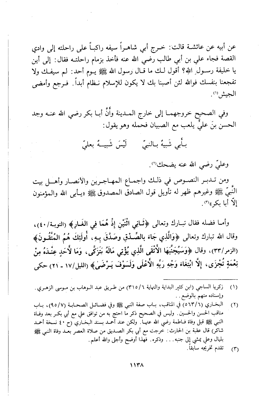 2 البخاري "6/ 563" في المناقب، باب صفة النبي -صَلَّى اللَّهُ عَلَيْهِ وَسَلَّمَ- وفي فضائل الصحابة "7/ 95"، باب مناقب الحسن والحسين. وليس في الصحيح ذكر ما احتج به من توافق علي مع أبي بكر بعد وفاة النبي -صَلَّى اللَّهُ عَلَيْهِ وَسَلَّمَ- قبل وفاة فاطمة رضي الله عنها. ولكن عند أحمد بسند البخاري "ح40 نسخة أحمد شاكر" قال عقبة بن الحارث: خرجت مع أبي بكر الصديق من صلاة العصر بعد وفاة النبي -صَلَّى اللَّهُ عَلَيْهِ وَسَلَّمَ- بليال وعلي يمشي إلى جنبه ... وذكره. فهذا أوضح وأجلى. والله أعلم.