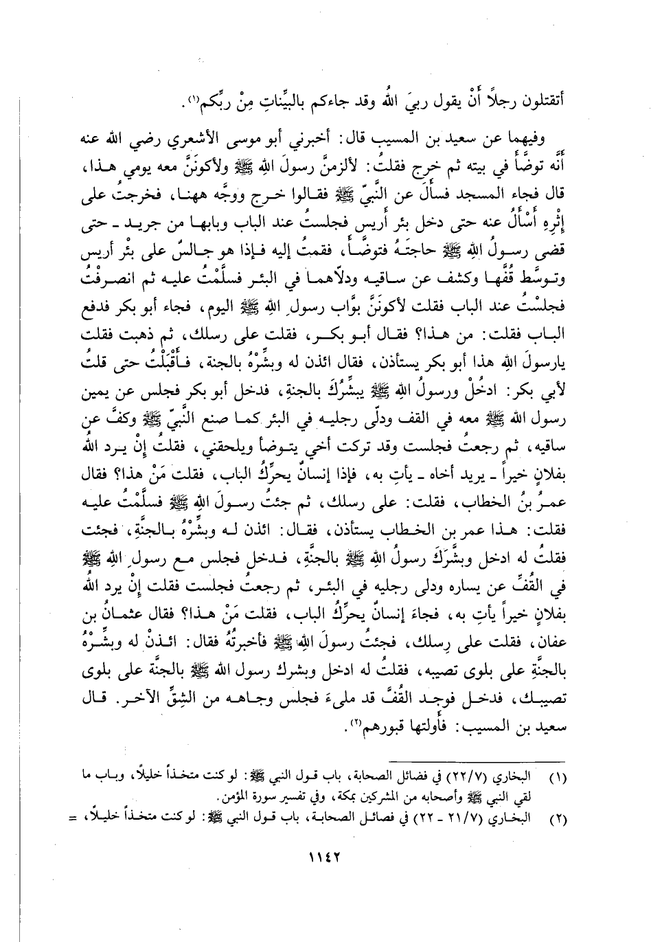 وَفِيهِمَا عَنْ سَعِيدِ بْنِ الْمُسَيَّبِ قَالَ: أَخْبَرَنِي أَبُو مُوسَى الْأَشْعَرِيُّ رَضِيَ اللَّهُ عَنْهُ أَنَّهُ تَوَضَّأَ فِي بَيْتِهِ ثُمَّ خَرَجَ فَقُلْتُ: لَأَلْزَمَنَّ رَسُولَ اللَّهِ -صَلَّى اللَّهُ عَلَيْهِ وَسَلَّمَ- وَلَأَكُونَنَّ مَعَهُ يَوْمِي هَذَا, قَالَ فَجَاءَ الْمَسْجِدَ فَسَأَلَ عَنِ النَّبِيِّ -صَلَّى اللَّهُ عَلَيْهِ وَسَلَّمَ- فَقَالُوا: خَرَجَ وَوَجَّهَ هَهُنَا, فَخَرَجْتُ عَلَى إِثْرِهِ أَسْأَلُ عَنْهُ حَتَّى دَخَلَ بِئْرَ أَرِيسٍ فَجَلَسْتُ عِنْدَ الْبَابِ وَبَابُهَا مِنْ جَرِيدٍ, حَتَّى قَضَى رَسُولُ اللَّهِ -صَلَّى اللَّهُ عَلَيْهِ وَسَلَّمَ- حَاجَتَهُ فَتَوَضَّأَ, فَقُمْتُ إِلَيْهِ فَإِذَا هُوَ جَالَسٌ عَلَى بِئْرِ أَرِيسٍ وَتَوَسَّطَ قُفَّهَا وَكَشَفَ عَنْ سَاقَيْهِ وَدَلَّاهُمَا فِي الْبِئْرِ فَسَلَّمْتُ عَلَيْهِ ثُمَّ انْصَرَفْتُ فَجَلَسْتُ عِنْدَ الْبَابِ فَقُلْتُ لَأَكُونَنَّ بَوَّابَ رَسُولِ اللَّهِ -صَلَّى اللَّهُ عَلَيْهِ وَسَلَّمَ- الْيَوْمَ, فَجَاءَ أَبُو بَكْرٍ فَدَفَعَ الْبَابَ فَقُلْتُ: مَنْ هَذَا؟ فَقَالَ: أَبُو بَكْرٍ. فَقُلْتُ: عَلَى رِسْلِكَ, ثُمَّ ذَهَبْتُ فَقُلْتُ: يَا رَسُولَ اللَّهِ, هَذَا أَبُو بَكْرٍ يَسْتَأْذِنُ. فَقَالَ: "ائْذَنْ لَهُ وَبَشِّرْهُ بِالْجَنَّةِ" فَأَقْبَلْتُ حَتَّى قُلْتُ لِأَبِي بَكْرٍ: ادْخُلْ وَرَسُولُ اللَّهِ -صَلَّى اللَّهُ عَلَيْهِ وَسَلَّمَ- يُبَشِّرُكَ بِالْجَنَّةِ, فَدَخَلَ أَبُو بَكْرٍ فَجَلَسَ عَنْ يَمِينِ رَسُولِ اللَّهِ -صَلَّى اللَّهُ عَلَيْهِ وَسَلَّمَ- مَعَهُ فِي الْقُفِّ وَدَلَّى رِجْلَيْهِ فِي الْبِئْرِ كَمَا صنع النبي -صَلَّى اللَّهُ عَلَيْهِ وَسَلَّمَ- وكف عَنْ سَاقَيْهِ, ثُمَّ رَجَعْتُ فَجَلَسْتُ وَقَدْ تَرَكْتُ أَخِي يَتَوَضَّأُ وَيَلْحَقُنِي, فَقُلْتُ: إِنْ يُرِدِ اللَّهُ بِفُلَانٍ خَيْرًا -يُرِيدُ أَخَاهُ- يَأْتِ بِهِ, فَإِذَا إِنْسَانٌ يُحَرِّكُ الْبَابَ, فَقُلْتُ: مَنْ هَذَا؟ فَقَالَ: عُمَرُ بْنُ الْخَطَّابِ. فَقُلْتُ: عَلَى رِسْلِكَ. ثُمَّ جِئْتُ رَسُولَ اللَّهِ -صَلَّى اللَّهُ عَلَيْهِ وَسَلَّمَ- فَسَلَّمْتُ عَلَيْهِ فَقُلْتُ: هَذَا عُمَرُ بْنُ الْخَطَّابِ يَسْتَأْذِنُ. فَقَالَ: "ائْذَنْ لَهُ وَبِشِّرْهُ بِالْجَنَّةِ" فَجِئْتُ فَقُلْتُ لَهُ: ادْخُلْ وَبَشَّرَكَ رَسُولُ اللَّهِ -صَلَّى اللَّهُ عَلَيْهِ وَسَلَّمَ- بِالْجَنَّةِ, فَدَخَلَ فَجَلَسَ مَعَ رَسُولِ اللَّهِ -صَلَّى اللَّهُ عَلَيْهِ وَسَلَّمَ- فِي الْقُفِّ عَنْ يَسَارِهِ وَدَلَّى رِجْلَيْهِ فِي الْبِئْرِ, ثُمَّ رَجَعْتُ فَجَلَسْتُ فَقُلْتُ: إِنْ يُرِدِ اللَّهُ بِفُلَانٍ خَيْرًا يَأْتِ بِهِ, فَجَاءَ إِنْسَانٌ يُحَرِّكُ الْبَابَ فَقُلْتُ: مَنْ هَذَا؟ فَقَالَ: عُثْمَانُ بْنُ عَفَّانَ. فَقُلْتُ: عَلَى رِسْلِكَ. فَجِئْتُ رَسُولَ اللَّهِ -صَلَّى اللَّهُ عَلَيْهِ وَسَلَّمَ- فَأَخْبَرْتُهُ فَقَالَ: "ائْذَنْ لَهُ وَبَشِّرْهُ بِالْجَنَّةِ عَلَى بَلْوَى تُصِيبُهُ" فَقُلْتُ لَهُ: ادْخُلْ وَبَشَّرَكَ رَسُولُ اللَّهِ -صَلَّى اللَّهُ عَلَيْهِ وَسَلَّمَ- بِالْجَنَّةِ عَلَى بَلْوَى تُصِيبُكَ, فَدَخَلَ فَوَجَدَ الْقُفَّ قَدْ مُلِئَ فَجَلَسَ وِجَاهَهُ مِنَ الشِّقِّ الْآخَرِ. قَالَ سَعِيدُ بْنُ الْمُسَيَّبِ: فَأَوَّلْتُهَا قُبُورَهُمْ2.