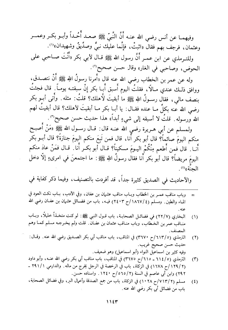 3 الترمذي "5/ 614-615/ ح3675" في المناقب، باب مناقب أبي بكر رضي الله عنه، وأبو داود "2/ 129/ ح1678" في الزكاة، باب في الرخصة في الرجل يخرج من ماله. والدارمي "1/ 291-292" وابن أبي عاصم في السنة "2/ 565/ ح1240. وإسناده حسن.