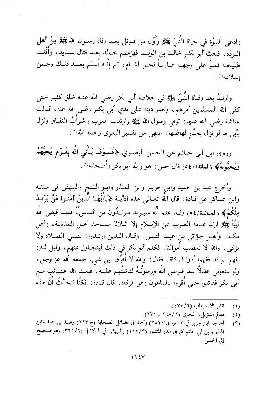 وَارْتَدَّ بَعْدَ وَفَاةِ النَّبِيِّ -صَلَّى اللَّهُ عَلَيْهِ وَسَلَّمَ- فِي خِلَافَةِ أَبِي بَكْرٍ رَضِيَ اللَّهُ عَنْهُ خَلْقٌ كَثِيرٌ حَتَّى كَفَى اللَّهُ الْمُسْلِمِينَ أَمْرَهُمْ, وَنَصَرَ دِينَهُ عَلَى يَدَيْ أَبِي بَكْرٍ رَضِيَ اللَّهُ عَنْهُ. قَالَتْ عَائِشَةُ رَضِيَ اللَّهُ عَنْهَا: تُوُفِّيَ رَسُولُ اللَّهِ -صَلَّى اللَّهُ عَلَيْهِ وَسَلَّمَ- وَارْتَدَتِ الْعَرَبُ وَاشْرَأَبَّ النِّفَاقُ, وَنَزَلَ بِأَبِي ما لو نَزَلْ بِحَبَّارٍ لَهَاضَهَا. انْتَهَى مِنْ تَفْسِيرِ الْبَغَوِيِّ رَحِمَهُ اللَّهُ2.