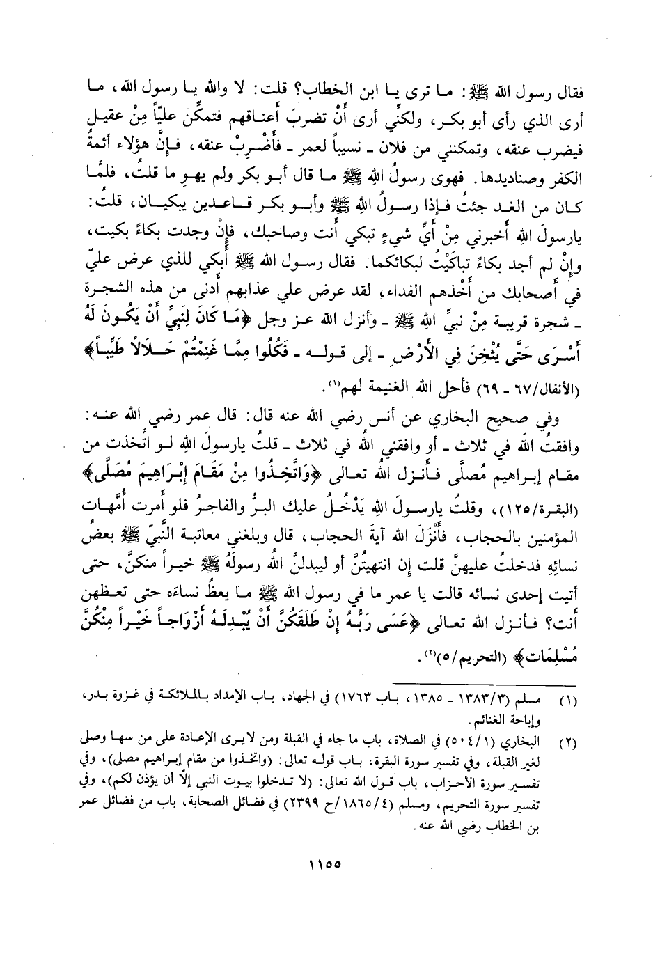 2 البخاري "1/ 504" في الصلاة، باب ما جاء في القبلة ومن لا يرى الإعادة على من سها وصلى لغير القبلة، وفي تفسير سورة البقرة، باب قوله تعالى: {وَاتَّخِذُوا مِنْ مَقَامِ إِبْرَاهِيمَ مُصَلّىً} ، وفي تفسير سورة الأحزاب، باب قول الله تعالى: {لا تَدْخُلُوا بُيُوتَ النَّبِيِّ إِلَّا أَنْ يُؤْذَنَ لَكُمْ} ، وفي تفسير سورة التحريم، ومسلم "4/ 1865/ ح2399" في فضائل الصحابة، باب من فضائل عمر بن الخطاب رضي الله عنه.