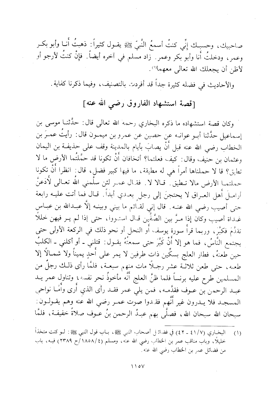 وَكَانَ قِصَّةُ اسْتِشْهَادِهِ مَا ذَكَرَهُ الْبُخَارِيُّ رَحِمَهُ اللَّهُ تَعَالَى قَالَ: حَدَّثَنَا مُوسَى بْنُ إِسْمَاعِيلَ حَدَّثَنَا أَبُو عَوَانَةَ عَنْ حُصَيْنٍ عَنْ عَمْرِو بْنِ مَيْمُونٍ قَالَ: رَأَيْتُ عُمَرَ بْنَ الْخَطَّابِ رَضِيَ اللَّهُ عَنْهُ قَبْلَ أَنْ يُصَابَ بِأَيَّامٍ بِالْمَدِينَةِ وَقَفَ عَلَى حُذَيْفَةَ بْنِ الْيَمَانِ وَعُثْمَانَ بْنِ حُنَيْفٍ وَقَالَ: كَيْفَ فَعَلْتُمَا؟ أتخافان أن تكون قَدْ حَمَّلْتُمَا الْأَرْضَ مَا لَا تُطِيقُ. قَالَا: حَمَّلْنَاهَا أَمْرًا هِيَ لَهُ مُطِيقَةٌ, مَا فِيهَا كَبِيرُ فَضْلٍ. قَالَ: انْظُرَا أَنْ تَكُونَا حَمَّلْتُمَا الْأَرْضَ مَا لَا تُطِيقُ. قَالَا: لَا. فَقَالَ عُمَرُ: لَئِنْ سَلَّمَنِي اللَّهُ تَعَالَى لَأَدَعَنَّ أَرَامِلَ أَهْلِ الْعِرَاقِ لَا يَحْتَجْنَ إِلَى رَجُلٍ بَعْدِي أَبَدًا. قَالَ: فَمَا أَتَتْ عَلَيْهِ رَابِعَةٌ حَتَّى أُصِيبَ رَضِيَ اللَّهُ عَنْهُ. قَالَ: إِنِّي لَقَائِمٌ مَا بَيْنِي وَبَيْنَهُ إِلَّا عَبْدَ اللَّهِ بْنِ عَبَّاسٍ غَدَاةَ أُصِيبَ وَكَانَ إِذَا مَرَّ بَيْنَ الصَّفَّيْنِ قَالَ: اسْتَوُوا, حَتَّى إِذَا لَمْ يَرَ فِيهِنَّ خَلَلًا تَقَدَّمَ فَكَبَّرَ, وَرُبَّمَا قَرَأَ سُورَةَ يُوسُفَ أَوِ النَّحْلِ أَوْ نَحْوَ ذَلِكَ في الركعة الأول حَتَّى يَجْتَمِعَ النَّاسُ, فَمَا هُوَ إِلَّا أَنْ كَبَّرَ حَتَّى سَمِعْتُهُ يَقُولُ: قَتَلَنِي -أَوْ أَكَلَنِي- الْكَلْبُ حِينَ طَعَنَهُ, فَطَارَ الْعِلْجُ بِسِكِّينٍ ذَاتِ طَرَفَيْنِ لَا يَمُرُّ عَلَى أَحَدٍ يَمِينًا وَلَا شَمَالًا إِلَّا طَعَنَهُ, حَتَّى طَعَنَ ثَلَاثَةَ عَشَرَ رَجُلًا مَاتَ مِنْهُمْ سَبْعَةٌ, فَلَمَّا رَأَى ذَلِكَ رَجُلٌ مِنَ الْمُسْلِمِينَ طَرَحَ عَلَيْهِ بُرْنُسًا فَلَمَّا ظَنَّ الْعِلْجُ أَنَّهُ مَأْخُوذٌ نَحَرَ نَفْسَهُ, وَتَنَاوَلَ عُمَرُ يَدَ عَبْدِ الرَّحْمَنِ بْنِ عَوْفٍ فَقَدَّمَهُ, فَمَنْ يَلِي عُمَرَ فَقَدْ رَأَى الَّذِي أَرَى وَأَمَّا نَوَاحِي الْمَسْجِدِ فَلَا يَدْرُونَ غَيْرَ أَنَّهُمْ فَقَدُوا صَوْتَ عُمَرَ رَضِيَ اللَّهُ عَنْهُ وَهُمْ يَقُولُونَ: سُبْحَانَ اللَّهِ سُبْحَانَ اللَّهِ, فَصَلَّى بِهِمْ عَبْدُ الرَّحْمَنِ بْنُ عَوْفٍ صَلَاةً خَفِيفَةً, فَلَمَّا