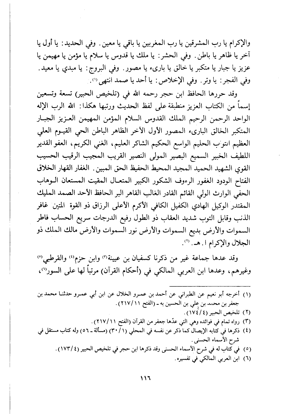 وَقَدْ حَرَّرَهَا الْحَافِظُ ابْنُ حَجَرٍ رَحِمَهُ اللَّهُ فِي "تَلْخِيصِ الْحَبِيرِ" تِسْعَةً وَتِسْعِينَ اسْمًا مِنَ الْكِتَابِ الْعَزِيزِ مُنْطَبِقَةً عَلَى لَفْظِ الْحَدِيثِ وَرَتَّبَهَا هَكَذَا: اللَّهُ الرَّبُّ الْإِلَهُ الْوَاحِدُ الرَّحْمَنُ الرَّحِيمُ الْمَلِكُ الْقُدُّوسُ السَّلَامُ الْمُؤْمِنُ الْمُهَيْمِنُ الْعَزِيزُ الْجَبَّارُ الْمُتَكَبِّرُ الْخَالِقُ الْبَارِئُ الْمُصَوِّرُ الْأَوَّلُ الْآخِرُ الظَّاهِرُ الْبَاطِنُ الْحَيُّ الْقَيُّومُ الْعَلِيُّ الْعَظِيمُ التَّوَّابُ الْحَلِيمُ الْوَاسِعُ الْحَكِيمُ الشَّاكِرُ الْعَلِيمُ الْغَنِيُّ الْكَرِيمُ الْعَفُوُّ الْقَدِيرُ اللَّطِيفُ الْخَبِيرُ السَّمِيعُ الْبَصِيرُ الْمَوْلَى النَّصِيرُ الْقَرِيبُ الْمُجِيبُ الرَّقِيبُ الْحَسِيبُ الْقَوِيُّ الشَّهِيدُ الْحَمِيدُ الْمَجِيدُ الْمُحِيطُ الْحَفِيظُ الْحَقُّ الْمُبِينُ الْغَفَّارُ الْقَهَّارُ الْخَلَّاقُ الْفَتَّاحُ الْوَدُودُ الْغَفُورُ الرَّءُوفُ الشَّكُورُ الْكَبِيرُ الْمُتَعَالِ الْمُقِيتُ الْمُسْتَعَانُ الْوَهَّابُ الْحَفِيُّ الْوَارِثُ الْوَلِيُّ الْقَائِمُ الْقَادِرُ الْغَالِبُ الْقَاهِرُ الْبَرُّ الْحَافِظُ الْأَحَدُ الصَّمَدُ الْمَلِيكُ الْمُقْتَدِرُ الْوَكِيلُ الْهَادِي الْكَفِيلُ الْكَافِي الْأَكْرَمُ الْأَعْلَى الرَّزَّاقُ ذُو الْقُوَّةِ الْمَتِينُ غَافِرُ الذَّنْبِ وَقَابِلُ التَّوْبِ شَدِيدُ الْعِقَابِ ذُو الطَّوْلِ رَفِيعُ الدَّرَجَاتِ سَرِيعُ الْحِسَابِ فَاطِرُ السَّمَاوَاتِ وَالْأَرْضِ بَدِيعُ السَّمَاوَاتِ وَالْأَرْضِ نُورُ السَّمَاوَاتِ وَالْأَرْضِ مَالِكُ الْمُلْكِ ذُو الْجَلَالِ وَالْإِكْرَامِ ا. هـ.2.