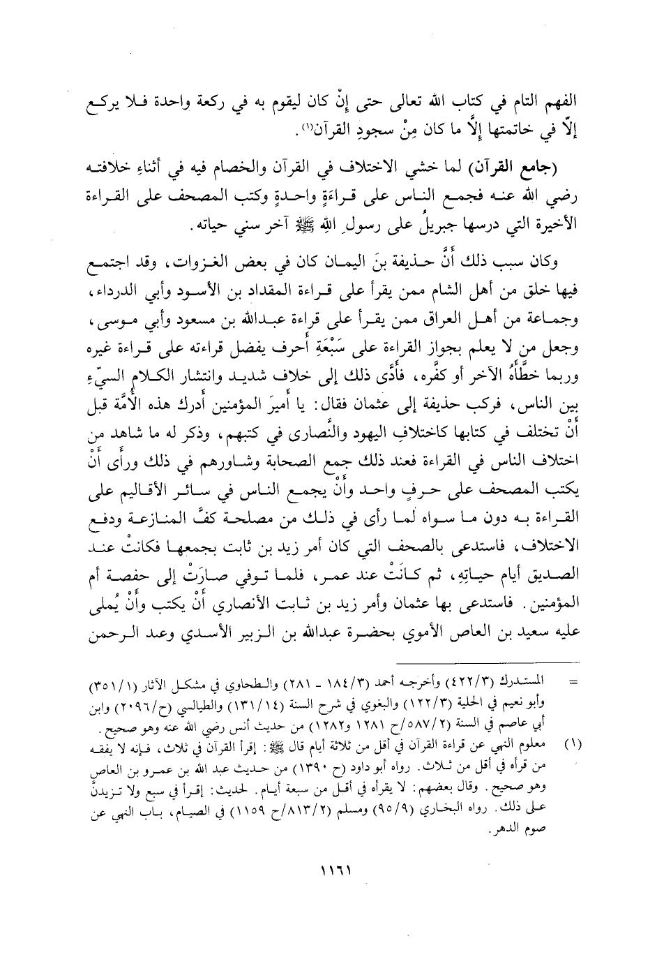 الْفَهْمُ التَّامُّ فِي كِتَابِ اللَّهِ تَعَالَى حَتَّى إِنْ كَانَ لَيَقُومُ بِهِ فِي رَكْعَةٍ وَاحِدَةٍ فَلَا يَرْكَعُ إِلَّا مَا كَانَ مِنْ سُجُودِ الْقُرْآنِ1.