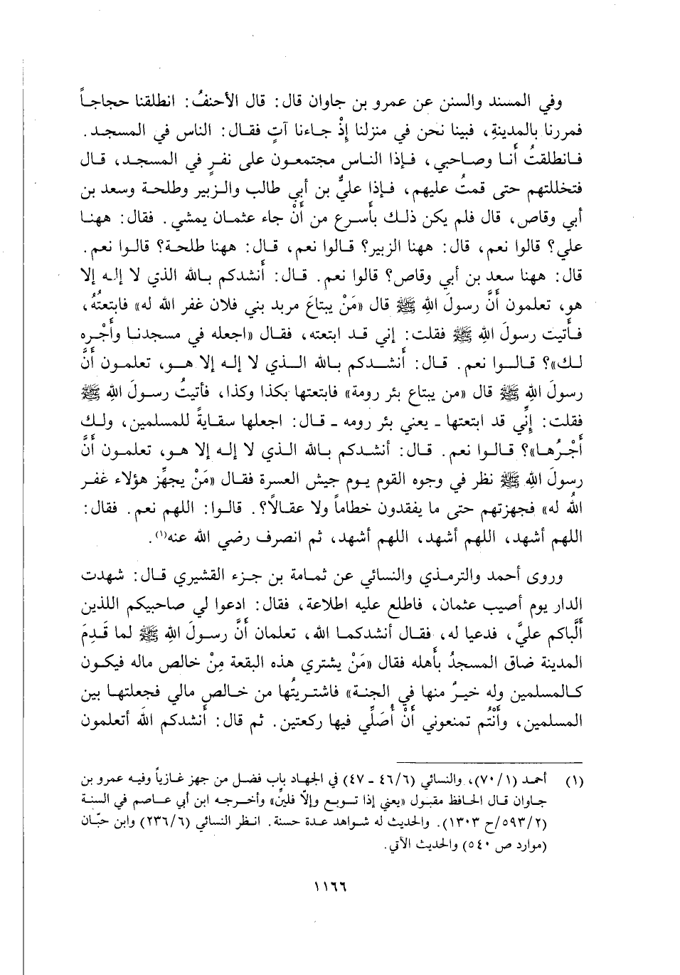 وَفِي الْمُسْنَدِ وَالسُّنَنِ عَنْ عَمْرِو بْنِ جَاوَانَ قَالَ: قَالَ الْأَحْنَفُ: انْطَلَقْنَا حُجَّاجًا فَمَرَرْنَا بِالْمَدِينَةِ, فَبَيْنَا نَحْنُ فِي مَنْزِلِنَا إِذْ جَاءَنَا آتٍ فَقَالَ: النَّاسُ فِي الْمَسْجِدِ. فَانْطَلَقْتُ أَنَا وَصَاحِبِي, فَإِذَا النَّاسُ مُجْتَمِعُونَ عَلَى نَفَرٍ فِي الْمَسْجِدِ, قَالَ: فَتَخَلَلْتُهُمْ حَتَّى قُمْتُ عَلَيْهِمْ, فَإِذَا عَلِيُّ بْنُ أَبِي طَالِبٍ وَالزُّبَيْرُ وَطِلْحَةُ وَسَعْدُ بْنُ أَبِي وَقَّاصٍ, قَالَ: فَلَمْ يَكُنْ ذَلِكَ بِأَسْرَعَ مِنْ أَنْ جَاءَ عُثْمَانُ يَمْشِي. فَقَالَ: هَهُنَا عَلِيٌّ؟ قَالُوا: نَعَمْ. قَالَ: هَهُنَا الزُّبَيْرُ؟ قَالُوا: نَعَمْ. قَالَ: هَهُنَا طَلْحَةُ؟ قَالُوا: نَعَمْ. قَالَ: هَهُنَا سَعْدُ بْنُ أَبِي وَقَّاصٍ؟ قَالُوا: نَعَمْ. قَالَ: أَنْشُدُكُمْ بِاللَّهِ الَّذِي لَا إِلَهَ إِلَّا هُوَ, تَعْلَمُونَ أَنَّ رَسُولَ اللَّهِ -صَلَّى اللَّهُ عَلَيْهِ وَسَلَّمَ- قَالَ: "مَنْ يَبْتَاعُ مِرْبَدَ بَنِي فُلَانٍ غَفَرَ اللَّهُ لَهُ" فَابْتَعْتُهُ, فَأَتَيْتُ رَسُولَ اللَّهِ -صَلَّى اللَّهُ عَلَيْهِ وَسَلَّمَ- فَقُلْتُ: إِنِّي قَدِ ابْتَعْتُهُ, فَقَالَ: "اجْعَلْهُ فِي مَسْجِدِنَا وَأَجْرُهُ لَكَ" قَالُوا: نَعَمْ. قَالَ: أَنْشُدُكُمْ بِاللَّهِ الَّذِي لَا إِلَهَ إِلَّا هُوَ تَعْلَمُونَ أَنَّ رَسُولَ اللَّهِ -صَلَّى اللَّهُ عَلَيْهِ وَسَلَّمَ- قَالَ: "مَنْ يَبْتَاعُ بِئْرَ رُومَةَ" فَابْتَعْتُهَا بِكَذَا وَكَذَا, فَأَتَيْتُ رَسُولَ اللَّهِ -صَلَّى اللَّهُ عَلَيْهِ وَسَلَّمَ- فَقُلْتُ: إِنِّي قَدِ ابْتَعْتُهَا -يَعْنِي بِئْرَ رُومَةَ- قَالَ: "اجْعَلْهَا سِقَايَةً لِلْمُسْلِمِينَ وَلَكَ أَجْرُهَا" قَالُوا: نَعَمْ. قَالَ: أَنْشُدُكُمْ بِاللَّهِ الَّذِي لَا إِلَهَ إِلَّا هُوَ تَعْلَمُونَ أَنَّ رَسُولَ اللَّهِ -صَلَّى اللَّهُ عَلَيْهِ وَسَلَّمَ- نَظَرَ فِي وُجُوهِ الْقَوْمِ يَوْمَ جَيْشِ الْعُسْرَةِ فَقَالَ: "مَنْ يُجَهِّزُ هَؤُلَاءِ غَفَرَ اللَّهُ لَهُ" فَجَهَّزْتُهُمْ حَتَّى مَا يَفْقِدُونَ خِطَامًا وَلَا عِقَالًا. قَالُوا: اللَّهُمَّ نَعَمْ. فَقَالَ: اللَّهُمَّ اشْهَدْ, اللَّهُمَّ اشْهَدْ, اللَّهُمَّ اشْهَدْ, ثُمَّ انْصَرَفَ رَضِيَ اللَّهُ عَنْهُ1.