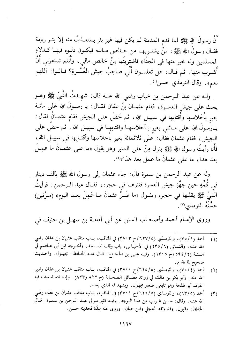 وَلَهُ عَنْ عَبْدِ الرَّحْمَنِ بْنِ سَمُرَةَ قَالَ: جَاءَ عُثْمَانُ إِلَى رَسُولِ اللَّهِ -صَلَّى اللَّهُ عَلَيْهِ وَسَلَّمَ- بِأَلْفِ دِينَارٍ فِي كُمِّهِ حِينَ جَهَّزَ جَيْشَ الْعُسْرَةِ فَنَثَرَهَا فِي حِجْرِهِ, فَقَالَ عَبْدُ الرَّحْمَنِ: فَرَأَيْتُ النَّبِيَّ -صَلَّى اللَّهُ عَلَيْهِ وَسَلَّمَ- يُقَلِّبُهَا فِي حِجْرِهِ وَيَقُولُ: "مَا ضَرَّ عُثْمَانَ مَا عَمِلَ بعد اليوم" مرتي. حَسَّنَهُ التِّرْمِذِيُّ3.