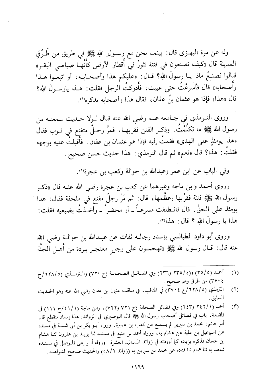 وَلَهُ عَنْ مُرَّةَ الْبَهْزِيِّ قَالَ: بَيْنَمَا نَحْنُ مَعَ رَسُولِ اللَّهِ -صَلَّى اللَّهُ عَلَيْهِ وَسَلَّمَ- فِي طَرِيقٍ مِنْ طُرُقِ الْمَدِينَةِ قَالَ: "كَيْفَ تَصْنَعُونَ فِي فِتْنَةٍ تَثُورُ فِي أَقْطَارِ الْأَرْضِ كَأَنَّهَا صَيَاصِي الْبَقَرِ" قَالُوا: نَصْنَعُ مَاذَا يَا رَسُولَ اللَّهِ؟ قَالَ: "عَلَيْكُمْ هَذَا وَأَصْحَابَهُ -أَوِ- اتَّبِعُوا هَذَا وَأَصْحَابَهُ" قَالَ: فَأَسْرَعْتُ حَتَّى عَيِيْتُ, فَأَدْرَكْتُ الرَّجُلَ فَقُلْتُ: هَذَا يَا رَسُولَ اللَّهِ؟ قَالَ: "هَذَا" فَإِذَا هُوَ عُثْمَانُ بْنُ عَفَّانَ, فَقَالَ: هَذَا وَأَصْحَابُهُ يَذْكُرُهُ1.