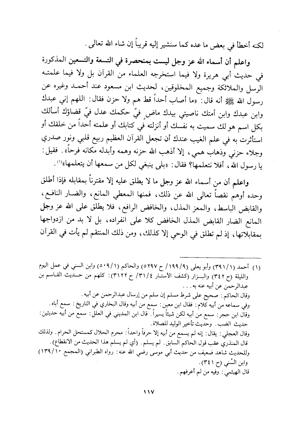 وَاعْلَمْ أَنَّ أَسْمَاءَ اللَّهِ عَزَّ وَجَلَّ لَيْسَتْ بِمُنْحَصِرَةٍ فِي التِّسْعَةِ وَالتِسْعِينَ الْمَذْكُورَةِ فِي حَدِيثِ أَبِي هُرَيْرَةَ وَلَا فِيمَا اسْتَخْرَجَهُ الْعُلَمَاءُ مِنَ الْقُرْآنِ بَلْ وَلَا فِيمَا عَلِمَتْهُ الرُّسُلُ وَالْمَلَائِكَةُ وَجَمِيعُ الْمَخْلُوقِينَ لِحَدِيثِ ابْنِ مَسْعُودٍ عِنْدَ أَحْمَدَ وَغَيْرِهِ عَنْ رَسُولِ اللَّهِ -صَلَّى اللَّهُ عَلَيْهِ وَسَلَّمَ- أَنَّهُ قَالَ: "مَا أَصَابَ أَحَدًا قَطُّ هم ولا وَلَا حَزَنٌ فَقَالَ: اللَّهُمَّ إِنِّي عَبْدُكَ وَابْنُ عَبْدِكَ وَابْنُ أَمَتِكَ نَاصِيَتِي بِيَدِكَ مَاضٍ فِيَّ حُكْمُكَ عَدْلٌ فِيَّ قَضَاؤُكَ أَسْأَلُكَ بِكُلِّ اسْمٍ هُوَ لَكَ سَمَّيْتَ بِهِ نَفْسَكَ أَوْ أَنْزَلْتَهُ فِي كِتَابِكَ أَوْ عَلَّمْتَهُ أَحَدًا مِنْ خَلْقِكَ أَوِ اسْتَأْثَرَتْ بِهِ فِي عِلْمِ الْغَيْبِ عِنْدَكَ أَنْ تَجْعَلَ الْقُرْآنَ الْعَظِيمَ رَبِيعَ قَلْبِي وَنُورَ صَدْرِي وَجَلَاءَ حُزْنِي وَذَهَابَ هَمِّي, إِلَّا أَذْهَبَ اللَّهُ حُزْنَهُ وَهَمَّهُ وَأَبْدَلَهُ مَكَانَهُ فَرَحًا". فَقِيلَ: يَا رَسُولَ اللَّهِ أَفَلَا نَتَعَلَّمُهَا؟ فَقَالَ: "بَلَى يَنْبَغِي لِكُلِّ مَنْ سَمِعَهَا أَنْ يَتَعَلَّمَهَا" 1.