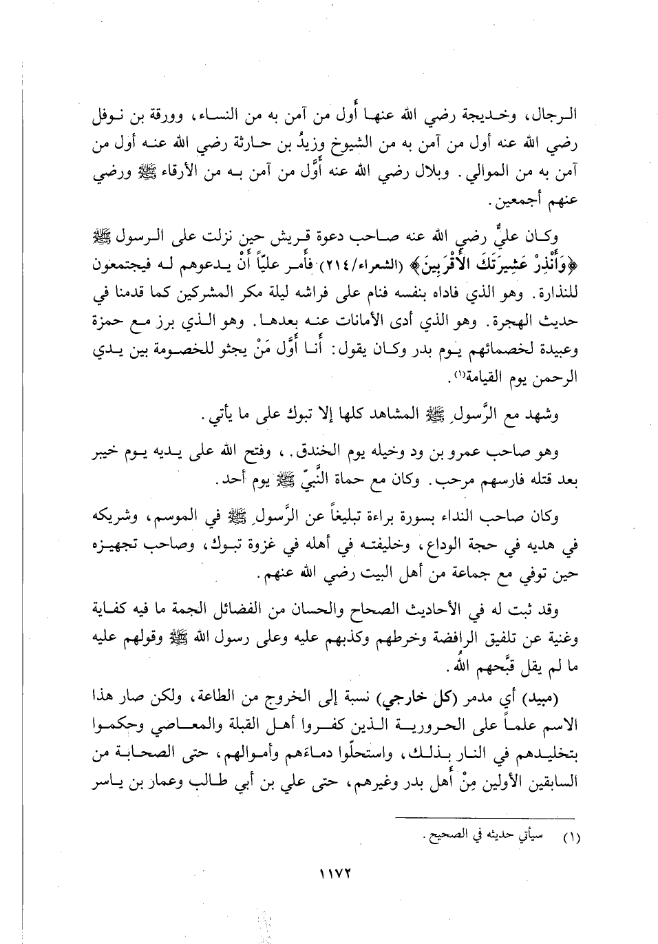 الرِّجَالِ, وَخَدِيجَةَ رَضِيَ اللَّهُ عَنْهَا أَوَّلُ مَنْ آمَنَ بِهِ مِنَ النِّسَاءِ, وَوَرَقَةَ بْنَ نَوْفَلٍ رَضِيَ اللَّهُ عَنْهُ أَوَّلُ من آمن به مَنْ الشُّيُوخِ وَزَيْدَ بْنَ حَارِثَةَ رَضِيَ اللَّهُ عَنْهُ أَوَّلُ مَنْ آمَنَ بِهِ مِنَ الْمَوَالِي. وَبِلَالَ رَضِيَ اللَّهُ عَنْهُ أَوَّلُ مَنْ آمَنَ بِهِ مِنَ الْأَرِقَّاءِ -صَلَّى اللَّهُ عَلَيْهِ وَسَلَّمَ- وَرَضِيَ عَنْهُمْ أَجْمَعِينَ.