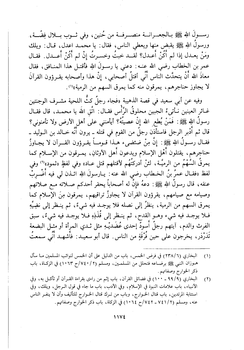 2 البخاري "9/ 99-100" في فضائل القرآن، باب إثم من راءى بقراءة القرآن أو تأكل به، وفي الأنبياء، باب علامات النبوة في الإسلام، وفي الأدب، باب ما جاء في قول الرجل، ويلك، وفي استتابة المرتدين، باب قتال الخوارج، وباب من ترك قتال الخوارج للتأليف وأن لا ينفر الناس عنه، ومسلم "2/ 741-742/ ح1064" في الزكاة، باب ذكر الخوارج وصفاتهم.