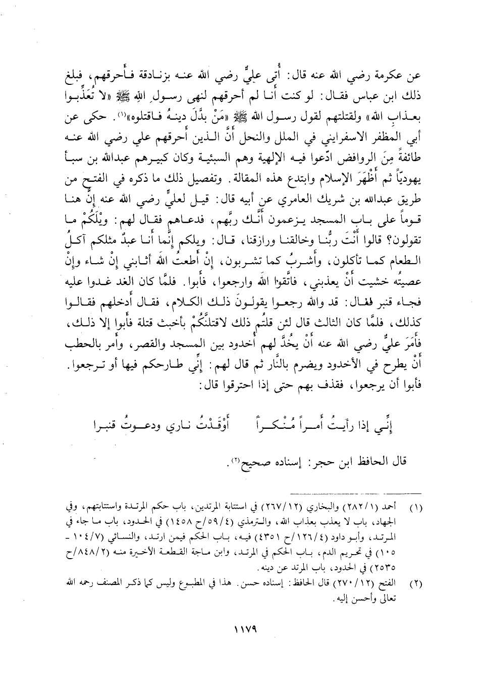 عَنْ عِكْرِمَةَ رَضِيَ اللَّهُ عَنْهُ قَالَ: أُتِيَ عَلِيٌّ رَضِيَ اللَّهُ عَنْهُ بِزَنَادِقَةٍ فَأَحْرَقَهُمْ, فَبَلَغَ ذَلِكَ ابْنُ عَبَّاسٍ فَقَالَ: لَوْ كُنْتُ أَنَا لَمْ أَحْرِقْهُمْ لِنَهِيِ رَسُولِ اللَّهِ, صَلَّى اللَّهُ عَلَيْهِ وَسَلَّمَ: "لَا تُعَذِّبُوا بِعَذَابِ اللَّهِ" وَلَقَتَلْتُهُمْ لِقَوْلِ رَسُولِ اللَّهِ, صَلَّى اللَّهُ عَلَيْهِ وَسَلَّمَ: "مَنْ بَدَّلَ دِينَهُ فَاقْتُلُوهُ" 1. حُكِيَ عَنْ أبي المظفر الإسفريني فِي الْمِلَلِ وَالنِّحَلِ أَنَّ الَّذِينَ أَحْرَقَهُمْ عَلِيٌّ رَضِيَ اللَّهُ عَنْهُ طَائِفَةٌ مِنَ الرَّوَافِضِ ادَّعُوَا فِيهِ الْإِلَهِيَّةَ وَهُمُ السَّبَئِيَّةُ وَكَانَ كَبِيرُهُمْ عَبْدُ اللَّهِ بْنُ سَبَأٍ يَهُودِيًّا, ثُمَّ أَظْهَرَ الْإِسْلَامَ وَابْتَدَعَ هَذِهِ الْمَقَالَةَ. وَتَفْصِيلُ ذَلِكَ مَا ذَكَرَهُ فِي الْفَتْحِ مِنْ طَرِيقِ عَبْدِ اللَّهِ بْنِ شَرِيكٍ الْعَامِرِيِّ عَنْ أَبِيهِ قَالَ: قِيلَ لِعَلِيٍّ رَضِيَ اللَّهُ عَنْهُ إن هنا قوم عَلَى بَابِ الْمَسْجِدِ يَزْعُمُونَ أَنَّكَ رَبَّهُمْ, فَدَعَاهُمْ فَقَالَ لَهُمْ: وَيْلَكُمُ مَا تَقُولُونَ؟ قَالُوا: أَنْتَ رَبُّنَا وَخَالِقُنَا وَرَازِقُنَا قَالَ: وَيْلَكُمْ إِنَّمَا أَنَا عَبْدٌ مِثْلُكُمْ آكُلُ الطَّعَامَ كَمَا تَأْكُلُونَ وَأَشْرَبُ كَمَا تَشْرَبُونَ, إِنْ أَطَعْتُ اللَّهَ أَثَابَنِي إِنْ شَاءَ وَإِنْ عَصَيْتَهُ خَشِيْتُ أَنْ يُعَذِّبَنِي, فَاتَّقُوا اللَّهَ وَارْجِعُوا, فَأَبَوْا. فَلَمَّا كَانَ الْغَدُ غَدَوْا عَلَيْهِ فَجَاءَ قَنْبَرٌ فَقَالَ: قَدْ وَاللَّهِ رَجَعُوا يَقُولُونَ ذَلِكَ الْكَلَامَ. فَقَالَ: أَدْخِلْهُمْ. فَقَالُوا: كَذَلِكَ, فَلَمَّا كَانَ الثَّالِثُ قَالَ: لَئِنْ قُلْتُمْ ذَلِكَ لَأَقْتُلَنَّكُمْ بِأَخْبَثِ قِتْلَةٍ. فَأَبَوْا إِلَّا ذَلِكَ, فَأَمَرَ عَلِيٌّ رَضِيَ اللَّهُ عَنْهُ أَنْ يَخُدَّ لَهُمْ أُخْدُودٌ بَيْنَ الْمَسْجِدِ وَالْقَصْرِ, وَأَمَرَ بِالْحَطَبِ أَنْ يُطْرَحَ فِي الْأُخْدُودِ وَيُضْرَمَ بِالنَّارِ ثُمَّ قَالَ لَهُمْ: إِنِّي طَارِحُكُمْ فِيهَا أَوْ تَرْجِعُوا. فَأَبَوْا أَنْ يَرْجِعُوا, فَقَذَفَ بِهِمْ حَتَّى إِذَا احْتَرَقُوا قَالَ: