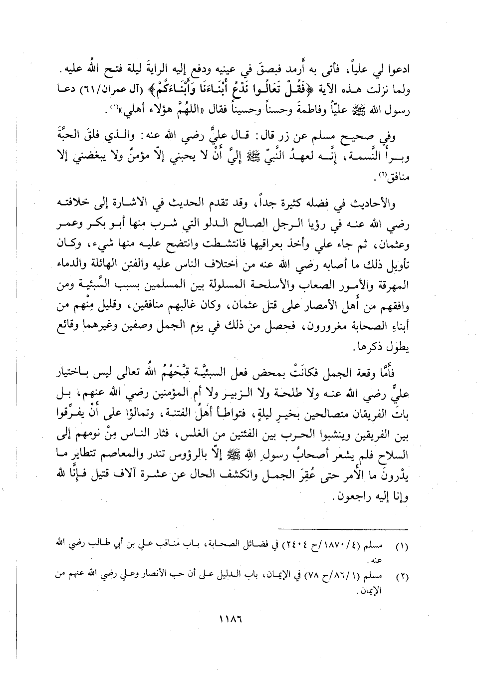 فَأَمَّا وَقْعَةُ الْجَمَلِ فَكَانَتْ بِمَحْضِ فِعْلِ السَّبَئِيَّةِ قَبَّحَهُمُ اللَّهُ تَعَالَى لَيْسَ بِاخْتِيَارِ عَلِيٍّ رَضِيَ اللَّهُ عَنْهُ وَلَا طَلْحَةَ وَلَا الزُّبَيْرِ وَلَا أُمِّ الْمُؤْمِنِينَ رَضِيَ اللَّهُ عَنْهُمْ, بَلْ بَاتَ الْفَرِيقَانِ مُتَصَالِحِينَ بِخَيْرِ لَيْلَةٍ, فَتَوَاطَأَ أَهْلُ الْفِتْنَةِ وَتَمَالَئُوا عَلَى أَنْ يُفَرِّقُوا بَيْنَ الْفَرِيقَيْنِ وَيُنْشِبُوا الْحَرْبَ بَيْنَ الْفِئَتَيْنِ مِنَ الْغَلَسِ, فَثَارَ النَّاسُ مِنْ نَوْمِهِمْ إِلَى السِّلَاحِ فَلَمْ يَشْعُرْ أَصْحَابُ رَسُولِ اللَّهِ -صَلَّى اللَّهُ عَلَيْهِ وَسَلَّمَ- إِلَّا بِالرُّءُوسِ تَنْدُرُ وَالْمَعَاصِمُ تَتَطَايَرُ مَا يَدْرُونَ مَا الْأَمْرُ حَتَّى عُقِرَ الْجَمَلُ وَانْكَشَفَ الْحَالُ عَنْ عَشَرَةِ آلَافِ قَتِيلٍ فَإِنَّا لِلَّهِ وَإِنَّا إِلَيْهِ رَاجِعُونَ.