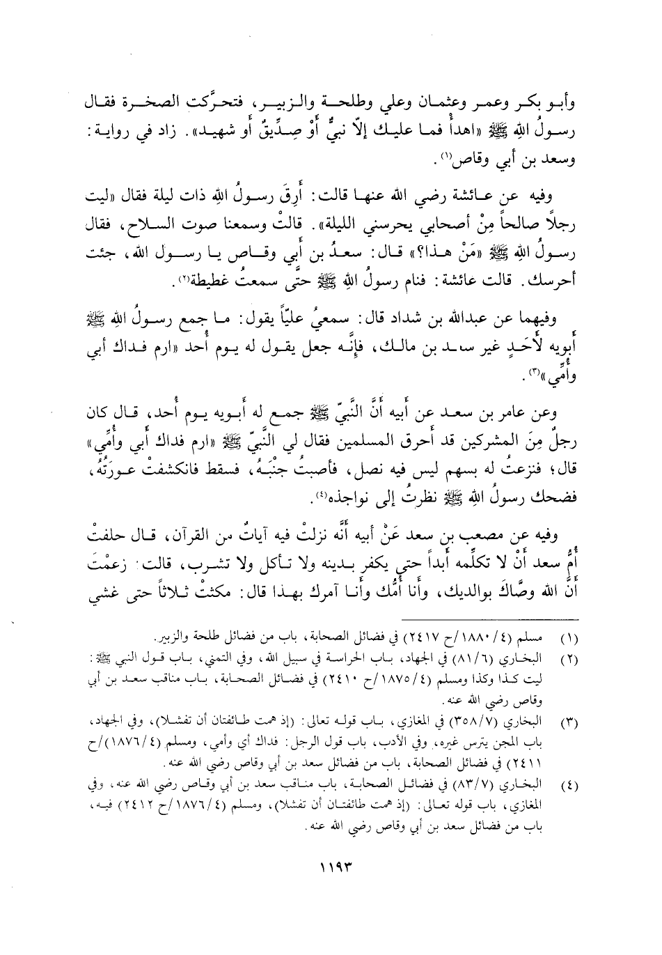 4 البخاري "7/ 83" في فضائل الصحابة، باب مناقب سعد بن أبي وقاص رضي الله عنه، وفي المغازي، باب قوله تعالى: {إِذْ هَمَّتْ طَائِفَتَانِ مِنْكُمْ أَنْ تَفْشَلا} ، ومسلم "4/ 1876/ ح2412" فيه، باب من فضائل سعد بن أبي وقاص رضي الله عنه.