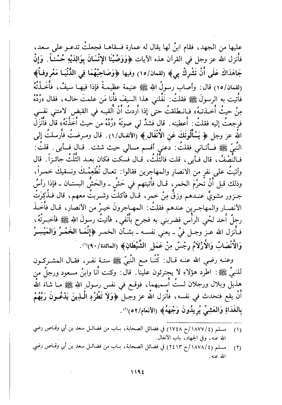 عَلَيْهَا مِنَ الْجَهْدِ, فَقَامَ ابْنٌ لَهَا يُقَالُ لَهُ عُمَارَةُ فَسَقَاهَا فَجَعَلَتْ تَدْعُو عَلَى سَعْدٍ, فَأَنْزَلَ اللَّهُ عَزَّ وَجَلَّ فِي الْقُرْآنِ هَذِهِ الْآيَاتِ {وَوَصَّيْنَا الْإِنْسَانَ بِوَالِدَيْهِ حُسْنًا وَإِنْ جَاهَدَاكَ عَلى أَنْ تُشْرِكَ بِي} [لُقْمَانَ: 15] وَفِيهَا {وَصَاحِبْهُمَا فِي الدُّنْيَا مَعْرُوفًا} [لُقْمَانَ: 15] قَالَ: وَأَصَابَ رَسُولُ اللَّهِ -صَلَّى اللَّهُ عَلَيْهِ وَسَلَّمَ- غَنِيمَةً عَظِيمَةً فَإِذَا فِيهَا سَيْفٌ, فَأَخَذْتُهُ فَأَتَيْتُ بِهِ الرَّسُولَ -صَلَّى اللَّهُ عَلَيْهِ وَسَلَّمَ- فَقُلْتُ: نَفِّلْنِي هَذَا السَّيْفَ, فَأَنَا مَنْ عَلِمْتَ حَالَهُ, فَقَالَ: "رُدَّهُ مِنْ حَيْثُ أَخَذْتَهُ" فَانْطَلَقْتُ حَتَّى إِذَا أَرَدْتُ أَنْ أُلْقِيَهُ فِي الْقَبْضِ لَامَتْنِي نَفْسِي فَرَجَعْتُ إِلَيْهِ فَقُلْتُ: أَعْطِنِيهِ. قَالَ: فَشَدَّ لِي صَوْتَهُ "رُدَّهُ مِنْ حَيْثُ أَخَذْتَهُ" قَالَ: فَأَنْزَلَ اللَّهُ عَزَّ وَجَلَّ {يَسْأَلُونَكَ عَنِ الْأَنْفَالِ} [الْأَنْفَالِ: 1] قَالَ: وَمَرِضْتُ فَأَرْسَلْتُ إِلَى النَّبِيِّ -صَلَّى اللَّهُ عَلَيْهِ وَسَلَّمَ- فَأَتَانِي فَقُلْتُ: دَعْنِي أَقْسِمْ مَالِي حَيْثُ شِئْتُ. قَالَ: فَأَبَى. قُلْتُ: فَالنِّصْفَ. قَالَ: فَأَبَى. قُلْتُ: فَالثُّلُثَ. قَالَ: فَسَكَتَ. فَكَانَ بَعْدُ الثُّلُثُ جَائِزًا. قَالَ: وَأَتَيْتُ عَلَى نَفَرٍ مِنَ الْأَنْصَارِ وَالْمُهَاجِرِينَ فَقَالُوا: تعال نطعمك ونسقيك خَمْرًا, وَذَلِكَ قَبْلَ أَنْ تُحَرَّمَ الْخَمْرُ, قَالَ: فَأَتَيْتُهُمْ فِي حَشٍّ -وَالْحَشُّ الْبُسْتَانُ- فَإِذَا رَأَسُ جَزُورٍ مَشْوِيٌّ عِنْدَهُمْ وَزِقٌّ مِنْ خَمْرٍ, قَالَ: فَأَكَلْتُ وَشَرِبْتُ مَعَهُمْ, قَالَ: فَذَكَرْتُ الْأَنْصَارَ وَالْمُهَاجِرِينَ عِنْدَهُمْ فَقُلْتُ: الْمُهَاجِرُونَ خَيْرٌ مِنَ الْأَنْصَارِ, قَالَ: فَأَخَذَ رَجُلٌ أَحَدَ لَحْيَيِ الرَّأْسِ فضربني به فجرج بِأَنْفِي, فَأَتَيْتُ رَسُولَ اللَّهِ -صَلَّى اللَّهُ عَلَيْهِ وَسَلَّمَ- فَأَخْبَرْتُهُ, فَأَنْزَلَ اللَّهُ عَزَّ وَجَلَّ فِيَّ -يَعْنِي نَفْسَهُ- بِشَأْنِ الْخَمْرِ {إِنَّمَا الْخَمْرُ وَالْمَيْسِرُ وَالْأَنْصَابُ وَالْأَزْلَامُ رِجْسٌ مِنْ عَمَلِ الشَّيْطَانِ} [الْمَائِدَةِ: 90] 1.