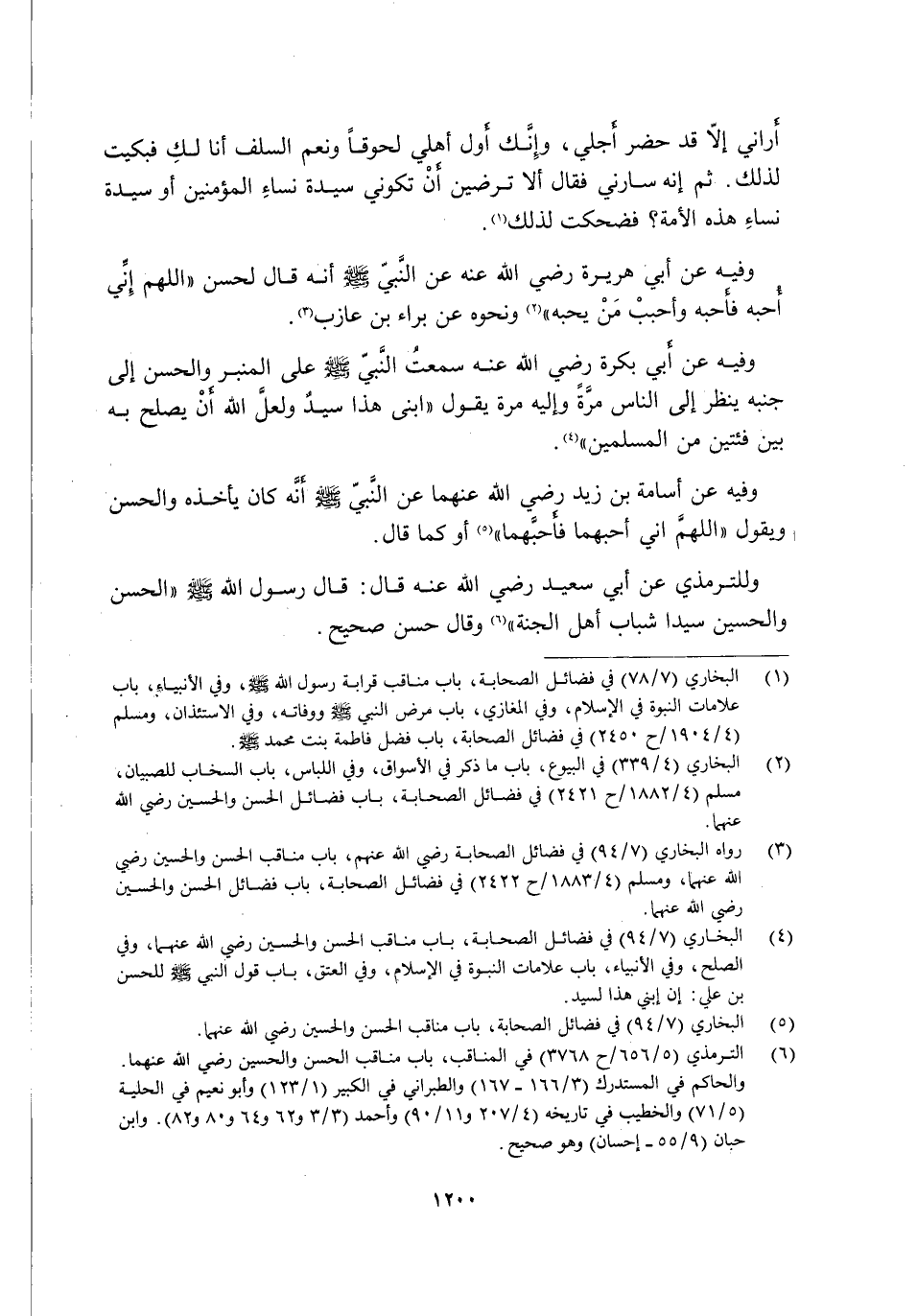 2 البخاري "4/ 339" في البيوع، باب ما ذكر في الأسواق، وفي اللباس، باب السخاب للصبيان، مسلم "4/ 1882/ ح 2421" في فضائل الصحابة، باب فضائل الحسن والحسين رضي الله عنهما.