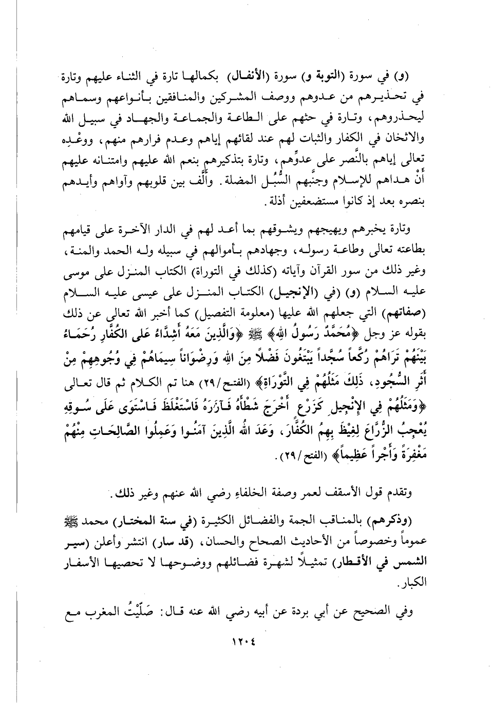 "وَذِكْرُهُمْ" بِالْمَنَاقِبِ الْجَمَّةِ وَالْفَضَائِلِ الْكَثِيرَةِ "فِي سُنَّةِ الْمُخْتَارِ" مُحَمَّدٍ -صَلَّى اللَّهُ عَلَيْهِ وَسَلَّمَ- عُمُومًا وَخُصُوصًا مِنَ الْأَحَادِيثِ الصِّحَاحِ وَالْحِسَانِ "قَدْ سَارَ" انْتَشَرَ وَأُعْلِنَ "سَيْرَ الشَّمْسِ فِي الْأَقْطَارِ" تَمْثِيلًا لِشُهْرَةِ فَضَائِلِهِمْ وَوُضُوحِهَا لَا تُحْصِيهَا الْأَسْفَارُ الْكِبَارُ.
