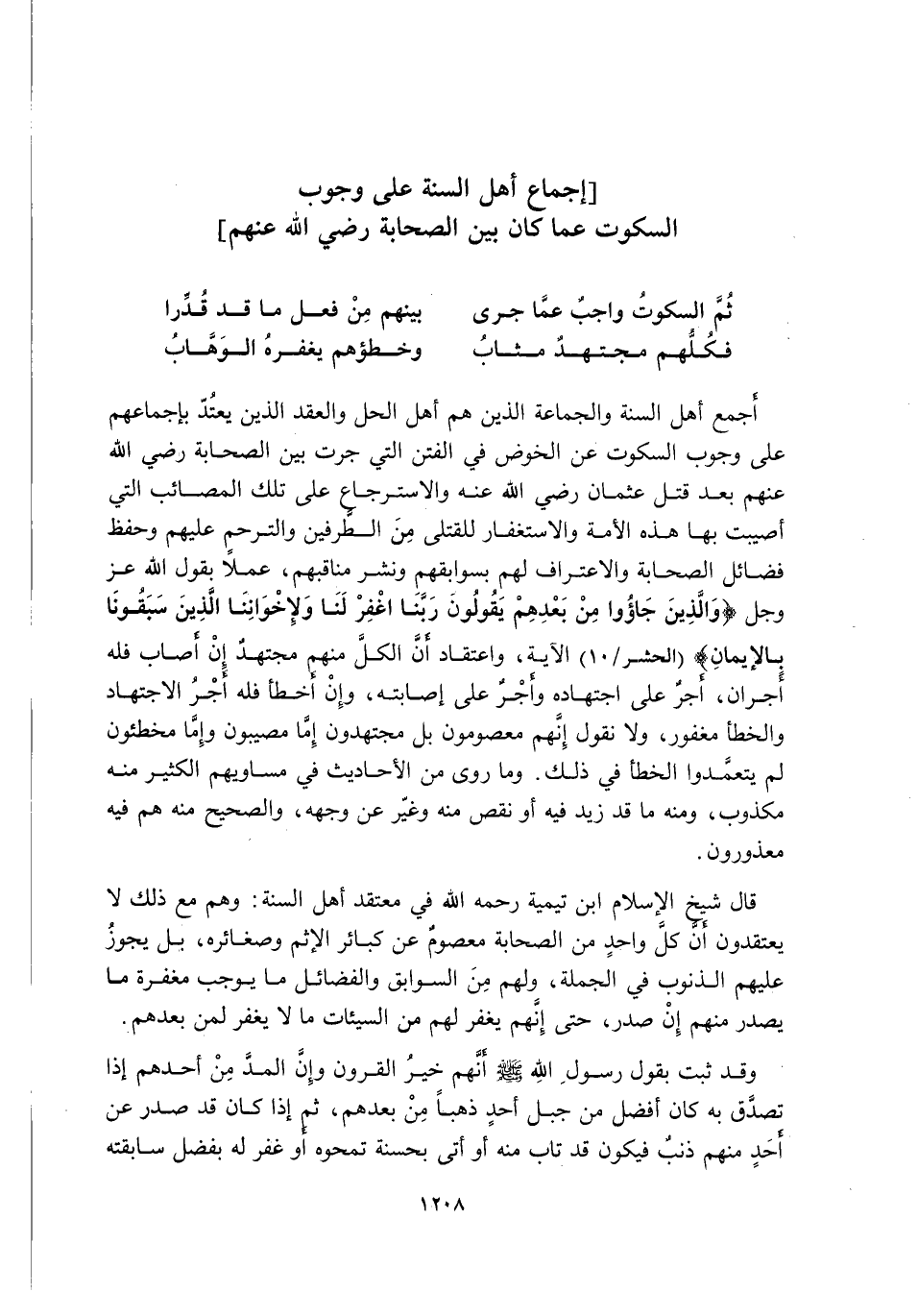 أَجْمَعَ أَهْلُ السُّنَّةِ وَالْجَمَاعَةِ الَّذِينَ هُمْ أَهْلُ الْحَلِّ وَالْعَقْدِ الَّذِينَ يُعْتَدُّ بِإِجْمَاعِهِمْ عَلَى وُجُوبِ السُّكُوتِ عَنِ الْخَوْضِ فِي الْفِتَنِ الَّتِي جَرَتْ بَيْنَ الصَّحَابَةِ رَضِيَ اللَّهُ عَنْهُمْ بَعْدَ قَتْلِ عُثْمَانَ رَضِيَ اللَّهُ عَنْهُ, وَالِاسْتِرْجَاعِ عَلَى تِلْكَ الْمَصَائِبِ الَّتِي أُصِيبَتْ بِهَا هَذِهِ الْأُمَّةُ وَالِاسْتِغْفَارِ لِلْقَتْلَى مِنَ الطَّرَفَيْنِ وَالتَّرَحُّمِ عَلَيْهِمْ وَحِفْظِ فَضَائِلِ الصَّحَابَةِ وَالِاعْتِرَافِ لَهُمْ بِسَوَابِقِهِمْ وَنَشْرِ مَنَاقِبِهِمْ, عَمَلًا بِقَوْلِ اللَّهِ عَزَّ وَجَلَّ: {وَالَّذِينَ جَاءُوا مِنْ بَعْدِهِمْ يَقُولُونَ رَبَّنَا اغْفِرْ لَنَا وَلِإِخْوَانِنَا الَّذِينَ سَبَقُونَا بِالْإِيمَانِ} [الْحَشْرِ: 10] الْآيَةَ, وَاعْتِقَادِ أَنَّ الْكُلَّ مِنْهُمْ مُجْتَهِدٌ إِنْ أَصَابَ فَلَهُ أَجْرَانِ: أَجْرٌ عَلَى اجْتِهَادِهِ وَأَجْرٌ عَلَى إِصَابَتِهِ, وَإِنْ أَخْطَأَ فَلَهُ أَجْرُ الِاجْتِهَادِ وَالْخَطَأُ مَغْفُورٌ, وَلَا نَقُولُ: إِنَّهُمْ مَعْصُومُونَ بَلْ مُجْتَهِدُونَ إِمَّا مُصِيبُونَ وَإِمَّا مُخْطِئُونَ لَمْ يَتَعَمَّدُوا الْخَطَأَ فِي ذَلِكَ, وَمَا رُوِيَ مِنَ الْأَحَادِيثِ فِي مَسَاوِيهِمُ الْكَثِيرُ مِنْهُ مَكْذُوبٌ, وَمِنْهُ مَا قَدْ زِيدَ فِيهِ أَوْ نُقِصَ مِنْهُ وَغُيِّرَ عَنْ وَجْهِهِ, وَالصَّحِيحُ مِنْهُ هُمْ فِيهِ مَعْذُورُونَ.