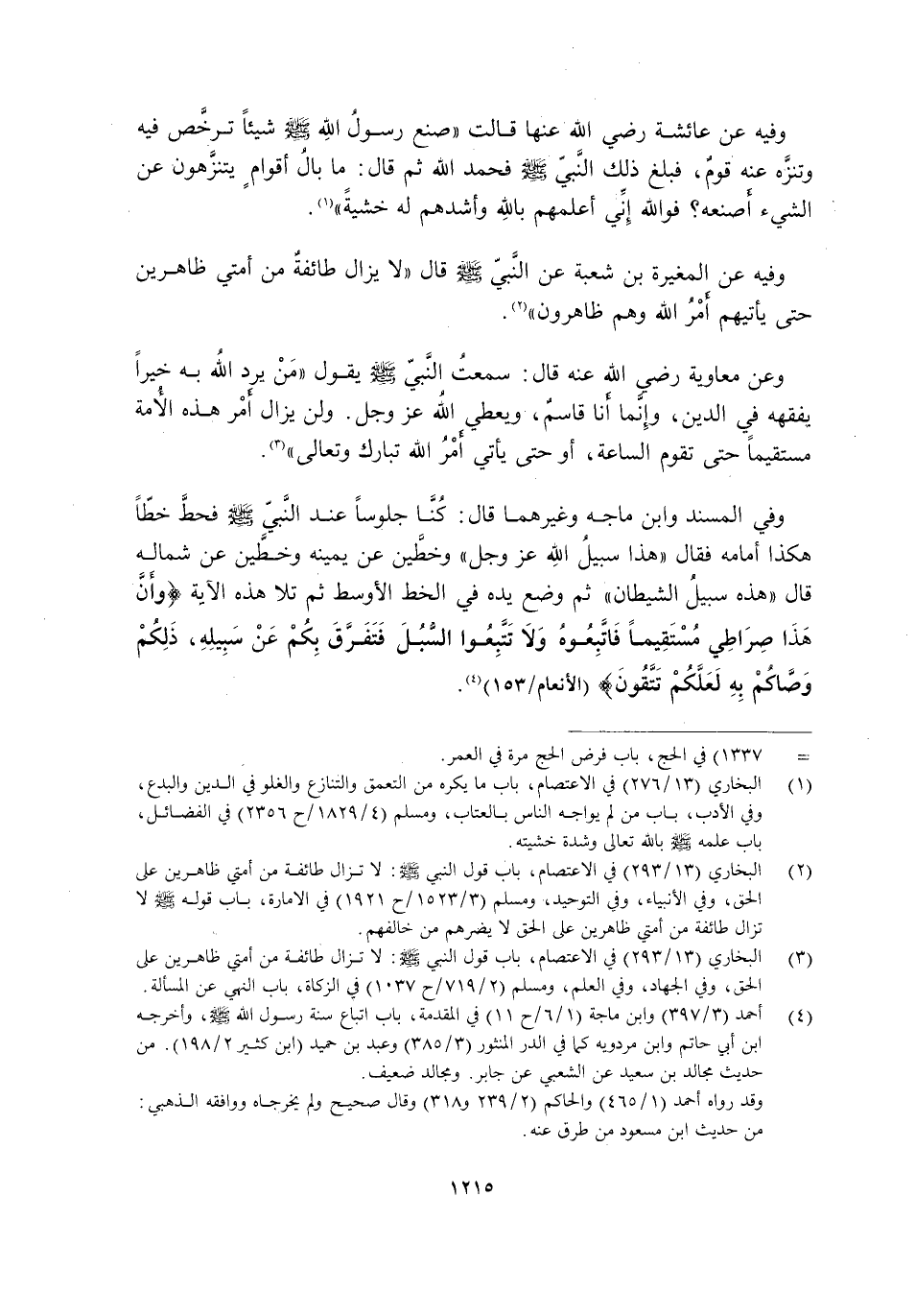 وَفِي الْمُسْنَدِ وَابْنِ مَاجَهْ وَغَيْرِهِمَا قَالَ: كُنَّا جُلُوسًا عند النبي -صَلَّى اللَّهُ عَلَيْهِ وَسَلَّمَ- فحط خَطًّا هَكَذَا أَمَامَهُ فَقَالَ: "هَذَا سَبِيلُ اللَّهِ عَزَّ وَجَلَّ" وَخَطَّيْنِ عَنْ يَمِينِهِ وَخَطَّيْنِ عَنْ شِمَالِهِ قَالَ: "هَذِهِ سَبِيلُ الشَّيْطَانِ" ثُمَّ وَضَعَ يَدَهُ فِي الْخَطِّ الْأَوْسَطِ ثُمَّ تَلَا هَذِهِ الْآيَةَ {وَأَنَّ هَذَا صِرَاطِي مُسْتَقِيمًا فَاتَّبِعُوهُ وَلَا تَتَّبِعُوا السُّبُلَ فَتَفَرَّقَ بِكُمْ عَنْ سَبِيلِهِ ذَلِكُمْ وَصَّاكُمْ بِهِ لَعَلَّكُمْ تَتَّقُونَ} [الْأَنْعَامِ: 153] 4.