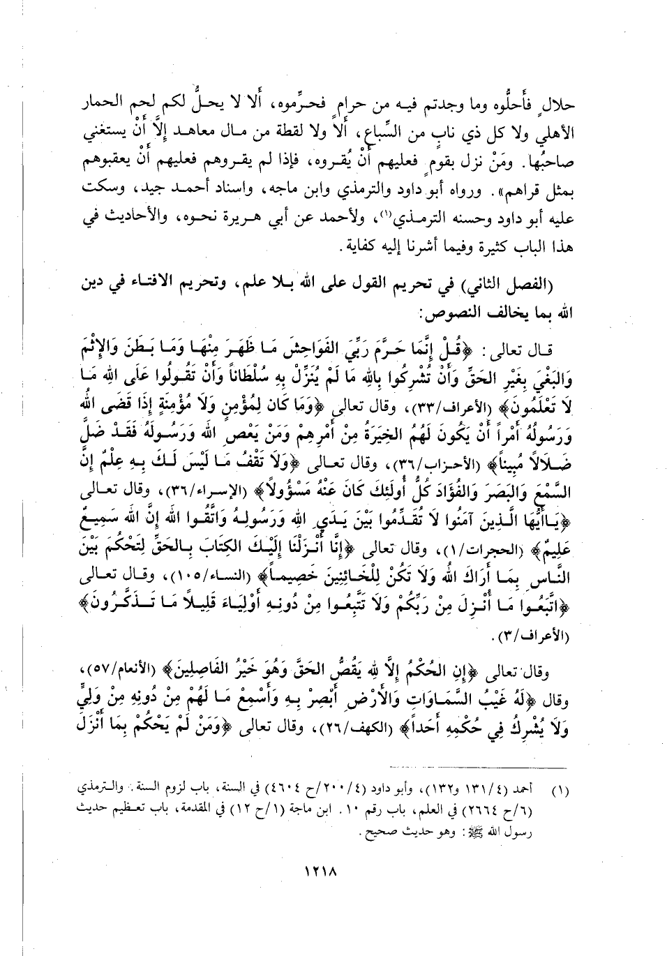 قَالَ تَعَالَى: {قُلْ إِنَّمَا حَرَّمَ رَبِّيَ الْفَوَاحِشَ مَا ظَهَرَ مِنْهَا وَمَا بَطَنَ وَالْإِثْمَ وَالْبَغْيَ بِغَيْرِ الْحَقِّ وَأَنْ تُشْرِكُوا بِاللَّهِ مَا لَمْ يُنَزِّلْ بِهِ سُلْطَانًا وَأَنْ تَقُولُوا عَلَى اللَّهِ مَا لَا تَعْلَمُونَ} [الْأَعْرَافِ: 33] وَقَالَ تَعَالَى: {وَمَا كَانَ لِمُؤْمِنٍ وَلَا مُؤْمِنَةٍ إِذَا قَضَى اللَّهُ وَرَسُولُهُ أَمْرًا أَنْ يَكُونَ لَهُمُ الْخِيَرَةُ مِنْ أَمْرِهِمْ وَمَنْ يَعْصِ اللَّهَ وَرَسُولَهُ فَقَدْ ضَلَّ ضَلَالًا مُبِينًا} [الْأَحْزَابِ: 36] وَقَالَ تَعَالَى: {وَلَا تَقْفُ مَا لَيْسَ لَكَ بِهِ عِلْمٌ إِنَّ السَّمْعَ وَالْبَصَرَ وَالْفُؤَادَ كُلُّ أُولَئِكَ كَانَ عَنْهُ مَسْؤُولًا} [الْإِسْرَاءِ: 36] وَقَالَ تَعَالَى: {يَا أَيُّهَا الَّذِينَ آمَنُوا لَا تُقَدِّمُوا بَيْنَ يَدَيِ اللَّهِ وَرَسُولِهِ وَاتَّقُوا اللَّهَ إِنَّ اللَّهَ سَمِيعٌ عَلِيمٌ} [الْحُجُرَاتِ: 1] وَقَالَ تَعَالَى: {إِنَّا أَنْزَلْنَا إِلَيْكَ الْكِتَابَ بِالْحَقِّ لِتَحْكُمَ بَيْنَ النَّاسِ بِمَا أَرَاكَ اللَّهُ وَلَا تَكُنْ لِلْخَائِنِينَ خَصِيمًا} [النِّسَاءِ: 105] وَقَالَ تَعَالَى: {اتَّبِعُوا مَا أُنْزِلَ إِلَيْكُمْ مِنْ رَبِّكُمْ وَلَا تَتَّبِعُوا مِنْ دُونِهِ أَوْلِيَاءَ قَلِيلًا مَا تَذَكَّرُونَ} [الْأَعْرَافِ: 3] .