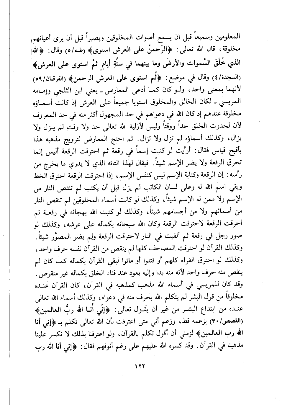 الْمَعْلُومِينَ وَسَمِيعًا قَبْلَ أَنْ يَسْمَعَ أَصْوَاتَ الْمَخْلُوقِينَ وَبَصِيرًا قَبْلَ أَنْ يَرَى أَعْيَانَهُمْ مَخْلُوقَةً قَالَ اللَّهُ تَعَالَى: {الرَّحْمَنُ عَلَى الْعَرْشِ اسْتَوَى} [طه: 5] وَقَالَ: {اللَّهُ الَّذِي خَلَقَ السَّمَاوَاتِ وَالْأَرْضَ وَمَا بَيْنَهُمَا فِي سِتَّةِ أَيَّامٍ ثُمَّ اسْتَوَى عَلَى الْعَرْشِ} [السَّجْدَةِ: 4] وَقَالَ فِي مَوْضِعٍ: {ثُمَّ اسْتَوَى عَلَى الْعَرْشِ الرَّحْمَنُ} [الْفُرْقَانِ: 59] لِأَنَّهُمَا بِمَعْنًى وَاحِدٍ وَلَوْ كَانَ كَمَا ادَّعَى الْمُعَارِضُ -يَعْنِي ابْنَ الثَّلْجِيِّ وَإِمَامَهُ الْمِرِّيسِيَّ- لَكَانَ الْخَالِقُ وَالْمَخْلُوقُ اسْتَوَيَا جَمِيعًا عَلَى الْعَرْشِ إِذْ كَانَتْ أَسْمَاؤُهُ مَخْلُوقَةً عِنْدَهُمْ إِذْ كَانَ اللَّهُ فِي دَعْوَاهُمْ فِي حَدِّ الْمَجْهُولِ أَكْثَرَ مِنْهُ فِي حَدِّ الْمَعْرُوفِ لِأَنَّ لِحُدُوثِ الْخَلْقِ حَدًّا وَوَقْتًا وَلَيْسَ لِأَزَلِيَّةِ اللَّهِ تَعَالَى حَدٌّ وَلَا وَقْتٌ لَمْ يَزَلْ وَلَا يَزَالُ وَكَذَلِكَ أَسْمَاؤُهُ لَمْ تَزَلْ وَلَا تَزَالُ. ثُمَّ احْتَجَّ الْمُعَارِضُ لِتَرْوِيجِ مَذْهَبِهِ هَذَا بِأَقْبَحِ قِيَاسٍ فَقَالَ: أَرَأَيْتَ لَوْ كَتَبْتُ اسْمًا فِي رُقْعَةٍ ثُمَّ احْتَرَقَتِ الرُّقْعَةُ أَلَيْسَ إِنَّمَا تُحْرَقُ الرُّقْعَةُ وَلَا يَضُرُّ الِاسْمُ شَيْئًا فَيُقَالُ لِهَذَا التَّائِهِ الَّذِي لَا يَدْرِي مَا يَخْرُجُ مِنْ رَأْسِهِ: إِنَّ الرُّقْعَةَ وَكِتَابَةَ الِاسْمِ لَيْسَ كَنَفْسِ الِاسْمِ إِذَا احْتَرَقَتِ الرُّقْعَةُ احْتَرَقَ الْخَطُّ وَبَقِيَ اسْمُ اللَّهِ لَهُ وَعَلَى لِسَانِ الْكَاتِبِ لَمْ يَزَلْ قَبْلَ أَنْ يَكْتُبَ لَمْ تَنْقُصِ النَّارُ مِنْ الِاسْمِ وَلَا مِمَّنْ لَهُ الِاسْمُ شَيْئًا وَكَذَلِكَ لَوْ كَانَتْ أَسْمَاءُ الْمَخْلُوقِينَ لَمْ تَنْقُصِ النَّارُ مِنْ أَسْمَائِهِمْ وَلَا مِنْ أَجْسَامِهِمْ شَيْئًا وَكَذَلِكَ لَوْ كَتَبْتَ اللَّهَ بِهِجَائِهِ فِي رُقْعَةٍ ثُمَّ أَحْرَقْتَ الرُّقْعَةَ لَاحْتَرَقَتِ الرُّقْعَةُ وَكَانَ اللَّهُ سُبْحَانَهُ بِكَمَالِهِ عَلَى عَرْشِهِ, وَكَذَلِكَ لَوْ صُوِّرَ رَجُلٌ فِي رُقْعَةٍ ثُمَّ أُلْقِيَتْ فِي النَّارِ لَاحْتَرَقَتِ الرُّقْعَةُ وَلَمْ يُضَرَّ الْمُصَوَّرُ شَيْئًا وَكَذَلِكَ الْقُرْآنُ لَوِ احْتَرَقَتِ الْمَصَاحِفُ كُلُّهَا لَمْ يَنْقُصْ مِنَ الْقُرْآنِ نَفْسِهِ حَرْفٌ وَاحِدٌ وَكَذَلِكَ لَوِ احْتَرَقَ الْقُرَّاءُ كُلُّهُمْ أَوْ قُتِلُوا أَوْ مَاتُوا لَبَقِيَ الْقُرْآنُ بِكَمَالِهِ كَمَا كَانَ لَمْ يَنْقُصْ مِنْهُ حَرْفٌ وَاحِدٌ لِأَنَّهُ مِنْهُ بَدَا وَإِلَيْهِ يَعُودُ عِنْدَ فَنَاءِ الْخَلْقِ بِكَمَالِهِ غَيْرَ مَنْقُوصٍ, وَقَدْ كَانَ لِلْمِرِّيسِيُّ فِي أَسْمَاءِ اللَّهِ مَذْهَبٌ كَمَذْهَبِهِ فِي الْقُرْآنِ كَانَ الْقُرْآنُ عِنْدَهُ مَخْلُوقًا مِنْ قَوْلِ الْبَشَرِ لَمْ يَتَكَلَّمِ اللَّهُ بِحَرْفٍ مِنْهُ فِي دَعْوَاهُ, وَكَذَلِكَ أَسْمَاءُ اللَّهِ تَعَالَى عِنْدَهُ مِنَ ابْتِدَاعِ الْبَشَرِ مِنْ غَيْرِ أَنْ يَقُولَ تَعَالَى: {إِنِّي أَنَا اللَّهُ رَبُّ الْعَالَمِينَ} [الْقَصَصِ: 30] بِزَعْمِهِ قَطُّ وَزَعَمَ أني متى اعترف بِأَنَّ اللَّهَ تَعَالَى تَكَلَّمَ بِـ {إِنِّي أَنَا اللَّهُ رَبُّ الْعَالَمِينَ} لَزِمَنِي أَنْ أَقُولَ تَكَلَّمَ بِالْقُرْآنِ وَلَوِ اعْتَرَفْنَا بِذَلِكَ لَانْكَسَرَ عَلَيْنَا مَذْهَبُنَا فِي الْقُرْآنِ, وقد كسره الله عَلَيْهِمْ عَلَى رَغْمِ أُنُوفِهِمْ فَقَالَ: {إِنِّي أَنَا اللَّهُ رَبُّ