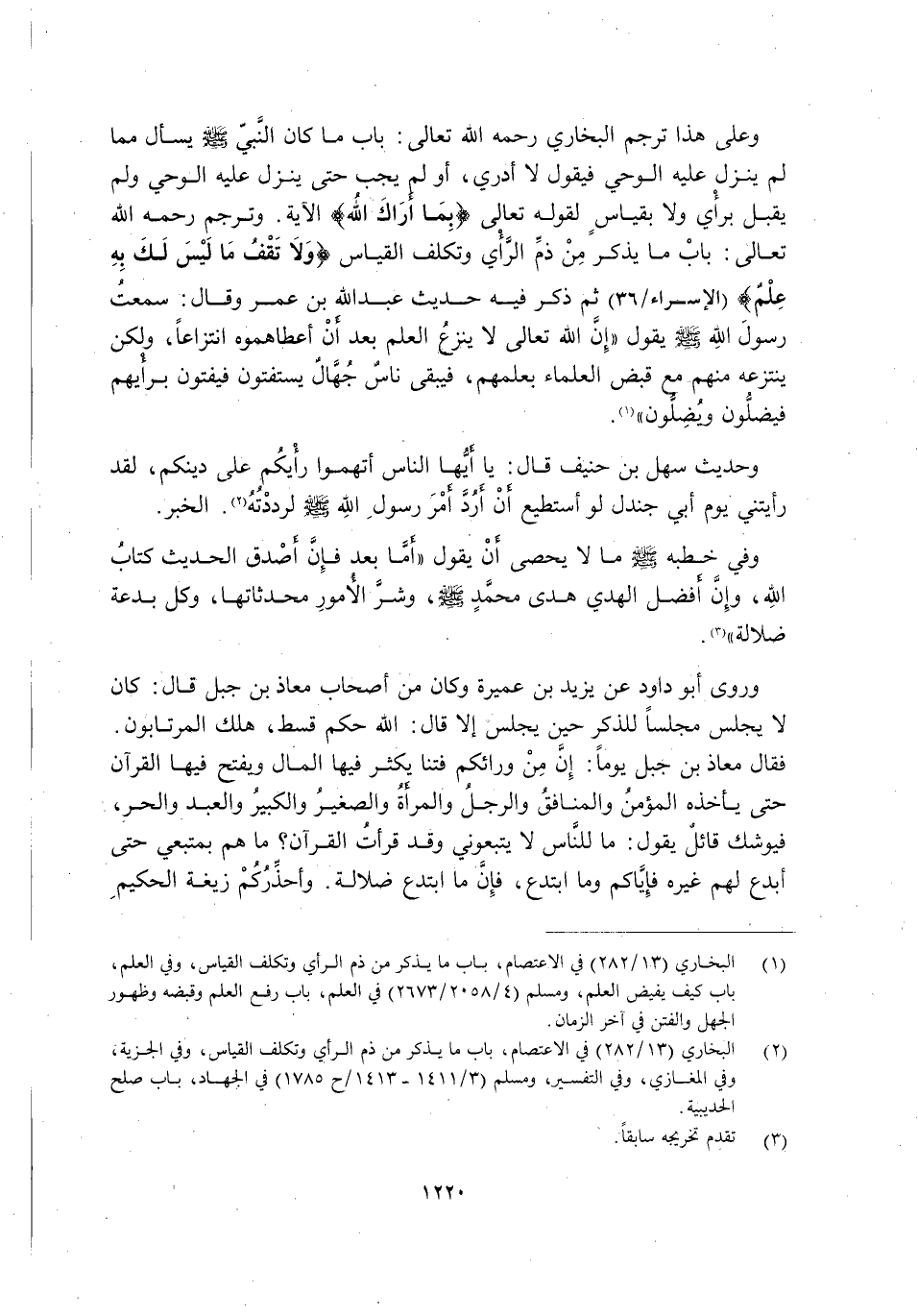 وَعَلَى هَذَا تَرْجَمَ الْبُخَارِيُّ رَحِمَهُ اللَّهُ تَعَالَى: بَابَ مَا كَانَ النَّبِيُّ -صَلَّى اللَّهُ عَلَيْهِ وَسَلَّمَ- يُسْأَلُ مِمَّا لَمْ يَنْزِلْ عَلَيْهِ الْوَحْيُ فَيَقُولُ: "لَا أَدْرِي", أَوْ لَمْ يُجِبْ حَتَّى يَنْزِلَ عَلَيْهِ الْوَحْيُ, وَلَمْ يَقْبَلْ بِرَأْيٍ وَلَا بِقِيَاسٍ لِقَوْلِهِ تَعَالَى: {بِمَا أَرَاكَ اللَّهُ} الْآيَةَ. وَتَرْجَمَ رَحِمَهُ اللَّهُ تَعَالَى: بَابَ مَا يُذْكَرُ مِنْ ذَمِّ الرَّأْيِ وَتَكَلُّفِ الْقِيَاسِ {وَلَا تَقْفُ مَا لَيْسَ لَكَ بِهِ عِلْمٌ} [الْإِسْرَاءِ: 36] ثُمَّ ذَكَرَ فِيهِ حَدِيثَ عَبْدِ اللَّهِ بْنِ عُمَرَ وَقَالَ: سَمِعْتُ رَسُولَ اللَّهِ -صَلَّى اللَّهُ عَلَيْهِ وَسَلَّمَ- يَقُولُ: "إِنَّ اللَّهَ تَعَالَى لَا يَنْزِعُ الْعِلْمَ بَعْدَ أَنْ أَعْطَاهُمُوهُ انْتِزَاعًا, وَلَكِنْ يَنْتَزِعُهُ مِنْهُمْ مَعَ قَبْضِ الْعُلَمَاءِ بِعِلْمِهِمْ, فَيَبْقَى نَاسٌ جهال يستفتون فيفتون بِرَأْيِهِمْ فَيَضِلُّونَ وَيُضِلُّونَ" 1.