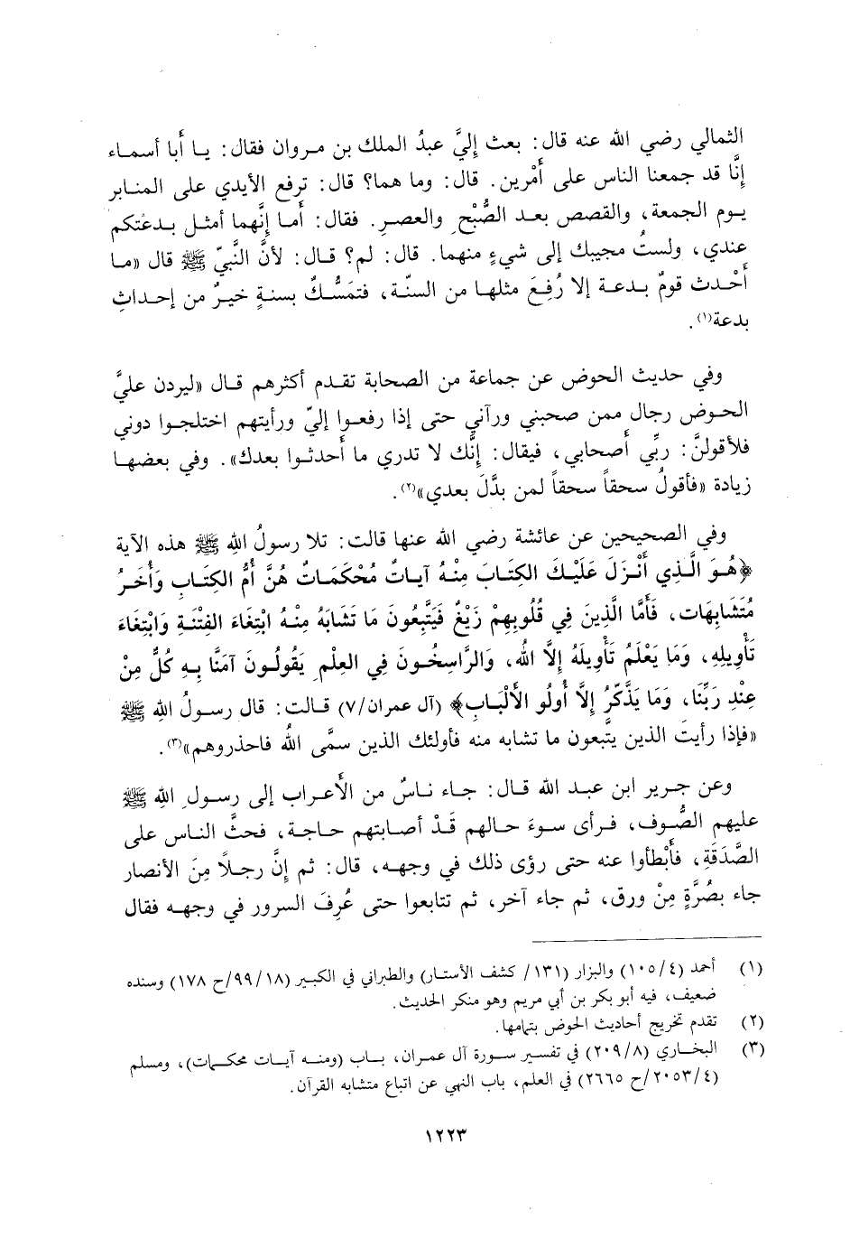 وَفِي حَدِيثِ الْحَوْضِ عَنْ جَمَاعَةٍ مِنَ الصَّحَابَةِ تَقَدَّمَ أَكْثَرُهُمْ قَالَ: "لَيَرِدَنَّ عَلَى الْحَوْضِ رِجَالٌ مِمَّنْ صَحِبَنِي وَرَآنِي حَتَّى إِذَا رُفِعُوا إِلَيَّ وَرَأَيْتُهُمْ اخْتَلَجُوا دُونِي فَلْأَقُولَنَّ: رَبِّي أَصْحَابِي، فَيُقَالُ: إِنَّكَ لَا تَدْرِي مَا أَحْدَثُوا بَعْدَكَ". وَفِي بَعْضِهَا زِيَادَةٌ "فَأَقُولُ: سُحْقًا سُحْقًا لِمَنْ بَدَّلَ بَعْدِي" 2.
