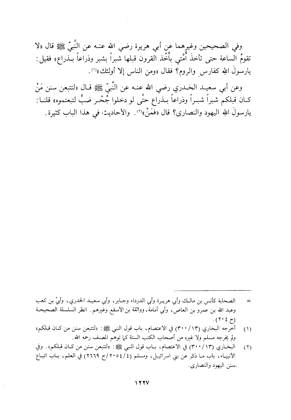 1 أخرجه البخاري "13/ 300" في الاعتصام، باب قول النبي, صَلَّى اللَّهُ عَلَيْهِ وَسَلَّمَ: "لتتبعن سنن من كان قبلكم" ولم يخرجه مسلم ولا غيره من أصحاب الكتب الستة كما توهم المصنف رحمه الله.