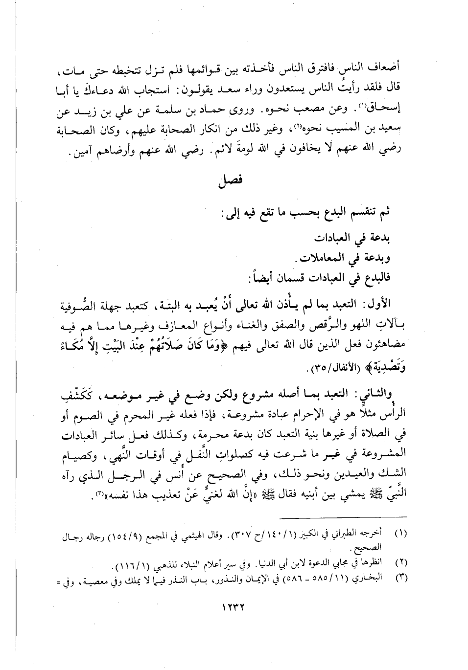 وَالثَّانِي: التَّعَبُّدُ بِمَا أَصْلُهُ مَشْرُوعٌ وَلَكِنْ وُضِعَ فِي غَيْرِ مَوْضِعِهِ، كَكَشْفِ الرَّأْسِ مَثَلًا هُوَ فِي الْإِحْرَامِ عِبَادَةٌ مَشْرُوعَةٌ، فَإِذَا فَعَلَهُ غَيْرُ الْمُحْرِمِ فِي الصَّوْمِ أَوْ فِي الصَّلَاةِ أَوْ غَيْرِهَا بِنِيَّةِ التَّعَبُّدِ كَانَ بِدْعَةً مُحَرَّمَةً، وَكَذَلِكَ فِعْلُ سَائِرِ الْعِبَادَاتِ الْمَشْرُوعَةِ فِي غَيْرِ مَا شُرِعَتْ فِيهِ كَصَلَوَاتِ النَّفْلِ فِي أَوْقَاتِ النَّهْيِ، وَكَصِيَامِ الشَّكِّ وَالْعِيدَيْنِ وَنَحْوِ ذَلِكَ، وَفِي الصَّحِيحِ عَنْ أَنَسٍ فِي الرَّجُلِ الَّذِي رَآهُ النَّبِيُّ -صَلَّى اللَّهُ عَلَيْهِ وَسَلَّمَ- يَمْشِي بَيْنَ ابْنَيْهِ فَقَالَ, صَلَّى اللَّهُ عَلَيْهِ وَسَلَّمَ: "إِنَّ اللَّهَ لَغَنِيٌّ عَنْ تَعْذِيبِ هَذَا نَفْسَهُ" 3.