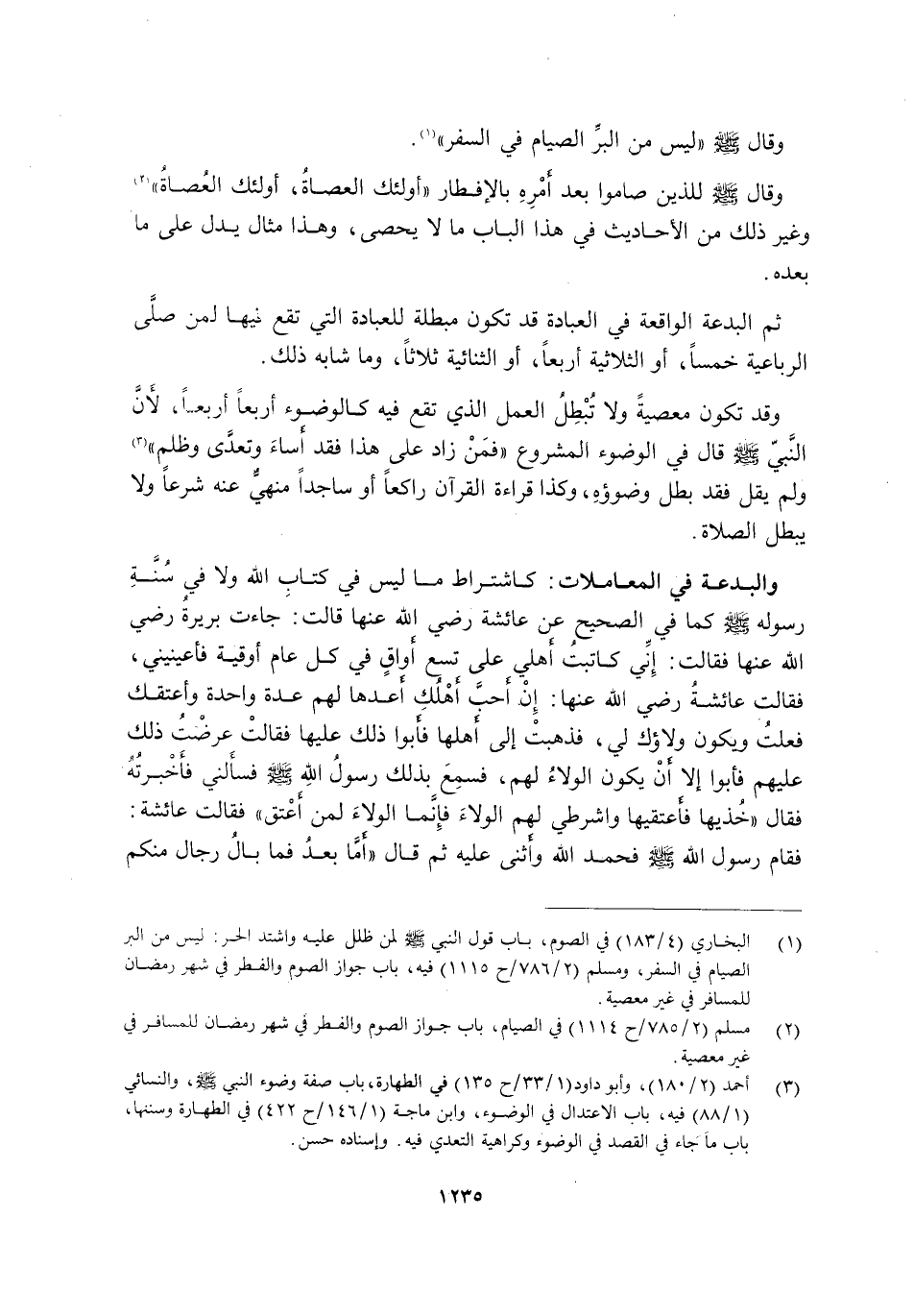 وَالْبِدْعَةُ فِي الْمُعَامَلَاتِ: كَاشْتِرَاطِ مَا لَيْسَ فِي كِتَابِ اللَّهِ وَلَا فِي سُنَّةِ رَسُولِهِ -صَلَّى اللَّهُ عَلَيْهِ وَسَلَّمَ- كَمَا فِي الصَّحِيحِ عَنْ عَائِشَةَ رَضِيَ اللَّهُ عَنْهَا قَالَتْ: جَاءَتْ بَرِيرَةُ رَضِيَ اللَّهُ عَنْهَا فَقَالَتْ: إِنِّي كَاتَبْتُ أَهْلِي عَلَى تِسْعِ أَوَاقٍ فِي كُلِّ عَامٍ أُوقِيَّةٌ فَأَعِينِينِي، فَقَالَتْ عَائِشَةُ رَضِيَ اللَّهُ عَنْهَا: إِنْ أَحَبَّ أَهْلُكِ أَعُدُّهَا لَهُمْ عَدَّةً وَاحِدَةً وَأُعْتِقُكِ فَعَلْتُ وَيَكُونُ وَلَاؤُكِ لِي، فَذَهَبَتْ إِلَى أَهْلِهَا؛ فَأَبَوْا ذَلِكَ عَلَيْهَا. فَقَالَتْ: عَرَضْتُ ذَلِكَ عَلَيْهِمْ فَأَبَوْا إِلَّا أَنْ يَكُونَ الْوَلَاءُ لَهُمْ, فَسَمِعَ بِذَلِكَ رَسُولُ اللَّهِ -صَلَّى اللَّهُ عَلَيْهِ وَسَلَّمَ- فَسَأَلَنِي فَأَخْبَرْتُهُ فَقَالَ: "خُذِيهَا فَأَعْتِقِيهَا وَاشْرُطِي لَهُمُ الْوَلَاءَ فَإِنَّمَا الْوَلَاءُ لِمَنْ أَعْتَقَ" فَقَالَتْ عَائِشَةُ: فَقَامَ رَسُولُ اللَّهِ -صَلَّى اللَّهُ عَلَيْهِ وَسَلَّمَ- فَحَمِدَ اللَّهَ وَأَثْنَى عَلَيْهِ ثُمَّ قَالَ: "أَمَّا بَعْدُ فَمَا بَالُ رِجَالٍ مِنْكُمْ