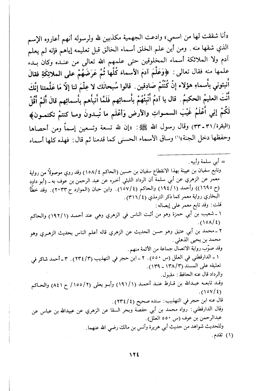 "أَنَا شَقَقْتُ لَهَا مِنَ اسْمِي" وَادَّعَتِ الْجَهْمِيَّةُ مُكَذِّبِينَ لِلَّهِ وَلِرَسُولِهِ أَنَّهُمْ أَعَارُوهُ الِاسْمَ الَّذِي شَقَّهَا مِنْهُ. وَمِنْ أَيْنَ عَلِمَ الْخَلْقُ أَسْمَاءَ الْخَالِقِ قَبْلَ تَعْلِيمِهِ إِيَّاهُمْ فَإِنَّهُ لَمْ يَعْلَمْ آدَمُ وَلَا الْمَلَائِكَةُ أَسْمَاءَ الْمَخْلُوقِينَ حَتَّى عَلَّمَهُمُ اللَّهُ تَعَالَى مِنْ عِنْدِهِ وَكَانَ بَدْءُ عِلْمِهَا مِنْهُ فَقَالَ تَعَالَى: {وَعَلَّمَ آدَمَ الْأَسْمَاءَ كُلَّهَا ثُمَّ عَرَضَهُمْ عَلَى الْمَلَائِكَةِ فَقَالَ أَنْبِئُونِي بِأَسْمَاءِ هَؤُلَاءِ إِنْ كُنْتُمْ صَادِقِينَ، قَالُوا سُبْحَانَكَ لَا عِلْمَ لَنَا إِلَّا مَا عَلَّمْتَنَا إِنَّكَ أَنْتَ الْعَلِيمُ الْحَكِيمُ، قَالَ يَا آدَمُ أَنْبِئْهُمْ بِأَسْمَائِهِمْ فَلَمَّا أَنْبَأَهُمْ بِأَسْمَائِهِمْ قَالَ أَلَمْ أَقُلْ لَكُمْ إِنِّي أَعْلَمُ غَيْبَ السَّمَاوَاتِ وَالْأَرْضِ وَأَعْلَمُ مَا تُبْدُونَ وَمَا كُنْتُمْ تَكْتُمُونَ} [الْبَقَرَةِ: 31-33] وَقَالَ رَسُولُ اللَّهِ صَلَّى اللَّهُ عَلَيْهِ وَسَلَّمَ: "إِنَّ لِلَّهِ تِسْعَةً وَتِسْعِينَ اسْمًا وَمَنْ أَحْصَاهَا وَحَفِظَهَا دَخَلَ الْجَنَّةَ" 1 وَسَاقَ الْأَسْمَاءَ الْحُسْنَى كَمَا قَدَّمْنَا ثُمَّ قَالَ: فَهَذِهِ كُلُّهَا أَسْمَاءُ