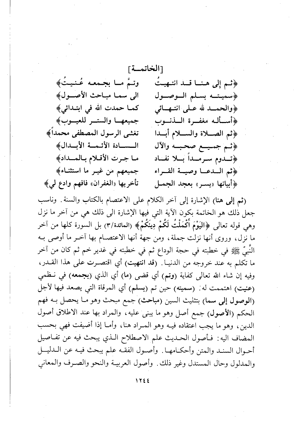 "ثُمَّ إِلَى هُنَا" الْإِشَارَةُ إِلَى آخِرِ الْكَلَامِ عَلَى الِاعْتِصَامِ بِالْكِتَابِ وَالسُّنَّةِ. وَنَاسَبَ جَعْلُ ذَلِكَ هُوَ الْخَاتِمَةُ بِكَوْنِ الْآيَةِ الَّتِي فِيهَا الْإِشَارَةُ إِلَى ذَلِكَ هِيَ مِنْ آخِرِ مَا نَزَلْ وهي قوله تعالى: {الْيَوْمَ أَكْمَلْتُ لَكُمْ دِينَكُمْ} [الْمَائِدَةِ: 3] بَلِ السُّورَةُ كُلُّهَا مِنْ آخِرِ مَا نَزَلَ، وَرُوِيَ أَنَّهَا نَزَلَتْ جُمْلَةً، وَمِنْ جِهَةِ أَنَّ الِاعْتِصَامَ بِهَا آخَرُ مَا أَوْصَى بِهِ النَّبِيُّ -صَلَّى اللَّهُ عَلَيْهِ وَسَلَّمَ- فِي خُطْبَتِهِ فِي حَجَّةِ الْوَدَاعِ ثُمَّ فِي خُطْبَتِهِ فِي غَدِيرِ خُمٍّ ثُمَّ كَانَ مِنْ آخِرِ مَا تَكَلَّمَ بِهِ عِنْدَ خُرُوجِهِ مِنَ الدُّنْيَا. "قَدِ انْتَهَيْتُ" أَيِ: اقْتَصَرْتُ عَلَى هَذَا الْقَدْرِ، وَفِيهِ إِنْ شَاءَ اللَّهُ تَعَالَى كِفَايَةٌ "وَتَمَّ" أَيْ: قَضَى "مَا" أَيِ: الَّذِي "بِجَمْعِهِ" فِي نَظْمِي "عُنِيتُ" اهْتَمَمْتُ لَهُ. "سَمَّيْتُهُ" حِينَ تَمَّ "بِسُلَّمِ" أَيِ: الْمِرْقَاةِ الَّتِي يُصْعَدُ فِيهَا لِأَجَلِ "الْوُصُولِ إِلَى سَمَا" بِتَثْلِيثِ السِّينِ "مَبَاحِثِ" جَمْعُ مَبْحَثٍ وَهُوَ مَا يَحْصُلُ بِهِ فَهْمُ الحكم "الأصول" حمع أَصْلٍ وَهُوَ مَا يُبْنَى عَلَيْهِ, وَالْمُرَادُ بِهَا عِنْدَ الْإِطْلَاقِ أُصُولِ الدِّينِ، وَهُوَ مَا يجب اعتقاده فيه وَهُوَ الْمُرَادُ هُنَا، وَأَمَّا إِذَا أُضِيفَتْ فَهِيَ بِحَسَبِ الْمُضَافِ إِلَيْهِ: فَأُصُولُ الْحَدِيثِ عِلْمُ الِاصْطِلَاحِ الَّذِي يُبْحَثُ فِيهِ عَنْ تَفَاصِيلِ أَحْوَالِ السَّنَدِ وَالْمَتْنِ وَأَحْكَامِهَا. وَأُصُولُ الْفِقْهِ عِلْمٌ يُبْحَثُ فِيهِ عَنِ الدَّلِيلِ وَالْمَدْلُولِ وَحَالِ الْمُسْتَدِلِّ وَغَيْرِ ذَلِكَ. وَأُصُولُ الْعَرَبِيَّةِ وَالنَّحْوِ وَالصَّرْفِ وَالْمَعَانِي.