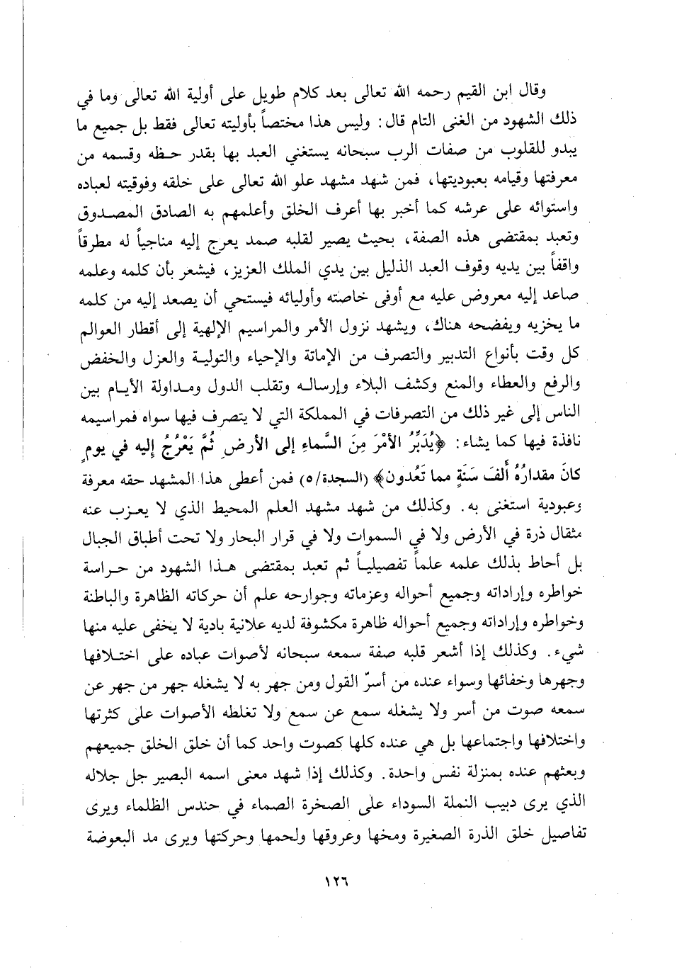 وَقَالَ ابْنُ الْقَيِّمِ رَحِمَهُ اللَّهُ تَعَالَى بَعْدَ كَلَامٍ طويل على أولية اللَّهِ تَعَالَى وَمَا فِي ذَلِكَ الشُّهُودِ مِنَ الْغِنَى التَّامِّ قَالَ: وَلَيْسَ هَذَا مُخْتَصًّا بِأَوَّلِيَّتِهِ تَعَالَى فَقَطْ بَلْ جَمِيعُ مَا يَبْدُو لِلْقُلُوبِ مِنْ صِفَاتِ الرَّبِّ سُبْحَانَهُ يَسْتَغْنِي الْعَبْدُ بِهَا بِقَدْرِ حَظِّهِ وَقِسْمِهِ مِنْ مَعْرِفَتِهَا وَقِيَامِهِ بِعُبُودِيَّتِهَا, فَمَنْ شَهِدَ مَشْهَدَ عُلُوِّ اللَّهِ تَعَالَى عَلَى خَلْقِهِ وَفَوْقِيَّتِهِ لِعِبَادِهِ وَاسْتِوَائِهِ عَلَى عَرْشِهِ كَمَا أَخْبَرَ بِهَا أَعْرَفُ الْخَلْقِ وَأَعْلَمُهُمْ بِهِ الصَّادِقُ الْمَصْدُوقُ وَتَعَبَّدَ بِمُقْتَضَى هَذِهِ الصِّفَةِ, بِحَيْثُ يَصِيرُ لِقَلْبِهِ صَمَدٌ يَعْرُجُ إِلَيْهِ مُنَاجِيًا لَهُ مُطْرِقًا وَاقِفًا بَيْنَ يَدَيْهِ وُقُوفَ الْعَبْدِ الذَّلِيلِ بَيْنَ يَدَيِ الْمَلِكِ الْعَزِيزِ, فَيَشْعُرُ بِأَنَّ كَلِمَهُ وَعِلْمَهُ صَاعِدٌ إِلَيْهِ مَعْرُوضٌ عَلَيْهِ مَعَ أَوْفَى خَاصَّتِهِ وَأَوْلِيَائِهِ فَيَسْتَحِي أَنْ يَصْعَدَ إِلَيْهِ مِنْ كَلِمِهِ مَا يُخْزِيهِ وَيَفْضَحُهُ هُنَاكَ وَيَشْهَدُ نُزُولَ الْأَمْرِ وَالْمَرَاسِيمِ الْإِلَهِيَّةِ إِلَى أَقْطَارِ الْعَوَالِمِ كُلَّ وَقْتٍ بِأَنْوَاعِ التَّدْبِيرِ وَالتَّصَرُّفِ مِنَ الْإِمَاتَةِ وَالْإِحْيَاءِ وَالتَّوْلِيَةِ وَالْعَزْلِ وَالْخَفْضِ وَالرَّفْعِ وَالْعَطَاءِ وَالْمَنْعِ وَكَشْفِ الْبَلَاءِ وَإِرْسَالِهِ وَتَقَلُّبِ الدُّوَلِ وَمُدَاوَلَةِ الْأَيَّامِ بَيْنَ النَّاسِ إِلَى غَيْرِ ذَلِكَ مِنَ التَّصَرُّفَاتِ فِي الْمَمْلَكَةِ الَّتِي لَا يَتَصَرَّفُ فِيهَا سِوَاهُ فَمَرَاسِيمُهُ نَافِذَةٌ فِيهَا كَمَا يَشَاءُ: {يُدَبِّرُ الْأَمْرَ مِنَ السَّمَاءِ إِلَى الْأَرْضِ ثُمَّ يَعْرُجُ إِلَيْهِ فِي يَوْمٍ كَانَ مِقْدَارُهُ أَلْفَ سَنَةٍ مِمَّا تَعُدُّونَ} [السَّجْدَةِ: 5] فَمَنْ أَعْطَى هَذَا الْمَشْهَدَ حَقَّهُ مَعْرِفَةً وَعُبُودِيَّةً اسْتَغْنَى بِهِ. وَكَذَلِكَ مَنْ شَهِدَ مَشْهَدَ الْعِلْمِ الْمُحِيطِ الَّذِي لَا يَعْزُبُ عَنْهُ مِثْقَالُ ذَرَّةٍ فِي الْأَرْضِ ولا في السموات وَلَا فِي قَرَارِ الْبِحَارِ وَلَا تَحْتَ أَطْبَاقِ الْجِبَالِ بَلْ أَحَاطَ بِذَلِكَ عِلْمُهُ عِلْمًا تَفْصِيلِيًّا ثُمَّ تَعَبَّدَ بِمُقْتَضَى هَذَا الشُّهُودِ مِنْ حراسة خواطره وإراداته وَجَمِيعِ أَحْوَالِهِ وَعَزَمَاتِهِ وَجَوَارِحِهِ عَلِمَ أَنَّ حَرَكَاتِهِ الظَّاهِرَةَ والباطنة وخواطره وإراداته وَجَمِيعُ أَحْوَالِهِ ظَاهِرَةٌ مَكْشُوفَةٌ لَدَيْهِ عَلَانِيَةً بَادِيَةٌ لَا يَخْفَى عَلَيْهِ مِنْهَا شَيْءٌ. وَكَذَلِكَ إِذَا أَشْعَرَ قَلْبَهُ صِفَةَ سَمْعِهِ سُبْحَانَهُ لِأَصْوَاتِ عِبَادِهِ عَلَى اخْتِلَافِهَا وَجَهْرِهَا وَخَفَائِهَا وَسَوَاءٌ عِنْدَهُ مَنْ أَسَرَّ الْقَوْلَ وَمَنْ جَهَرَ بِهِ لا يشغله حهر مَنْ جَهَرَ عَنْ سَمْعِهِ صَوْتَ مَنْ أَسَرَّ وَلَا يَشْغَلُهُ سَمْعٌ عَنْ سَمْعٍ وَلَا تُغَلِّطُهُ الْأَصْوَاتُ عَلَى كَثْرَتِهَا واختلافها واجتماعها بل هي عِنْدَهُ كُلُّهَا كَصَوْتٍ وَاحِدٍ كَمَا أَنَّ خَلْقَ الْخَلْقِ جَمِيعِهِمْ وَبَعْثَهُمْ عِنْدَهُ بِمَنْزِلَةِ نَفْسٍ وَاحِدَةٍ. وَكَذَلِكَ إِذَا شَهِدَ مَعْنَى اسْمِهِ الْبَصِيرِ جَلَّ جَلَالُهُ الَّذِي يَرَى دَبِيبَ النَّمْلَةِ السَّوْدَاءِ عَلَى الصَّخْرَةِ الصَّمَّاءِ فِي حِنْدِسِ الظَّلْمَاءِ وَيَرَى تَفَاصِيلَ خَلْقِ الذَّرَّةِ الصَّغِيرَةِ وَمُخَّهَا وَعُرُوقَهَا وَلَحْمَهَا وَحَرَكَتِهَا وَيَرَى مَدَّ الْبَعُوضَةِ