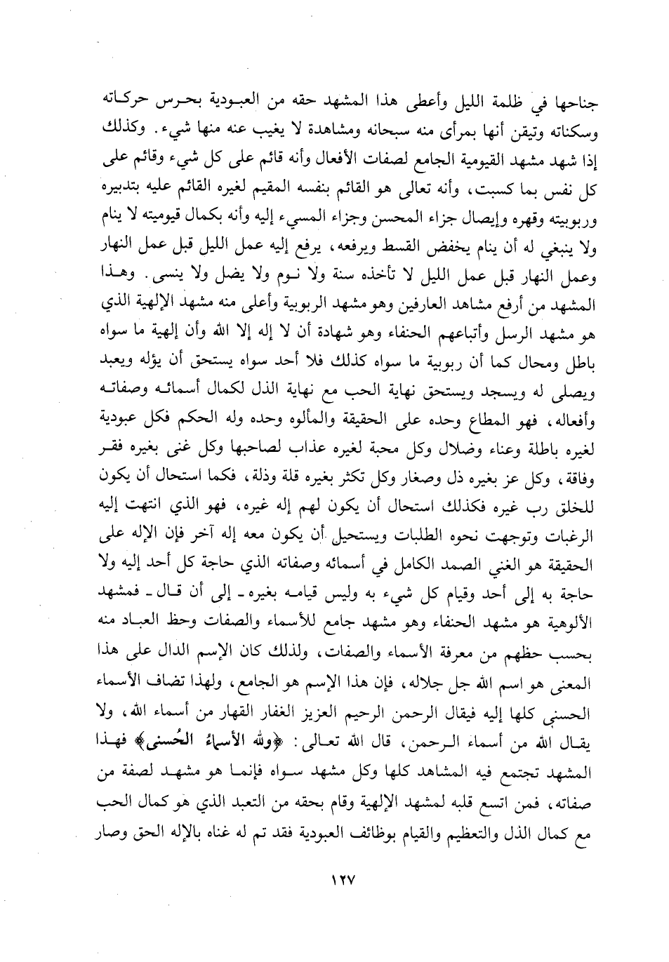 جَنَاحَهَا فِي ظُلْمَةِ اللَّيْلِ وَأَعْطَى هَذَا الْمَشْهَدَ حَقَّهُ مِنَ الْعُبُودِيَّةِ بِحَرْسِ حَرَكَاتِهِ وَسَكَنَاتِهِ وَتَيَقَّنَ أَنَّهَا بِمَرْأًى مِنْهُ سُبْحَانَهُ وَمُشَاهَدَةٍ لَا يَغِيبُ عَنْهُ مِنْهَا شَيْءٌ. وَكَذَلِكَ إِذَا شَهِدَ مَشْهَدَ الْقَيُّومِيَّةِ الْجَامِعَ لِصِفَاتِ الْأَفْعَالِ وَأَنَّهُ قَائِمٌ عَلَى كُلِّ شَيْءٍ وَقَائِمٌ عَلَى كُلِّ نَفْسٍ بِمَا كَسَبَتْ. وَأَنَّهُ تَعَالَى هُوَ الْقَائِمُ بِنَفْسِهِ الْمُقِيمُ لِغَيْرِهِ الْقَائِمُ عَلَيْهِ بِتَدْبِيرِهِ وَرُبُوبِيَّتِهِ وَقَهْرِهِ وَإِيصَالِ جَزَاءِ الْمُحْسِنِ وَجَزَاءِ الْمُسِيءِ إليه وأنه بكمال قَيُّومِيَّتِهِ لَا يَنَامُ وَلَا يَنْبَغِي لَهُ أَنْ يَنَامَ يَخْفِضُ الْقِسْطَ وَيَرْفَعُهُ, يُرْفَعُ إِلَيْهِ عَمَلُ اللَّيْلِ قَبْلَ عَمَلِ النَّهَارِ وَعَمَلُ النَّهَارِ قَبْلَ عَمَلِ اللَّيْلِ لَا تَأْخُذُهُ سِنَةٌ وَلَا نَوْمٌ وَلَا يَضِلُّ وَلَا يَنْسَى. وَهَذَا الْمَشْهَدُ مِنْ أَرْفَعِ مَشَاهِدِ الْعَارِفِينَ وَهُوَ مَشْهَدُ الرُّبُوبِيَّةِ وَأَعْلَى مِنْهُ مَشْهَدُ الْإِلَهِيَّةِ الَّذِي هُوَ مَشْهَدُ الرُّسُلِ وَأَتْبَاعِهِمُ الْحُنَفَاءِ وَهُوَ شَهَادَةُ أَنْ لَا إِلَهَ إِلَّا اللَّهُ وَأَنَّ إِلَهِيَّةَ مَا سِوَاهُ بَاطِلٌ وَمُحَالٌ كَمَا أَنَّ رُبُوبِيَّةَ مَا سِوَاهُ كَذَلِكَ فَلَا أحد سواه يسحق أَنْ يُؤَلَّهَ وَيُعْبَدَ وَيُصَلَّى لَهُ وَيُسْجَدَ وَيَسْتَحِقَّ نِهَايَةَ الْحُبِّ مَعَ نِهَايَةِ الذُّلِّ لِكَمَالِ أَسْمَائِهِ وَصِفَاتِهِ وَأَفْعَالِهِ. فَهُوَ الْمُطَاعُ وَحْدَهُ عَلَى الْحَقِيقَةِ وَالْمَأْلُوهُ وَحْدَهُ وَلَهُ الْحُكْمُ فَكُلُّ عُبُودِيَّةٍ لِغَيْرِهِ بَاطِلَةٌ وَعَنَاءٌ وَضَلَالٌ وَكُلُّ مَحَبَّةٍ لِغَيْرِهِ عَذَابٌ لِصَاحِبِهَا وَكُلُّ غِنًى بِغَيْرِهِ فَقْرٌ وَفَاقَةٌ, وَكُلُّ عِزٍّ بِغَيْرِهِ ذُلٌّ وَصَغَارٌ وَكُلُّ تَكَثُّرٍ بِغَيْرِهِ قِلَّةٌ وَذِلَّةٌ, فَكَمَا اسْتَحَالَ أَنْ يَكُونَ لِلْخَلْقِ رَبٌّ غَيْرُهُ فَكَذَلِكَ اسْتَحَالَ أَنْ يَكُونَ لَهُمْ إِلَهٌ غَيْرُهُ, فَهُوَ الَّذِي انْتَهَتْ إِلَيْهِ الرَّغَبَاتُ وَتَوَجَّهَتْ نَحْوَهُ الطَّلَبَاتُ وَيَسْتَحِيلُ أَنْ يَكُونَ مَعَهُ إِلَهٌ آخَرُ فَإِنَّ الْإِلَهَ عَلَى الْحَقِيقَةِ هُوَ الْغَنِيُّ الصَّمَدُ الْكَامِلُ فِي أَسْمَائِهِ وَصِفَاتِهِ الَّذِي حَاجَةُ كُلِّ أَحَدٍ إِلَيْهِ وَلَا حَاجَةَ بِهِ إِلَى أَحَدٍ وَقِيَامُ كُلِّ شَيْءٍ بِهِ وَلَيْسَ قِيَامُهُ بِغَيْرِهِ -إِلَى أَنْ قَالَ- فَمَشْهَدُ الْأُلُوهِيَّةِ هُوَ مَشْهَدُ الْحُنَفَاءِ وَهُوَ مَشْهَدٌ جَامِعٌ لِلْأَسْمَاءِ وَالصِّفَاتِ وَحَظُّ الْعِبَادِ مِنْهُ بِحَسَبِ حَظِّهِمْ مِنْ مَعْرِفَةِ الْأَسْمَاءِ وَالصِّفَاتِ, وَلِذَلِكَ كَانَ الِاسْمُ الدَّالُّ عَلَى هَذَا الْمَعْنَى هُوَ اسْمَ اللَّهِ جَلَّ جَلَالُهُ فَإِنَّ هَذَا الِاسْمَ هُوَ الْجَامِعُ وَلِهَذَا تُضَافُ الْأَسْمَاءُ الْحُسْنَى كُلُّهَا إِلَيْهِ فَيُقَالُ: الرَّحْمَنُ الرَّحِيمُ الْعَزِيزُ الْغَفَّارُ الْقَهَّارُ مِنْ أَسْمَاءِ اللَّهِ وَلَا يُقَالُ: اللَّهُ مِنْ أَسْمَاءِ الرَّحْمَنِ, قَالَ اللَّهُ تَعَالَى: {وَلِلَّهِ الْأَسْمَاءُ الْحُسْنَى} فَهَذَا الْمَشْهَدُ تَجْتَمِعُ فِيهِ الْمَشَاهِدُ كُلُّهَا وَكُلُّ مَشْهَدٍ سِوَاهُ فَإِنَّمَا هُوَ مَشْهَدٌ لِصِفَةٍ مِنْ صِفَاتِهِ فَمَنِ اتَّسَعَ قَلْبُهُ لِمَشْهَدِ الْإِلَهِيَّةِ وَقَامَ بِحَقِّهِ مِنَ التَّعَبُّدِ الَّذِي هُوَ كَمَالُ الْحُبِّ مَعَ كَمَالِ الذُّلِّ وَالتَّعْظِيمِ وَالْقِيَامِ بِوَظَائِفِ الْعُبُودِيَّةِ فَقَدْ تَمَّ لَهُ غِنَاهُ بِالْإِلَهِ الْحَقِّ وَصَارَ