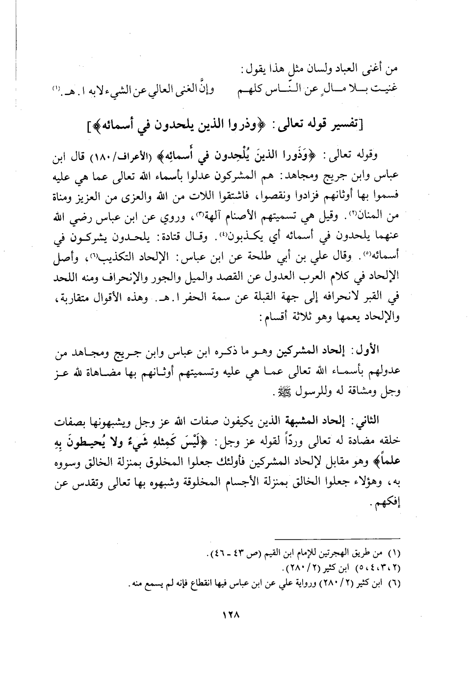 وَقَوْلُهُ تَعَالَى: {وَذَرُوا الَّذِينَ يُلْحِدُونَ فِي أَسْمَائِهِ} [الْأَعْرَافِ: 180] قَالَ ابْنُ عباس وابن جريح وَمُجَاهِدٌ: هُمُ الْمُشْرِكُونَ عَدَلُوا بِأَسْمَاءِ اللَّهِ تَعَالَى عَمَّا هِيَ عَلَيْهِ فَسَمَّوْا بِهَا أَوْثَانَهُمْ فَزَادُوا وَنَقَصُوا, فَاشْتَقُّوا اللَّاتَ مِنَ اللَّهِ وَالْعُزَّى مِنَ الْعَزِيزِ وَمَنَاةَ مِنَ الْمَنَّانِ2. وَقِيلَ هِيَ تَسْمِيَتُهُمُ الْأَصْنَامَ آلِهَةً3، وَرُوِيَ عَنِ ابْنِ عَبَّاسٍ رَضِيَ اللَّهُ عَنْهُمَا يُلْحِدُونَ فِي أَسْمَائِهِ أَيْ: يُكَذِّبُونَ4. وَقَالَ قَتَادَةُ يُلْحِدُونَ يُشْرِكُونَ فِي أَسْمَائِهِ5. وَقَالَ عَلِيُّ بْنُ أَبِي طَلْحَةَ عَنِ ابْنِ عَبَّاسٍ: الْإِلْحَادُ التَّكْذِيبُ6، وَأَصْلُ الْإِلْحَادِ فِي كَلَامِ الْعَرَبِ الْعُدُولُ عَنِ الْقَصْدِ وَالْمَيْلُ وَالْجَوْرُ وَالِانْحِرَافُ وَمِنْهُ اللَّحْدُ فِي الْقَبْرِ لِانْحِرَافِهِ إِلَى جِهَةِ الْقِبْلَةِ عَنْ سِمَةِ الْحَفْرِ ا. هـ. وَهَذِهِ الْأَقْوَالُ مُتَقَارِبَةٌ وَالْإِلْحَادُ يَعُمُّهَا وَهُوَ ثَلَاثَةُ أَقْسَامٍ: