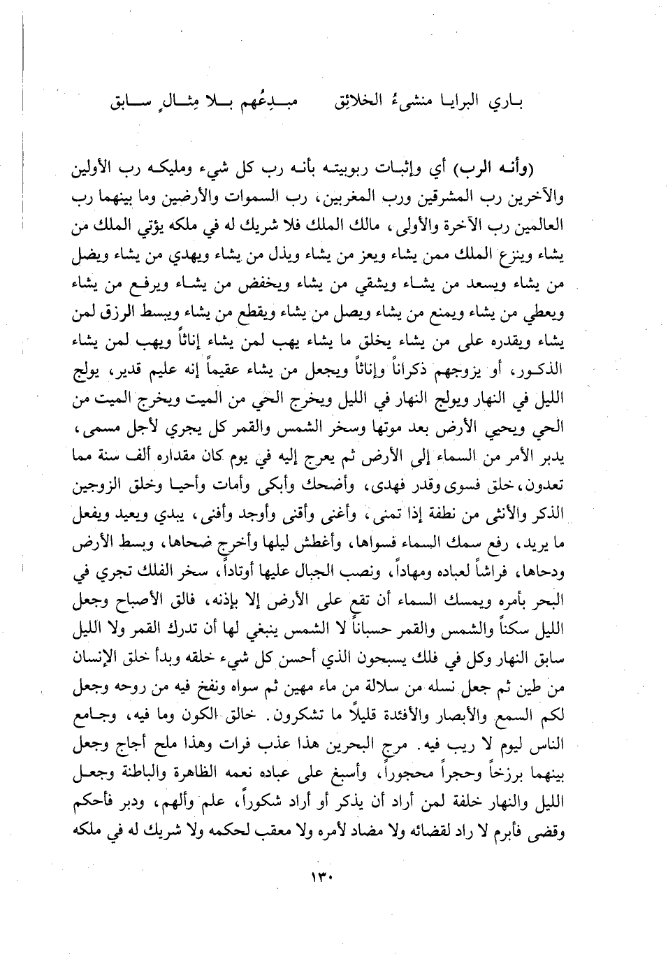"وَأَنَّهُ الرَّبُّ" أَيْ: وَإِثْبَاتُ رُبُوبِيَّتِهِ بِأَنَّهُ رَبُّ كُلِّ شَيْءٍ وَمَلِيكُهُ, رَبُّ الْأَوَّلِينَ وَالْآخَرِينَ رَبُّ الْمَشْرِقَيْنِ وَرَبُّ المغربين, رب السموات وَالْأَرَضِينَ وَمَا بَيْنَهُمَا, رَبُّ الْعَالَمِينَ رَبُّ الْآخِرَةِ وَالْأُولَى, مَالِكُ الْمُلْكِ فَلَا شَرِيكَ لَهُ فِي مُلْكِهِ, يُؤْتِي الْمُلْكَ مَنْ يَشَاءُ وَيَنْزِعُ الْمُلْكَ مِمَّنْ يَشَاءُ, وَيُعِزُّ مَنْ يَشَاءُ وَيُذِلُّ مَنْ يَشَاءُ, وَيَهْدِي مَنْ يَشَاءُ وَيُضِلُّ مَنْ يَشَاءُ, وَيُسْعِدُ مَنْ يَشَاءُ وَيُشْقِي مَنْ يَشَاءُ, وَيَخْفِضُ مَنْ يَشَاءُ وَيَرْفَعُ مَنْ يَشَاءُ, وَيُعْطِي مَنْ يَشَاءُ وَيَمْنَعُ مَنْ يَشَاءُ, وَيَصِلُ مَنْ يَشَاءُ وَيَقْطَعُ مَنْ يَشَاءُ, وَيَبْسُطُ الرِّزْقَ لِمَنْ يَشَاءُ وَيَقْدِرُهُ عَلَى مَنْ يَشَاءُ, يَخْلُقُ مَا يَشَاءُ يَهَبُ لِمَنْ يَشَاءُ إِنَاثًا وَيَهَبُ لِمَنْ يَشَاءُ الذُّكُورَ أَوْ يُزَوِّجُهُمْ ذُكْرَانًا وَإِنَاثًا وَيَجْعَلُ مَنْ يَشَاءُ عَقِيمًا, إِنَّهُ عَلِيمٌ قَدِيرٌ, يُولِجُ اللَّيْلَ فِي النَّهَارِ وَيُولِجُ النَّهَارَ فِي اللَّيْلِ, وَيُخْرِجُ الْحَيَّ مِنَ الْمَيِّتِ وَيُخْرِجُ الْمَيِّتَ مِنَ الْحَيِّ, وَيُحْيِي الْأَرْضَ بَعْدَ مَوْتِهَا وَسَخَّرَ الشَّمْسَ وَالْقَمَرَ كُلٌّ يَجْرِي لِأَجَلٍ مُسَمًّى, يُدَبِّرُ الْأَمْرَ مِنَ السَّمَاءِ إِلَى الْأَرْضِ ثُمَّ يَعْرُجُ إِلَيْهِ فِي يَوْمٍ كَانَ مِقْدَارُهُ أَلْفَ سَنَةٍ مِمَّا تَعُدُّونَ, خَلَقَ فَسَوَّى وَقَدَّرَ فَهَدَى, وَأَضْحَكَ وَأَبْكَى, وَأَمَاتَ وَأَحْيَا, وَخَلَقَ الزَّوْجَيْنِ الذَّكَرَ وَالْأُنْثَى مِنْ نُطْفَةٍ إِذَا تُمْنَى, وَأَغْنَى وَأَقْنَى وَأَوْجَدَ وَأَفْنَى, يُبْدِي وَيُعِيدُ وَيَفْعَلُ مَا يُرِيدُ, رَفَعَ سَمْكَ السَّمَاءِ فَسَوَّاهَا وَأَغْطَشَ لَيْلَهَا وَأَخْرَجَ ضُحَاهَا, وَبَسَطَ الْأَرْضَ وَدَحَاهَا فِرَاشًا لِعِبَادِهِ وَمِهَادًا, وَنَصَبَ الْجِبَالَ عَلَيْهَا أَوْتَادًا, سَخَّرَ الْفُلْكَ تَجْرِي فِي الْبَحْرِ بِأَمْرِهِ, وَيُمْسِكُ السَّمَاءَ أَنْ تَقَعَ عَلَى الْأَرْضِ إِلَّا بِإِذْنِهِ, فَالِقُ الْإِصْبَاحِ وَجَعَلَ اللَّيْلَ سَكَنًا وَالشَّمْسَ وَالْقَمَرَ حُسْبَانًا, لَا الشَّمْسُ يَنْبَغِي لَهَا أَنْ تُدْرِكَ الْقَمَرَ وَلَا اللَّيْلُ سَابِقُ النَّهَارِ, وَكُلٌّ فِي فَلَكٍ يَسْبَحُونَ, الَّذِي أَحْسَنَ كُلَّ شَيْءٍ خَلَقَهُ, وَبَدَأَ خَلْقَ الْإِنْسَانِ مِنْ طِينٍ ثُمَّ جَعَلَ نَسْلَهُ مِنْ سُلَالَةٍ مِنْ مَاءٍ مَهِينٍ ثُمَّ سَوَّاهُ وَنَفَخَ فِيهِ مِنْ رُوحِهِ, وَجَعَلَ لَكُمُ السَّمْعَ وَالْأَبْصَارَ وَالْأَفْئِدَةَ قَلِيلًا مَا تَشْكُرُونَ, خَالِقُ الْكَوْنِ وَمَا فِيهِ وَجَامِعُ النَّاسِ لِيَوْمٍ لَا رَيْبَ فِيهِ, مَرَجَ الْبَحْرَيْنِ هَذَا عَذْبٌ فُرَاتٌ وَهَذَا مِلْحٌ أُجَاجٌ, وَجَعَلَ بَيْنَهُمَا بَرْزَخًا وَحِجْرًا مَحْجُورًا, وَأَسْبَغَ عَلَى عِبَادِهِ نِعَمَهُ الظَّاهِرَةَ وَالْبَاطِنَةَ, وَجَعَلَ اللَّيْلَ وَالنَّهَارَ خِلْفَةً لِمَنْ أَرَادَ أَنْ يَذَّكَّرَ أَوْ أَرَادَ شُكُورًا, عَلِمَ وَأَلْهَمَ وَدَبَّرَ فَأَحْكَمَ وَقَضَى فَأَبْرَمَ لَا رَادَّ لِقَضَائِهِ وَلَا مُضَادَّ لِأَمْرِهِ وَلَا مُعَقِّبَ لِحُكْمِهِ, وَلَا شَرِيكَ لَهُ فِي مُلْكِهِ