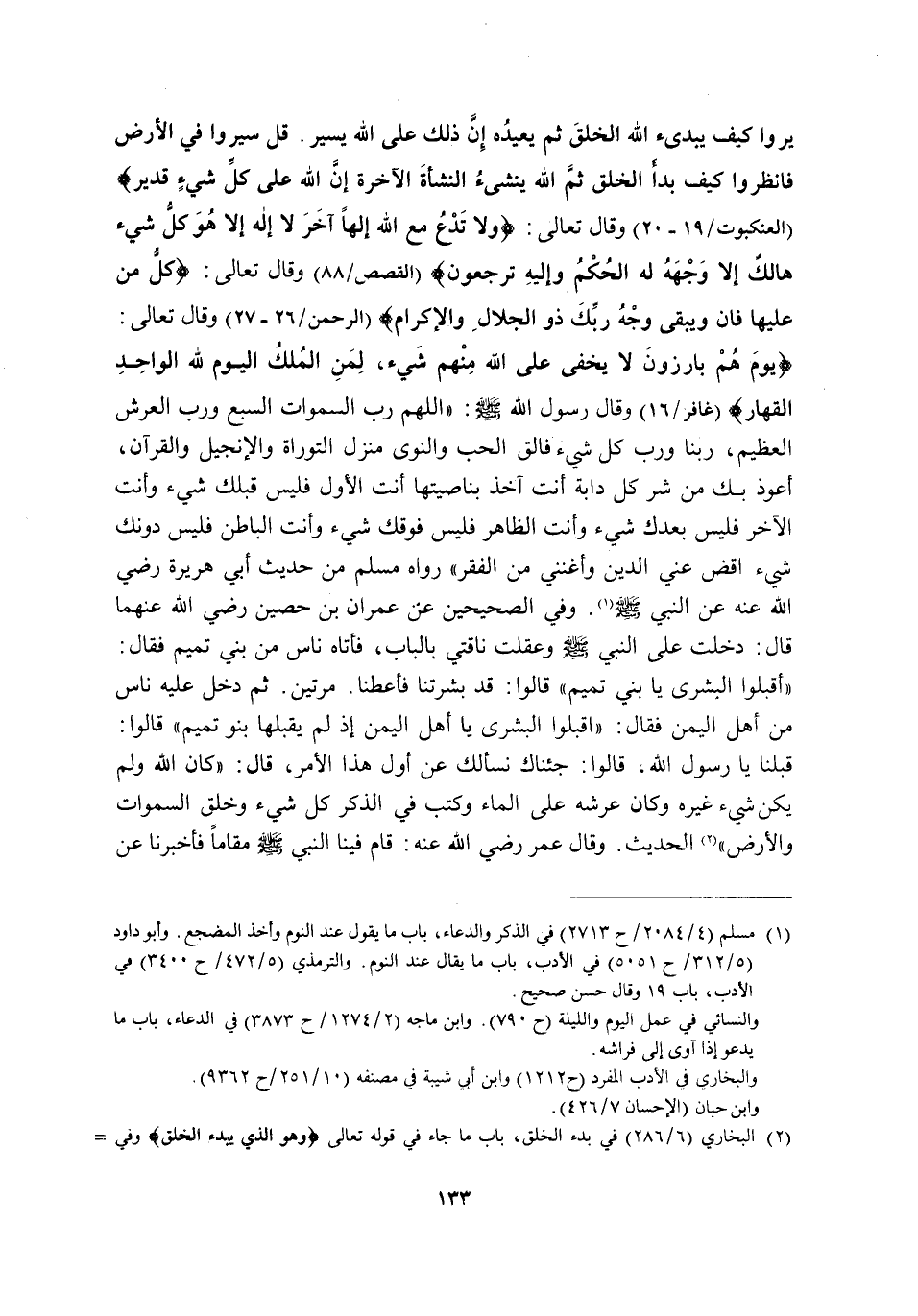 يَرَوْا كَيْفَ يُبْدِئُ اللَّهُ الْخَلْقَ ثُمَّ يُعِيدُهُ إِنَّ ذَلِكَ عَلَى اللَّهِ يَسِيرٌ، قُلْ سِيرُوا فِي الْأَرْضِ فَانْظُرُوا كَيْفَ بَدَأَ الْخَلْقَ ثُمَّ اللَّهُ يُنْشِئُ النَّشْأَةَ الْآخِرَةَ إِنَّ اللَّهَ عَلَى كُلِّ شَيْءٍ قَدِيرٌ} [الْعَنْكَبُوتِ: 19-20] وَقَالَ تَعَالَى: {وَلَا تَدْعُ مَعَ اللَّهِ إِلَهًا آخَرَ لَا إِلَهَ إِلَّا هُوكُلُّ شَيْءٍ هَالِكٌ إِلَّا وَجْهَهُ لَهُ الْحُكْمُ وَإِلَيْهِ تُرْجَعُونَ} [الْقَصَصِ: 88] وَقَالَ تَعَالَى: {كُلُّ مَنْ عَلَيْهَا فَانٍ، وَيَبْقَى وَجْهُ رَبِّكَ ذُوالْجَلالِ وَالْإِكْرَامِ} [الرَّحْمَنِ: 26-27] وَقَالَ تَعَالَى: {يَوْمَ هُمْ بَارِزُونَ لَا يَخْفَى عَلَى اللَّهِ مِنْهُمْ شَيْءٌ لِمَنِ الْمُلْكُ الْيَوْمَ لِلَّهِ الْوَاحِدِ الْقَهَّارِ} [غَافِرٍ: 16] وَقَالَ رَسُولُ اللَّهِ صَلَّى اللَّهُ عَلَيْهِ وَسَلَّمَ: "اللهم رب السموات السَّبْعِ وَرَبَّ الْعَرْشِ الْعَظِيمِ, رَبَّنَا وَرَبَّ كُلِّ شَيْءٍ فَالِقَ الْحَبِّ وَالنَّوَى مُنْزِلَ التَّوْرَاةِ وَالْإِنْجِيلِ وَالْقُرْآنِ, أَعُوذُ بِكَ مِنْ شَرِّ كُلِّ دَابَّةٍ أَنْتَ آخِذٌ بِنَاصِيَتِهَا, أَنْتَ الْأَوَّلُ فَلَيْسَ قَبْلَكَ شَيْءٌ وَأَنْتَ الْآخِرُ فَلَيْسَ بَعْدَكَ شَيْءٌ, وَأَنْتَ الظَّاهِرُ فَلَيْسَ فَوْقَكَ شَيْءٌ وَأَنْتَ الْبَاطِنُ فَلَيْسَ دُونَكَ شَيْءٌ, اقْضِ عَنِّي الدَّيْنَ وَأَغْنِنِي مِنَ الْفَقْرِ" رَوَاهُ مُسْلِمٌ مِنْ حَدِيثِ أَبِي هُرَيْرَةَ رَضِيَ اللَّهُ عَنْهُ عَنِ النَّبِيِّ صَلَّى اللَّهُ عَلَيْهِ وَسَلَّمَ1. وَفِي الصَّحِيحَيْنِ عَنْ عِمْرَانَ بْنِ حُصَيْنٍ رضى الله عنهما قَالَ: دَخَلْتُ عَلَى النَّبِيِّ -صَلَّى اللَّهُ عَلَيْهِ وَسَلَّمَ- وَعَقَلْتُ نَاقَتِي بِالْبَابِ فَأَتَاهُ نَاسٌ مِنْ بَنِي تَمِيمٍ فَقَالَ: "اقْبَلُوا الْبُشْرَى يَا بَنِي تَمِيمٍ" قَالُوا: قَدْ بَشَّرْتَنَا فَأَعْطِنَا. مَرَّتَيْنِ. ثُمَّ دَخَلَ عَلَيْهِ نَاسٌ مِنْ أَهْلِ الْيَمَنِ فَقَالَ: "اقْبَلُوا الْبُشْرَى يَا أَهْلَ الْيَمَنِ إِذْ لَمْ يَقْبَلْهَا بَنُو تَمِيمٍ" قَالُوا: قَبِلْنَا يَا رَسُولَ اللَّهِ, قَالُوا: جِئْنَاكَ نَسْأَلُكَ عَنْ أَوَّلِ هَذَا الْأَمْرِ قَالَ: "كَانَ اللَّهُ وَلَمْ يَكُنْ شَيْءٌ غَيْرُهُ وَكَانَ عَرْشُهُ عَلَى الْمَاءِ وَكَتَبَ فِي الذِّكْرِ كُلَّ شيء وخلق السموات وَالْأَرْضَ" 2 الْحَدِيثَ, وَقَالَ عُمَرُ رَضِيَ اللَّهُ عَنْهُ: قَامَ فِينَا النَّبِيُّ -صَلَّى اللَّهُ عَلَيْهِ وَسَلَّمَ- مَقَامًا فَأَخْبَرَنَا عَنْ
