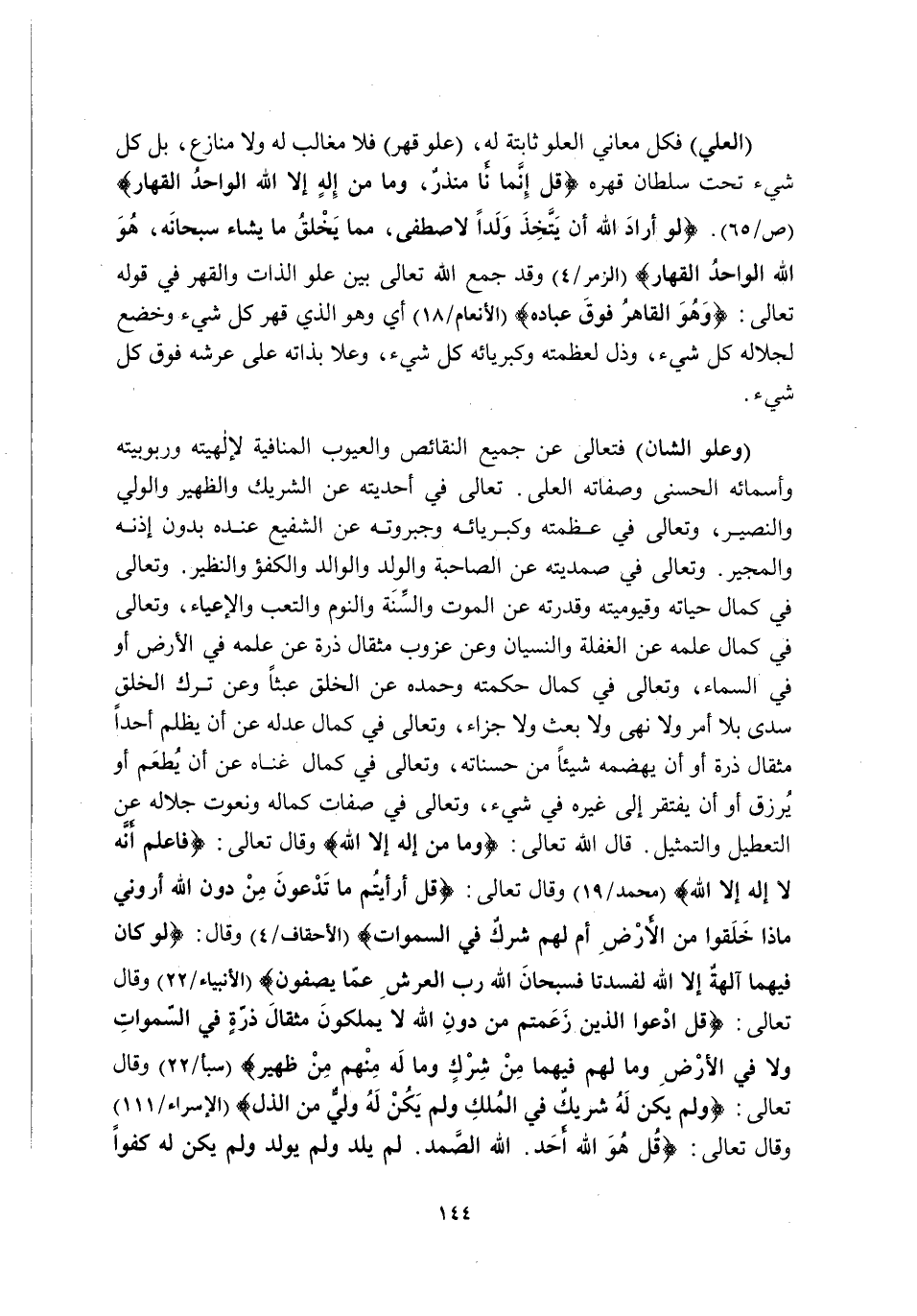 "وَعُلُوَّ الشَّأْنِ" فَتَعَالَى عَنْ جَمِيعِ النَّقَائِصِ وَالْعُيُوبِ الْمُنَافِيَةِ لِإِلَهِيَّتِهِ وَرُبُوبِيَّتِهِ وَأَسْمَائِهِ الْحُسْنَى وَصِفَاتِهِ الْعُلَى. تَعَالَى فِي أَحَدِيَّتِهِ عَنِ الشَّرِيكِ وَالظَّهِيرِ وَالْوَلِيِّ وَالنَّصِيرِ, وَتَعَالَى فِي عَظَمَتِهِ وَكِبْرِيَائِهِ وَجَبَرُوتِهِ عَنِ الشَّفِيعِ عِنْدَهُ بِدُونِ إِذْنِهِ وَالْمُجِيرِ. وَتَعَالَى فِي صَمَدِيَّتِهِ عَنِ الصَّاحِبَةِ وَالْوَلَدِ وَالْوَالِدِ وَالْكُفْؤِ وَالنَّظِيرِ. وَتَعَالَى فِي كَمَالِ حَيَاتِهِ وَقَيُّومِيَّتِهِ وَقُدْرَتِهِ عَنِ الْمَوْتِ وَالسِّنَةِ وَالنَّوْمِ وَالتَّعَبِ وَالْإِعْيَاءِ, وَتَعَالَى فِي كَمَالِ عِلْمِهِ عَنِ الْغَفْلَةِ وَالنِّسْيَانِ, وَعَنْ عُزُوبِ مِثْقَالِ ذَرَّةٍ عَنْ عِلْمِهِ فِي الْأَرْضِ أَوْ فِي السَّمَاءِ, وَتَعَالَى فِي كَمَالِ حِكْمَتِهِ وَحَمْدِهِ عَنِ الْخَلْقِ عَبَثًا وَعَنْ تَرْكِ الْخَلْقِ سُدًى بِلَا أَمْرٍ وَلَا نَهْيٍ وَلَا بَعْثٍ وَلَا جَزَاءٍ, وَتَعَالَى فِي كَمَالِ عَدْلِهِ عَلَى أَنْ يَظْلِمَ أَحَدًا مِثْقَالَ ذَرَّةٍ أَوْ أَنْ يَهْضِمَهُ شَيْئًا مِنْ حَسَنَاتِهِ, وَتَعَالَى فِي كَمَالِ غِنَاهُ عَنْ أَنْ يُطْعَمَ أَوْ يُرْزَقَ أَوْ أَنْ يَفْتَقِرَ إِلَى غَيْرِهِ فِي شَيْءٍ, وَتَعَالَى فِي صِفَاتِ كَمَالِهِ وَنُعُوتِ جَلَالِهِ عَنِ التَّعْطِيلِ وَالتَّمْثِيلِ, قَالَ اللَّهُ تَعَالَى: {وَمَا مِنْ إِلَهٍ إِلَّا اللَّهُ} وَقَالَ تَعَالَى: {فَاعْلَمْ أَنَّهُ لَا إِلَهَ إِلَّا اللَّهُ} [مُحَمَّدٍ: 19] وَقَالَ تَعَالَى: {قُلْ أَرَأَيْتُمْ مَا تَدْعُونَ مِنْ دُونِ اللَّهِ أَرُونِي مَاذَا خَلَقُوا مِنَ الْأَرْضِ أَمْ لَهُمْ شِرْكٌ فِي السَّمَاوَاتِ} [الْأَحْقَافِ: 4] وَقَالَ: {لَوْ كَانَ فِيهِمَا آلِهَةٌ إِلَّا اللَّهُ لَفَسَدَتَا فَسُبْحَانَ اللَّهِ رَبِّ الْعَرْشِ عَمَّا يَصِفُونَ} [الْأَنْبِيَاءِ: 22] وَقَالَ تَعَالَى: {قُلِ ادْعُوا الَّذِينَ زَعَمْتُمْ مِنْ دُونِ اللَّهِ لَا يَمْلِكُونَ مِثْقَالَ ذَرَّةٍ فِي السَّمَاوَاتِ وَلَا فِي الْأَرْضِ وَمَا لَهُمْ فِيهِمَا مِنْ شِرْكٍ وَمَا لَهُ مِنْهُمْ مِنْ ظَهِيرٍ} [سَبَأٍ: 22] وَقَالَ تَعَالَى: {وَلَمْ يَكُنْ لَهُ شَرِيكٌ فِي الْمُلْكِ وَلَمْ يَكُنْ لَهُ وَلِيٌّ مِنَ الذُّلِّ} [الْإِسْرَاءِ: 111] وَقَالَ تَعَالَى: {قُلْ هُوَ اللَّهُ أَحَدٌ، اللَّهُ الصَّمَدُ، لَمْ يَلِدْ وَلَمْ يُولَدْ، وَلَمْ يَكُنْ لَهُ كُفُوًا