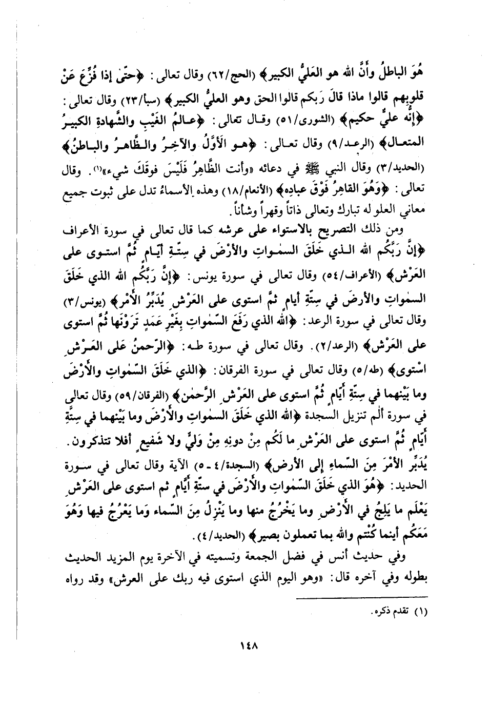 وَمِنْ ذَلِكَ التَّصْرِيحُ بِالِاسْتِوَاءِ عَلَى عَرْشِهِ كَمَا قَالَ تَعَالَى فِي سُورَةِ الْأَعْرَافِ: {إِنَّ رَبَّكُمُ اللَّهُ الَّذِي خَلَقَ السَّمَاوَاتِ وَالْأَرْضَ فِي سِتَّةِ أَيَّامٍ ثُمَّ اسْتَوَى عَلَى الْعَرْشِ} [الْأَعْرَافِ: 54] وَقَالَ تَعَالَى فِي سُورَةِ يُونُسَ: {إِنَّ رَبَّكُمُ اللَّهُ الَّذِي خَلَقَ السَّمَاوَاتِ وَالْأَرْضَ فِي سِتَّةِ أَيَّامٍ ثُمَّ اسْتَوَى عَلَى الْعَرْشِ يُدَبِّرُ الْأَمْرَ} [يُونُسَ: 3] وَقَالَ تَعَالَى فِي سُورَةِ الرَّعْدِ: {اللَّهُ الَّذِي رَفَعَ السَّمَاوَاتِ بِغَيْرِ عَمَدٍ تَرَوْنَهَا ثُمَّ اسْتَوَى عَلَى الْعَرْشِ} [الرَّعْدِ: 2] وَقَالَ تَعَالَى فِي سُورَةِ طه: {الرَّحْمَنُ عَلَى الْعَرْشِ اسْتَوَى} [طه: 5] وَقَالَ تَعَالَى فِي سُورَةِ الْفُرْقَانِ: {الَّذِي خَلَقَ السَّمَاوَاتِ وَالْأَرْضَ وَمَا بَيْنَهُمَا فِي سِتَّةِ أَيَّامٍ ثُمَّ اسْتَوَى عَلَى الْعَرْشِ الرَّحْمَنُ} [الْفُرْقَانِ: 59] وَقَالَ تَعَالَى فِي سُورَةِ الم تَنْزِيلُ السَّجْدَةِ: {اللَّهُ الَّذِي خَلَقَ السَّمَاوَاتِ وَالْأَرْضَ وَمَا بَيْنَهُمَا فِي سِتَّةِ أَيَّامٍ ثُمَّ اسْتَوَى عَلَى الْعَرْشِ مَا لَكُمْ مِنْ دُونِهِ مِنْ وَلِيٍّ وَلَا شَفِيعٍ أَفَلَا تَتَذَكَّرُونَ يُدَبِّرُ الْأَمْرَ مِنَ السَّمَاءِ إِلَى الْأَرْضِ} [السَّجْدَةِ: 4-5] الْآيَةَ. وَقَالَ تَعَالَى فِي سُورَةِ الْحَدِيدِ: {هُوَ الَّذِي خَلَقَ السَّمَاوَاتِ وَالْأَرْضَ فِي سِتَّةِ أَيَّامٍ ثُمَّ اسْتَوَى عَلَى الْعَرْشِ يَعْلَمُ مَا يَلِجُ فِي الْأَرْضِ وَمَا يَخْرُجُ مِنْهَا وَمَا يَنْزِلُ مِنَ السَّمَاءِ وَمَا يَعْرُجُ فِيهَا وَهُوَ مَعَكُمْ أَيْنَ مَا كُنْتُمْ وَاللَّهُ بِمَا تَعْمَلُونَ بَصِيرٌ} [الْحَدِيدِ: 4] .