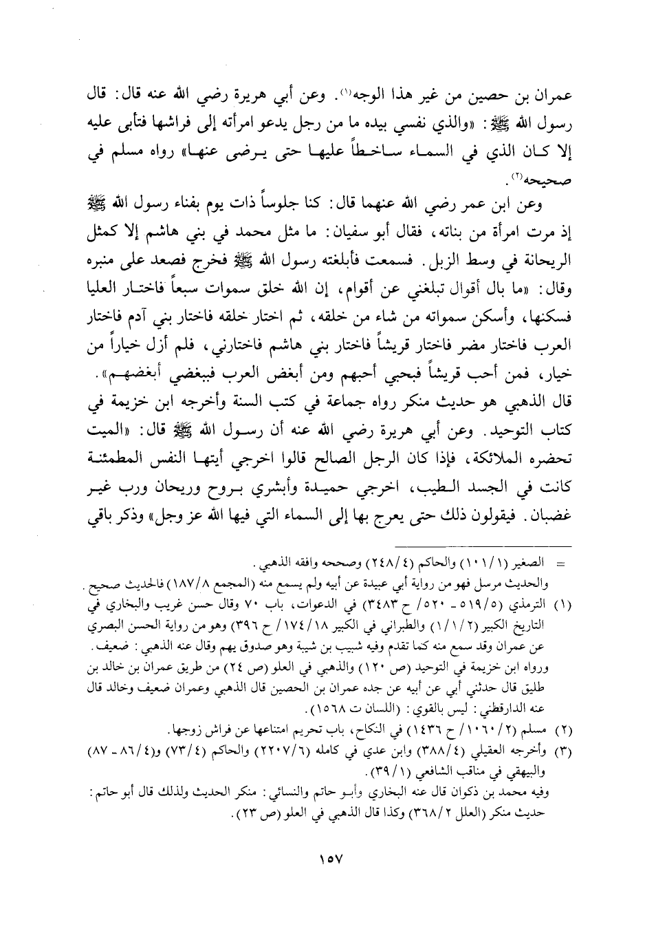 عِمْرَانَ بْنِ حُصَيْنٍ مِنْ غَيْرِ هَذَا الْوَجْهِ1. وَعَنْ أَبِي هُرَيْرَةَ رَضِيَ اللَّهُ عَنْهُ قَالَ: قَالَ رَسُولُ اللَّهِ صَلَّى اللَّهُ عَلَيْهِ وَسَلَّمَ: " وَالَّذِي نَفْسِي بِيَدِهِ مَا مِنْ رَجُلٍ يَدْعُو امْرَأَتَهُ إِلَى فِرَاشِهَا فَتَأْبَى عَلَيْهِ إِلَّا كَانَ الَّذِي فِي السَّمَاءِ سَاخِطًا عَلَيْهَا حَتَّى يَرْضَى عَنْهَا" رَوَاهُ مُسْلِمٌ فِي صَحِيحِهِ2.