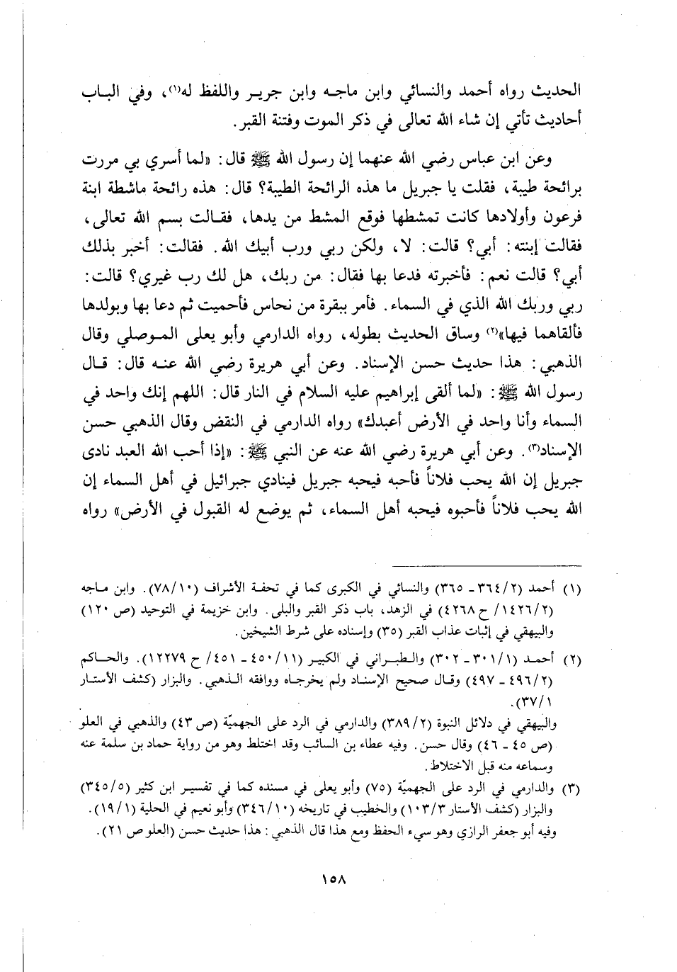 وَعَنِ ابْنِ عَبَّاسٍ رَضِيَ اللَّهُ عَنْهُمَا أَنَّ رَسُولَ اللَّهِ -صَلَّى اللَّهُ عَلَيْهِ وَسَلَّمَ- قَالَ: "لَمَّا أُسْرِيَ بِي مَرَرْتُ بِرَائِحَةٍ طَيِّبَةٍ, فَقُلْتُ: يَا جِبْرِيلُ مَا هَذِهِ الرَّائِحَةُ الطَّيِّبَةُ؟ قَالَ: هَذِهِ رَائِحَةُ مَاشِطَةِ ابْنَةِ فِرْعَوْنَ وَأَوْلَادِهَا كَانَتْ تُمَشِّطُهَا فَوَقَعَ الْمُشْطُ مِنْ يَدِهَا فَقَالَتْ: بِاسْمِ اللَّهِ تَعَالَى فَقَالَتِ ابْنَتُهُ: أَبِي؟ قَالَتْ: لَا وَلَكِنَّ رَبِّي وَرَبَّ أَبِيكَ اللَّهُ. فَقَالَتْ: أُخْبِرُ بِذَلِكَ أَبِي؟ قَالَتْ: نَعَمْ, فَأَخْبَرَتْهُ, فَدَعَا بِهَا فَقَالَ: مَنْ رَبُّكِ هَلْ لَكِ رَبٌّ غَيْرِي؟ قَالَتْ: رَبِّي وَرَبُّكَ اللَّهُ الَّذِي فِي السَّمَاءِ فَأَمَرَ بِبَقَرَةٍ مِنْ نُحَاسٍ فَأُحْمِيَتْ ثُمَّ دَعَا بِهَا وَبِوَلَدِهَا فَأَلْقَاهُمَا فِيهَا" 2 وَسَاقَ الْحَدِيثَ بِطُولِهِ, رَوَاهُ الدَّارِمِيُّ وَأَبُو يَعْلَى الْمَوْصِلِيُّ, وَقَالَ الذَّهَبِيُّ: هَذَا حَدِيثٌ حَسَنُ الْإِسْنَادِ. وَعَنْ أَبِي هُرَيْرَةَ رَضِيَ اللَّهُ عَنْهُ قَالَ: قَالَ رَسُولُ اللَّهِ صَلَّى اللَّهُ عَلَيْهِ وَسَلَّمَ: "لَمَّا أُلْقِيَ إِبْرَاهِيمُ عَلَيْهِ السَّلَامُ فِي النَّارِ قَالَ: اللَّهُمَّ إِنَّكَ وَاحِدٌ فِي السَّمَاءِ وَأَنَا وَاحِدٌ فِي الْأَرْضِ أَعْبُدُكَ" رَوَاهُ الدَّارِمِيُّ فِي النَّقْضِ وَقَالَ الذَّهَبِيُّ: حَسَنُ الْإِسْنَادِ3. وَعَنْ أَبِي هُرَيْرَةَ رَضِيَ اللَّهُ عَنْهُ عَنِ النَّبِيِّ صَلَّى اللَّهُ عَلَيْهِ وَسَلَّمَ: "إِذَا أَحَبَّ اللَّهُ الْعَبْدَ نَادَى جِبْرِيلَ إِنَّ اللَّهَ يُحِبُّ فُلَانًا فَأَحِبَّهُ فَيُحِبُّهُ جِبْرِيلُ فَيُنَادِي جِبْرَائِيلُ فِي أَهْلِ السَّمَاءِ إِنَّ اللَّهَ يُحِبُّ فُلَانًا فَأَحِبُّوهُ فَيُحِبُّهُ أَهْلُ السَّمَاءِ, ثُمَّ يُوضَعُ لَهُ الْقَبُولُ فِي الْأَرْضِ" رَوَاهُ