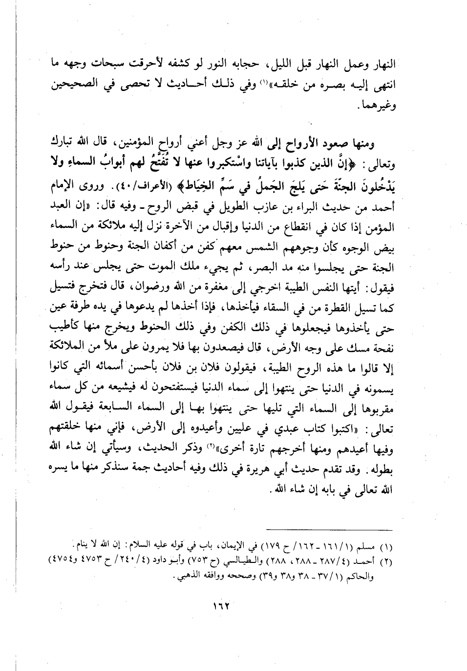 وَمِنْهَا صُعُودُ الْأَرْوَاحِ إِلَى اللَّهِ عَزَّ وَجَلَّ أَعْنِي أَرْوَاحَ الْمُؤْمِنِينَ, قَالَ اللَّهُ تَبَارَكَ وَتَعَالَى: {إِنَّ الَّذِينَ كَذَّبُوا بِآيَاتِنَا وَاسْتَكْبَرُوا عَنْهَا لَا تُفَتَّحُ لَهُمْ أَبْوَابُ السَّمَاءِ وَلَا يَدْخُلُونَ الْجَنَّةَ حَتَّى يَلِجَ الْجَمَلُ فِي سَمِّ الْخِيَاطِ} [الْأَعْرَافِ: 40] وَرَوَى الْإِمَامُ أَحْمَدُ مِنْ حَدِيثِ الْبَرَاءِ بْنِ عَازِبٍ الطَّوِيلِ فِي قَبْضِ الرُّوحِ وَفِيهِ قَالَ: "إِنَّ الْعَبْدَ الْمُؤْمِنَ إِذَا كَانَ فِي انْقِطَاعٍ مِنَ الدُّنْيَا وَإِقْبَالٍ مِنَ الْآخِرَةِ نَزَلَ إِلَيْهِ مَلَائِكَةٌ مِنَ السَّمَاءِ بِيضُ الْوُجُوهِ كَأَنَّ وُجُوهَهُمُ الشَّمْسُ مَعَهُمْ كَفَنٌ مِنْ أَكْفَانِ الْجَنَّةِ, وَحَنُوطٌ مِنْ حَنُوطِ الْجَنَّةِ, حَتَّى يَجْلِسُوا مِنْهُ مَدَّ الْبَصَرِ ثُمَّ يَجِيءُ مَلَكُ الْمَوْتِ حَتَّى يَجْلِسَ عِنْدَ رَأْسِهِ فَيَقُولُ: أَيَّتُهَا النَّفْسُ الطَّيِّبَةُ اخْرُجِي إِلَى مَغْفِرَةٍ مِنَ اللَّهِ وَرِضْوَانٍ, قَالَ: فتخرج كما فَتَسِيلُ كَمَا تَسِيلُ الْقَطْرَةُ مِنْ فِي السِّقَاءِ فَيَأْخُذُهَا فَإِذَا أَخَذَهَا لَمْ يَدَعُوهَا فِي يَدِهِ طَرْفَةَ عَيْنٍ حَتَّى يَأْخُذُوهَا فَيَجْعَلُوهَا فِي ذَلِكَ الْكَفَنِ وَفِي ذَلِكَ الْحَنُوطِ وَيَخْرُجُ مِنْهَا كَأَطْيَبِ نَفْحَةِ مِسْكٍ عَلَى وَجْهِ الْأَرْضِ, قَالَ: فَيَصْعَدُونَ بِهَا فَلَا يَمُرُّونَ عَلَى مَلَأٍ مِنَ الْمَلَائِكَةِ إِلَّا قَالُوا: مَا هَذِهِ الرُّوحُ الطَّيِّبَةُ فَيَقُولُونَ: فُلَانُ بْنُ فُلَانٍ بِأَحْسَنِ أَسْمَائِهِ الَّتِي كَانُوا يُسَمُّونَهُ فِي الدُّنْيَا حَتَّى يَنْتَهُوا إِلَى سَمَاءِ الدُّنْيَا فَيَسْتَفْتِحُونَ لَهُ فَيُشَيِّعُهُ مِنْ كُلِّ سَمَاءٍ مُقَرَّبُوهَا إِلَى السَّمَاءِ الَّتِي تَلِيهَا حَتَّى يَنْتَهُوا بِهَا إِلَى السَّمَاءِ السَّابِعَةِ فَيَقُولُ اللَّهُ تَعَالَى: اكْتُبُوا كِتَابَ عَبْدِي فِي عِلِّيِّينَ وَأَعِيدُوهُ إِلَى الْأَرْضِ فَإِنِّي مِنْهَا خَلَقْتُهُمْ وَفِيهَا أُعِيدُهُمْ وَمِنْهَا أُخْرِجُهُمْ تَارَةً أُخْرَى" 2 وَذَكَرَ الْحَدِيثَ. وَسَيَأْتِي إِنْ شَاءَ اللَّهُ بِطُولِهِ وَقَدْ تَقَدَّمَ حَدِيثُ أَبِي هُرَيْرَةَ فِي ذَلِكَ وَفِيهِ أَحَادِيثُ جَمَّةٌ سَنَذْكُرُ مِنْهَا مَا يَسَّرَهُ اللَّهُ تَعَالَى فِي بَابِهِ إِنْ شَاءَ اللَّهُ.