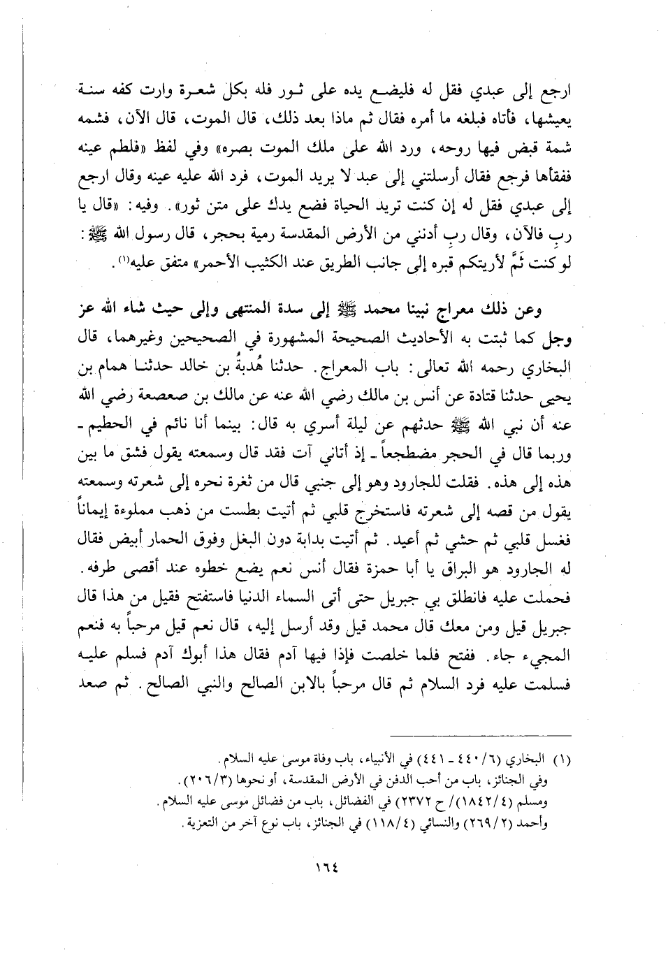 وعن ذَلِكَ مِعْرَاجُ نَبِيِّنَا مُحَمَّدٍ -صَلَّى اللَّهُ عَلَيْهِ وَسَلَّمَ- إِلَى سِدْرَةِ الْمُنْتَهَى وَإِلَى حَيْثُ شَاءَ اللَّهُ عَزَّ وَجَلَّ كَمَا ثَبَتَتْ بِهِ الْأَحَادِيثُ الصَّحِيحَةُ الْمَشْهُورَةُ فِي الصَّحِيحَيْنِ وَغَيْرِهِمَا, قَالَ: الْبُخَارِيُّ رَحِمَهُ اللَّهُ تَعَالَى: بَابُ الْمِعْرَاجِ. حَدَّثَنَا هُدْبَةُ بْنُ خَالِدٍ حَدَّثَنَا هَمَّامُ بْنُ يَحْيَى حَدَّثَنَا قَتَادَةُ عَنْ أَنَسِ بْنِ مَالِكٍ رَضِيَ اللَّهُ عَنْهُ عَنْ مَالِكِ بْنِ صَعْصَعَةَ رَضِيَ اللَّهُ عَنْهُ أَنَّ نَبِيَّ اللَّهِ -صَلَّى اللَّهُ عَلَيْهِ وَسَلَّمَ- حَدَّثَهُمْ عَنْ لَيْلَةِ أُسْرِيَ بِهِ قَالَ: "بَيْنَمَا أَنَا نَائِمٌ فِي الْحَطِيمِ -وَرُبَّمَا قَالَ: فِي الْحِجْرِ مُضْطَجِعًا- إِذْ أَتَانِي آتٍ فَقَدْ قَالَ وَسَمِعْتُهُ يَقُولُ فَشَقَّ مَا بَيْنَ هَذِهِ إِلَى هَذِهِ. -فَقُلْتُ لِلْجَارُودِ وَهُوَ إِلَى جَنْبِي قَالَ: مِنْ ثُغْرَةِ نَحْرِهِ إِلَى شَعَرَتِهِ- وَسَمِعْتُهُ يَقُولُ مِنْ قَصِّهِ إِلَى شَعْرَتِهِ فَاسْتَخْرَجَ قَلْبِي ثُمَّ أُتِيتُ بِطَسْتٍ مِنْ ذَهَبٍ مَمْلُوءَةٍ إِيمَانًا فَغُسِلَ قَلْبِي ثُمَّ حُشِيَ ثُمَّ أُعِيدَ, ثُمَّ أُتِيتُ بِدَابَّةٍ دُونَ الْبَغْلِ وَفَوْقَ الْحِمَارِ أَبْيَضَ فَقَالَ: لَهُ الْجَارُودُ: هُوَ الْبُرَاقُ يَا أَبَا حَمْزَةَ, فَقَالَ: أَنَسٌ: نَعَمْ يَضَعُ خُطْوَهُ عِنْدَ أَقْصَى طَرْفِهِ. فَحُمِلْتُ عَلَيْهِ فَانْطَلَقَ بِي جِبْرِيلُ حَتَّى أَتَى السَّمَاءَ الدُّنْيَا فَاسْتَفْتَحَ فَقِيلَ: مَنْ هَذَا قَالَ: جِبْرِيلُ قِيلَ: وَمَنْ مَعَكَ قَالَ: مُحَمَّدٌ قِيلَ: وَقَدْ أُرْسِلَ إِلَيْهِ قَالَ: نَعَمْ قِيلَ: مَرْحَبًا بِهِ فَنِعْمَ الْمَجِيءُ جَاءَ, فَفُتِحَ فَلَمَّا خَلَصْتُ فَإِذَا فِيهَا آدَمُ فَقَالَ: هَذَا أَبُوكَ آدَمُ فَسَلِّمْ عَلَيْهِ فَسَلَّمْتُ عَلَيْهِ فَرَدَّ السَّلَامَ, ثُمَّ قَالَ: مَرْحَبًا بِالِابْنِ الصَّالِحِ وَالنَّبِيِّ الصَّالِحِ. ثُمَّ صَعِدَ
