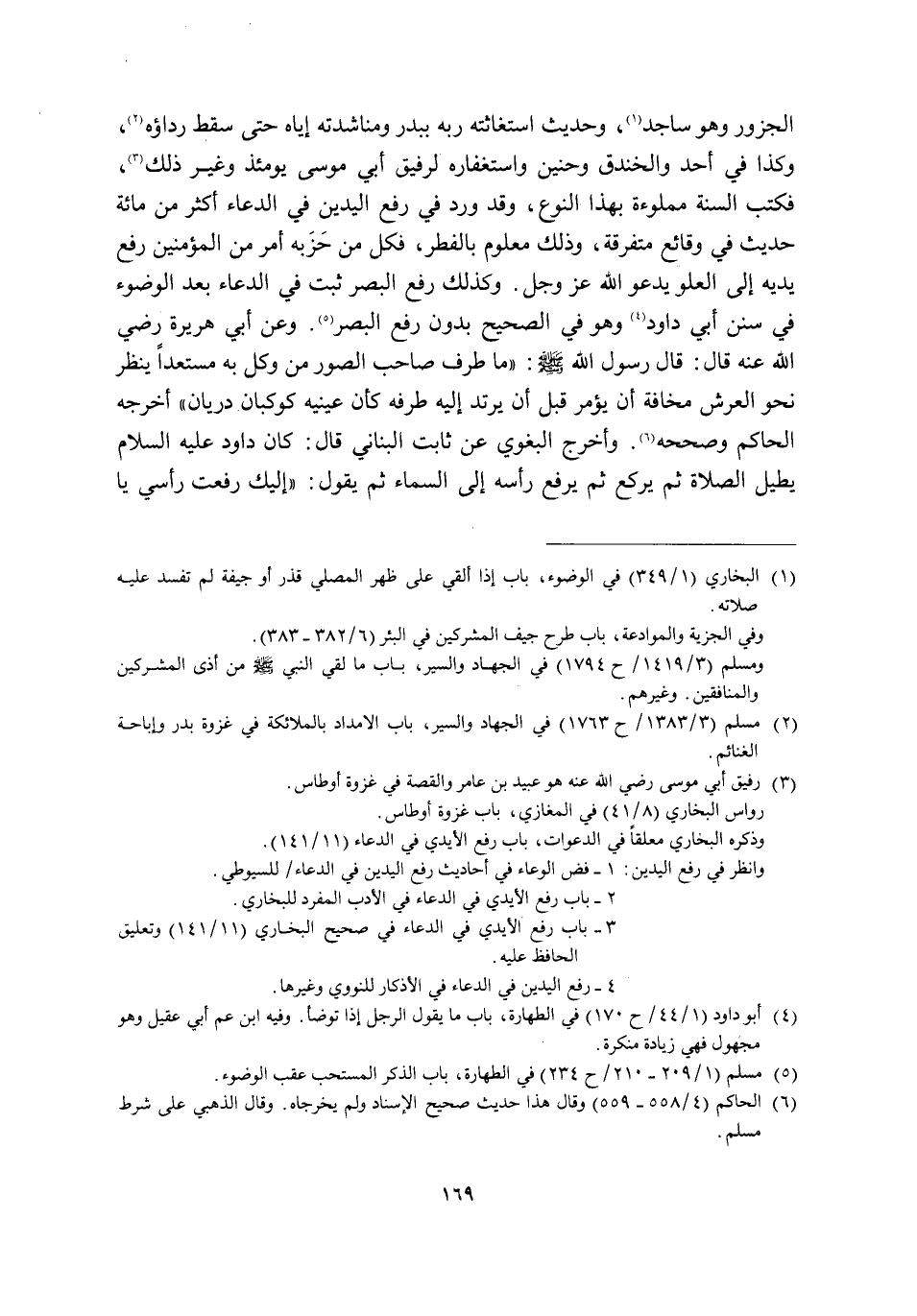الْجَزُورِ وَهُوَ سَاجِدٌ1، وَحَدِيثِ اسْتِغَاثَتِهِ رَبَّهُ بِبَدْرٍ وَمُنَاشَدَتِهِ إِيَّاهُ حَتَّى سَقَطَ رِدَاؤُهُ2، وَكَذَا فِي أُحُدٍ وَالْخَنْدَقِ وَحُنَيْنٍ وَاسْتِغْفَارِهِ لِرَفِيقِ أَبِي مُوسَى يَوْمَئِذٍ وَغَيْرِ ذَلِكَ3، فَكُتُبُ السُّنَّةِ مَمْلُوءَةٌ بِهَذَا النَّوْعِ, وَقَدْ وَرَدَ فِي رَفْعِ الْيَدَيْنِ فِي الدُّعَاءِ أَكْثَرُ مِنْ مِائَةِ حَدِيثٍ فِي وَقَائِعَ مُتَفَرِّقَةٍ, وَذَلِكَ مَعْلُومٌ بِالْفِطَرِ, فَكُلُّ مَنْ حَزَبَهُ أَمْرٌ مِنَ الْمُؤْمِنِينَ رَفَعَ يَدَيْهِ إِلَى الْعُلُوِّ يَدْعُو اللَّهَ عَزَّ وَجَلَّ, وَكَذَلِكَ رَفْعُ الْبَصَرِ ثَبَتَ فِي الدُّعَاءِ بَعْدَ الْوُضُوءِ فِي سُنَنِ أَبِي دَاوُدَ4 وَهُوَ فِي الصَّحِيحِ بِدُونِ رَفْعِ الْبَصَرِ5. وَعَنْ أَبِي هُرَيْرَةَ رَضِيَ اللَّهُ عَنْهُ قَالَ: قَالَ رَسُولُ اللَّهِ صَلَّى اللَّهُ عَلَيْهِ وَسَلَّمَ: "مَا طَرَفَ صَاحِبُ الصُّورِ مَنْ وُكِّلَ بِهِ مُسْتَعِدًّا يَنْظُرُ نَحْوَ الْعَرْشِ مَخَافَةَ أَنْ يُؤْمَرَ قَبْلَ أَنْ يَرْتَدَّ إِلَيْهِ طَرْفُهُ كَأَنَّ عَيْنَيْهِ كَوْكَبَانِ دُرِّيَّانِ" أَخْرَجَهُ الْحَاكِمُ وَصَحَّحَهُ6. وَأَخْرَجَ الْبَغَوِيُّ عَنْ ثَابِتٍ الْبُنَانِيِّ قَالَ: كَانَ دَاوُدُ عَلَيْهِ السَّلَامُ يُطِيلُ الصَّلَاةَ ثُمَّ يَرْكَعُ ثُمَّ يَرْفَعُ رَأْسَهُ إِلَى السَّمَاءِ ثُمَّ يَقُولُ: "إِلَيْكَ رَفَعْتُ رَأْسِي يَا