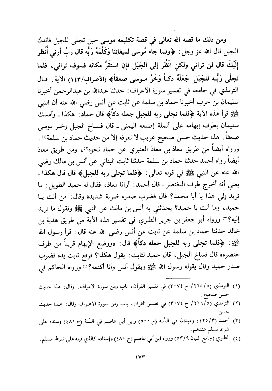 وَمِنْ ذَلِكَ مَا قَصَّهُ اللَّهُ تَعَالَى فِي قِصَّةِ تَكْلِيمِهِ مُوسَى حِينَ تَجَلَّى لِلْجَبَلِ فَانْدَكَّ الْجَبَلُ قَالَ اللَّهُ عَزَّ وَجَلَّ: {وَلَمَّا جَاءَ مُوسَى لِمِيقَاتِنَا وَكَلَّمَهُ رَبُّهُ قَالَ رَبِّ أَرِنِي أَنْظُرْ إِلَيْكَ قَالَ لَنْ تَرَانِي وَلَكِنِ انْظُرْ إِلَى الْجَبَلِ فَإِنِ اسْتَقَرَّ مَكَانَهُ فَسَوْفَ تَرَانِي فَلَمَّا تَجَلَّى رَبُّهُ لِلْجَبَلِ جَعَلَهُ دَكًّا وَخَرَّ مُوسَى صَعِقًا} [الْأَعْرَافِ: 143] الْآيَةَ. قَالَ التِّرْمِذِيُّ فِي جَامِعِهِ فِي تَفْسِيرِ سُورَةِ الْأَعْرَافِ: حَدَّثَنَا عَبْدُ اللَّهِ بْنُ عَبْدِ الرَّحْمَنِ أَخْبَرَنَا سُلَيْمَانُ بْنُ حَرْبٍ أَخْبَرَنَا حَمَّادُ بْنُ سَلَمَةَ عَنْ ثَابِتٍ عَنْ أَنَسٍ رَضِيَ اللَّهُ عَنْهُ أَنَّ النَّبِيَّ -صَلَّى اللَّهُ عَلَيْهِ وَسَلَّمَ- قَرَأَ هَذِهِ الْآيَةَ: {فَلَمَّا تَجَلَّى رَبُّهُ لِلْجَبَلِ جَعَلَهُ دَكًّا} قَالَ حَمَّادٌ: هَكَذَا وَأَمْسَكَ سُلَيْمَانُ بِطَرْفِ إِبْهَامِهِ عَلَى أُنْمُلَةِ إِصْبَعِهِ الْيُمْنَى, قَالَ: فَسَاخَ الْجَبَلُ وَخَرَّ مُوسَى صَعِقًا. هَذَا حَدِيثٌ حَسَنٌ صَحِيحٌ غَرِيبٌ لَا نَعْرِفُهُ إِلَّا مِنْ حَدِيثِ حَمَّادِ بْنِ سَلَمَةَ1. وَرَوَاهُ أَيْضًا مِنْ طَرِيقِ مُعَاذِ بْنِ مُعَاذٍ الْعَنْبَرِيِّ عَنْ حَمَّادٍ نَحْوَهُ2، وَمِنْ طَرِيقِ مُعَاذٍ أَيْضًا رَوَاهُ أَحْمَدُ حَدَّثَنَا حَمَّادُ بْنُ سَلَمَةَ حَدَّثَنَا ثَابِتٌ الْبُنَانِيُّ عَنْ أَنَسِ بْنِ مَالِكٍ رَضِيَ اللَّهُ عَنْهُ عَنِ النَّبِيِّ -صَلَّى اللَّهُ عَلَيْهِ وَسَلَّمَ- فِي قَوْلِهِ تَعَالَى: {فَلَمَّا تَجَلَّى رَبُّهُ لِلْجَبَلِ} قَالَ: قَالَ هَكَذَا, يَعْنِي أَنَّهُ أَخْرَجَ طَرْفَ الْخِنْصَرِ. قَالَ أَحْمَدُ: أَرَانَا مُعَاذٌ, فَقَالَ لَهُ حُمَيْدٌ الطَّوِيلُ: مَا تُرِيدُ إِلَى هَذَا يَا أَبَا مُحَمَّدٍ, قَالَ: فَضَرَبَ صَدْرَهُ ضَرْبَةً شَدِيدَةً, وَقَالَ: مَنْ أَنْتَ يَا حُمَيْدُ, وَمَا أَنْتَ يَا حُمَيْدُ؟ يُحَدِّثُنِي بِهِ أَنَسُ بْنُ مَالِكٍ عَنِ النَّبِيِّ -صَلَّى اللَّهُ عَلَيْهِ وَسَلَّمَ- وَتَقُولُ مَا تُرِيدُ إِلَيْهِ؟ 3 وَرَوَاهُ أَبُو جَعْفَرِ بْنُ جَرِيرٍ الطَّبَرِيُّ فِي تَفْسِيرِ هَذِهِ الْآيَةِ مِنْ طَرِيقِ هُدْبَةَ بْنِ خَالِدٍ حَدَّثَنَا حَمَّادُ بْنُ سَلَمَةَ عَنْ ثَابِتٍ عَنْ أَنَسٍ رَضِيَ اللَّهُ عَنْهُ, قَالَ: قَرَأَ رَسُولُ اللَّهِ صَلَّى اللَّهُ عَلَيْهِ وَسَلَّمَ: {فَلَمَّا تَجَلَّى رَبُّهُ لِلْجَبَلِ جَعَلَهُ دَكًّا} قَالَ: "وَوَضَعَ الْإِبْهَامَ قَرِيبًا مِنْ طَرْفِ خِنْصَرِهِ" قَالَ: فَسَاخَ الْجَبَلُ, قَالَ حُمَيْدٌ لِثَابِتٍ: يَقُولُ هَكَذَا, فَرَفَعَ ثَابِتٌ يَدَهُ فَضَرَبَ صَدْرَ حُمَيْدٍ وَقَالَ: يَقُولُهُ رَسُولُ اللَّهِ -صَلَّى اللَّهُ عَلَيْهِ وَسَلَّمَ- وَيَقُولُ أَنَسٌ وَأَنَا أَكْتُمُهُ! 4 وَرَوَاهُ الْحَاكِمُ فِي