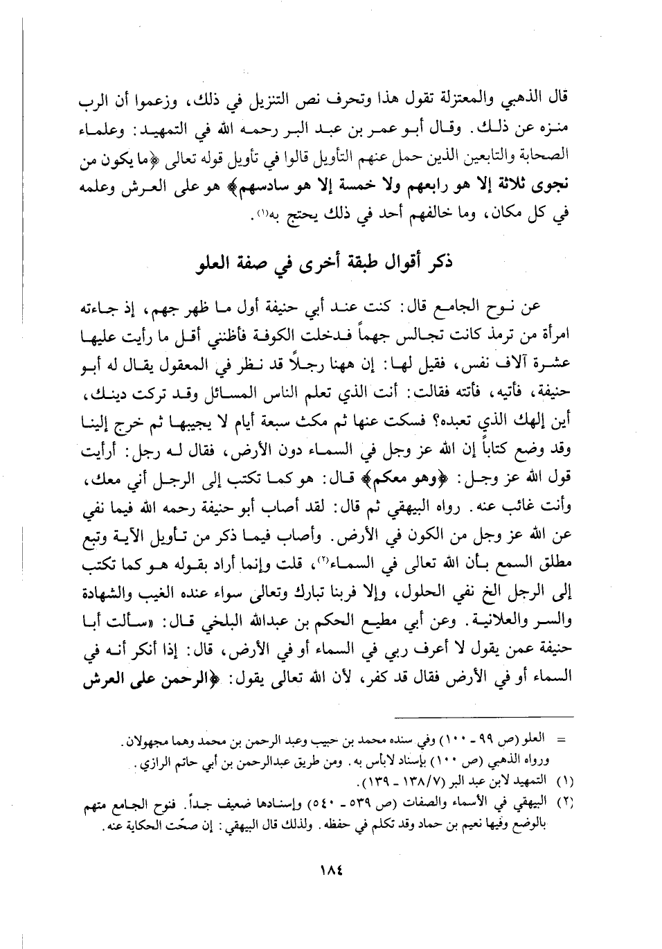 قَالَ الذَّهَبِيُّ: وَالْمُعْتَزِلَةُ تَقُولُ هَذَا وَتُحَرِّفُ نَصَّ التَّنْزِيلِ فِي ذَلِكَ, وَزَعَمُوا أَنَّ الرَّبَّ مُنَزَّهٌ عَنْ ذَلِكَ. وَقَالَ أَبُو عُمَرَ بْنُ عَبْدِ الْبَرِّ رَحِمَهُ اللَّهُ فِي التَّمْهِيدِ: وَعُلَمَاءُ الصَّحَابَةِ وَالتَّابِعِينَ الَّذِينَ حُمِلَ عَنْهُمُ التَّأْوِيلُ قَالُوا فِي تَأْوِيلِ قَوْلِهِ تَعَالَى: {مَا يَكُونُ مِنْ نَجْوَى ثَلَاثَةٍ إِلَّا هُوَ رَابِعُهُمْ وَلَا خَمْسَةٍ إِلَّا هُوَ سَادِسُهُمْ} هُوَ عَلَى الْعَرْشِ وَعِلْمُهُ فِي كُلِّ مَكَانٍ, وَمَا خَالَفَهُمْ أَحَدٌ فِي ذَلِكَ يُحْتَجُّ بِهِ1.